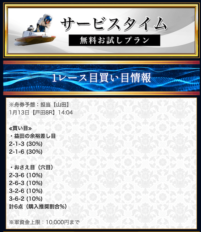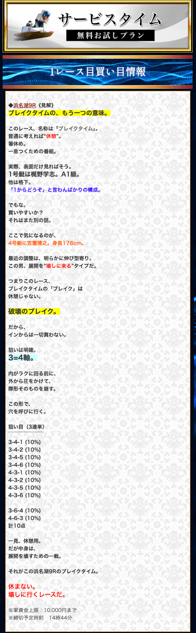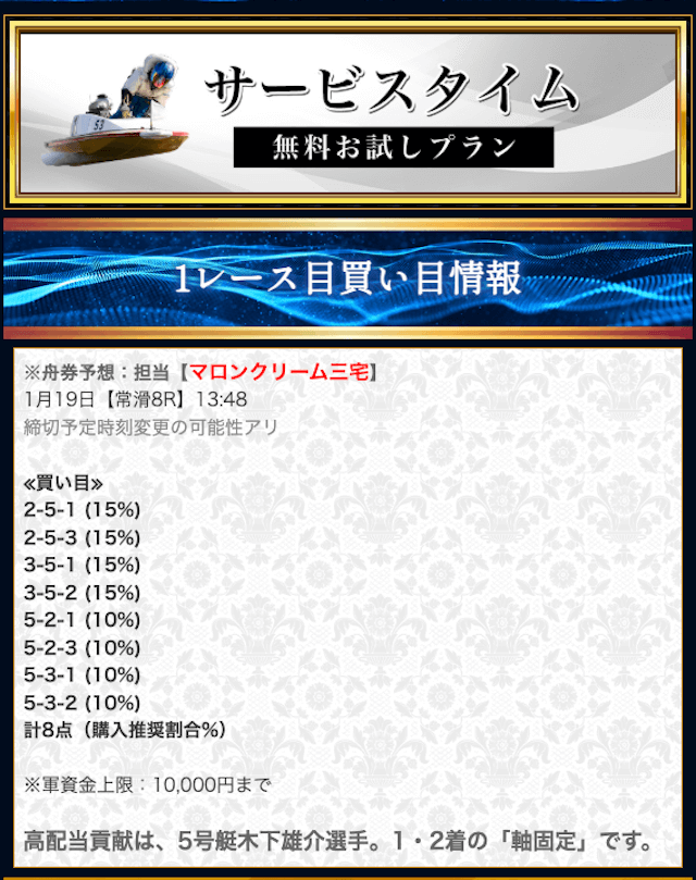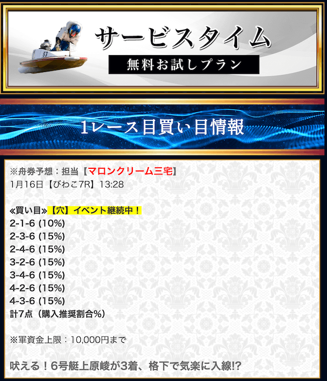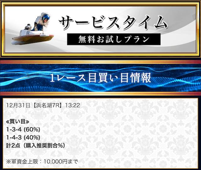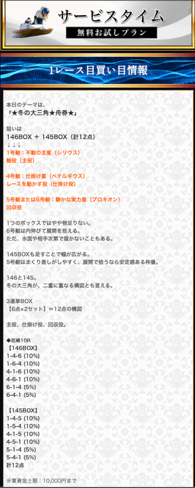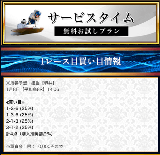 - 無料の精度はイマイチ。だから初有料参加も期待せずにやったら2レース目が当たった。点数4点でピンポイントだったしイケてるかも。+5万円ほどになったので悪くはなかった。ここなら成功させてくれるかもね・・・俺の人生変えてくれるかもね・・・とりま続けてみます。投稿日:2022/11/25