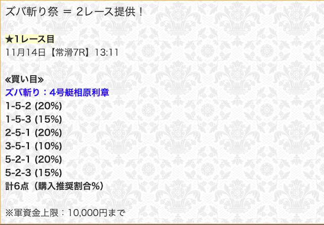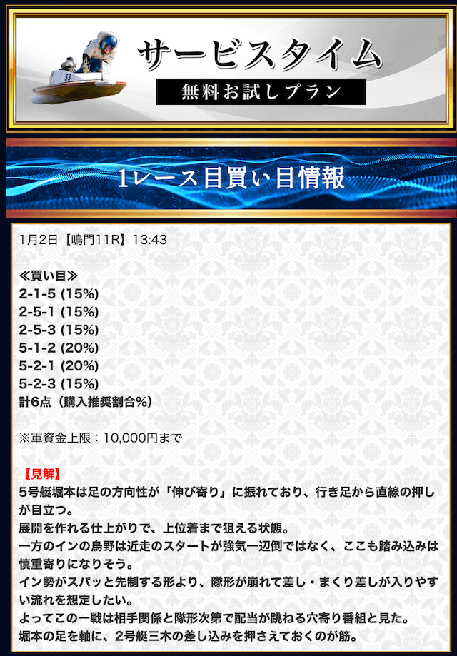 匿名レースによって狙い方が異なるのが魅力かな・・。ガチガチの決着を当てたり、万舟を狙ったりと、もはや無料予想としての次元を超えている気がする!投稿日:2025/06/21