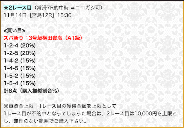 | 2022/11/9 輝き 情報料金+舟券代 50,000円+20,000円 |