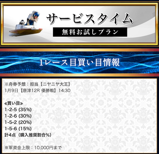 - 無料予想には大変満足しています!たまに買い目みて、これはきついみたいな。指定どおり買いたくない日はあるんですけど、当たる日の方が多くて。特に良い配当がつくレースを狙ってるから実力はありますね!!投稿日:2022/07/08