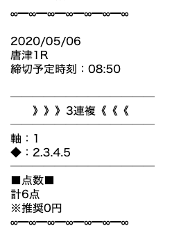 券種は②を軸にした3連複で購入点数は6点。