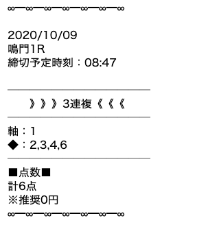 | 10/9 鳴門1R | ❌ | -6,000円 | ||