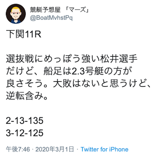 — 競艇予想屋 「マーズ」 (@BoatMvhstPq) March 1, 2020