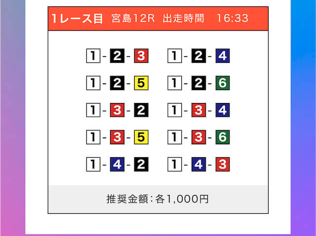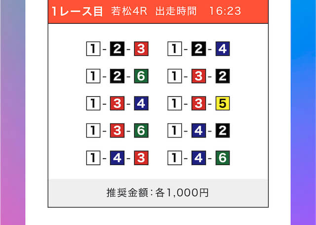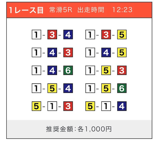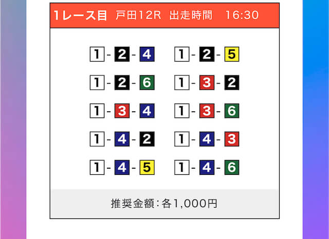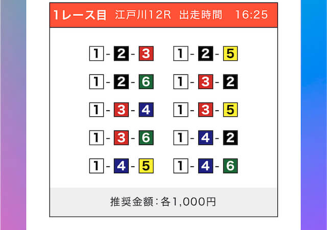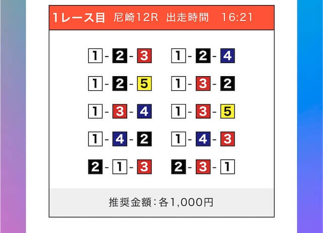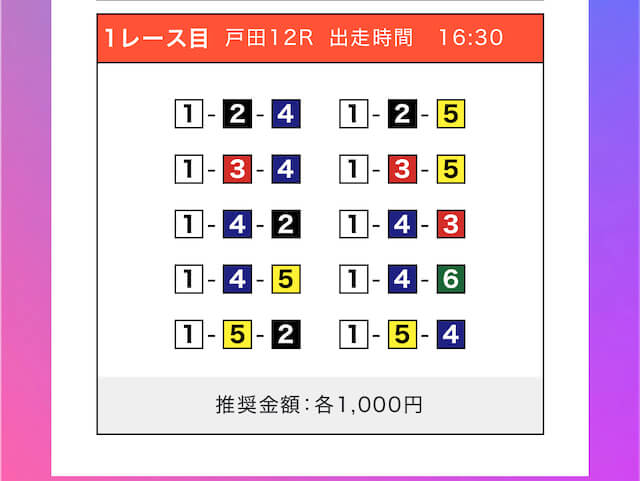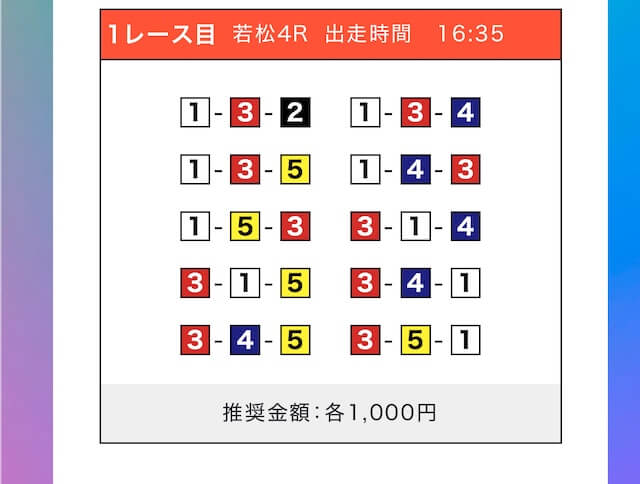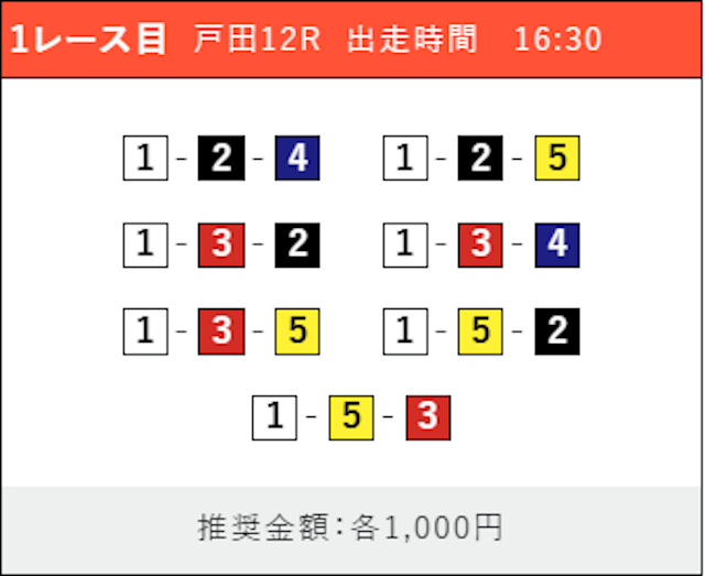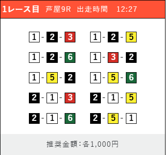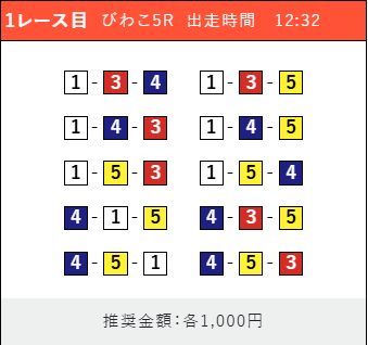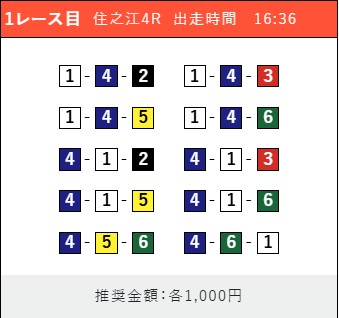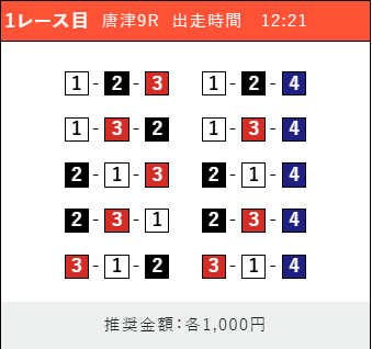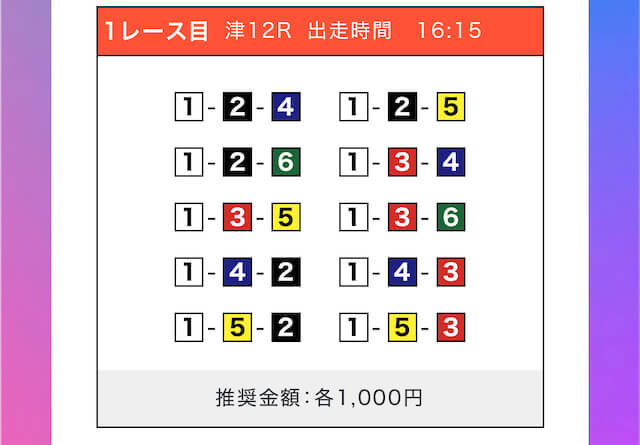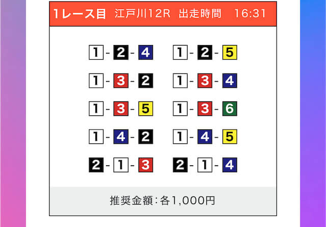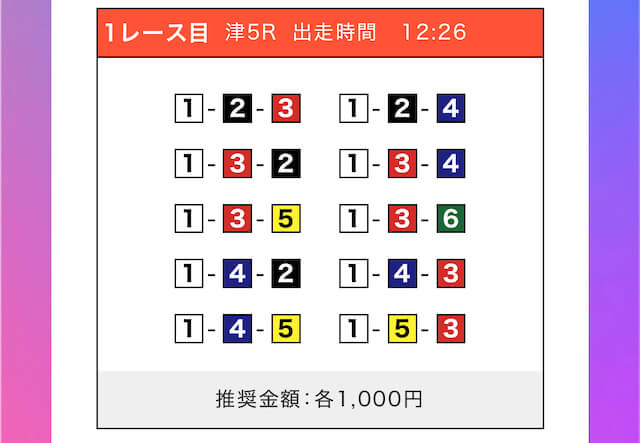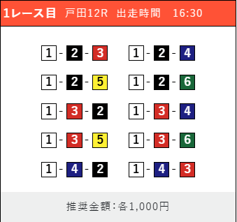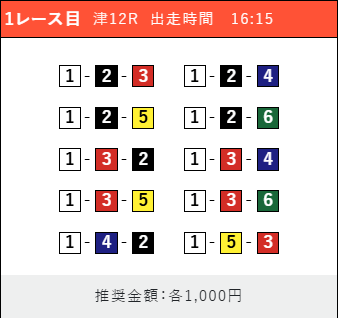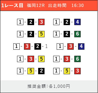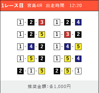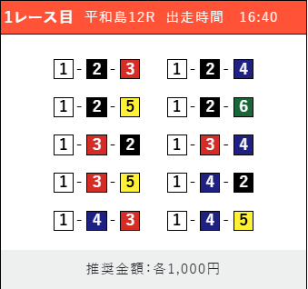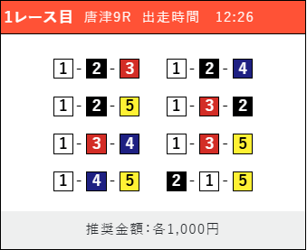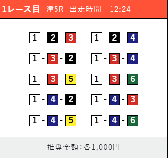 買い目は①-②-流、①-③-②④・①-④-②③⑤と、内枠を信頼しています。