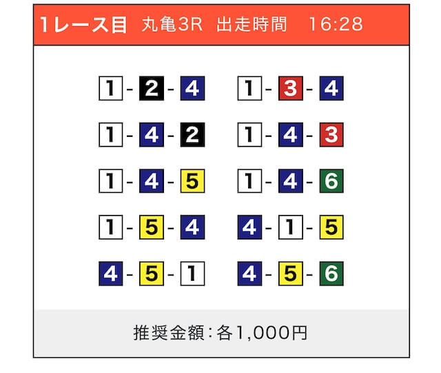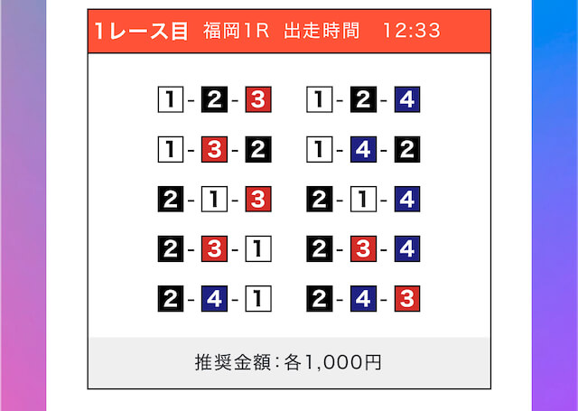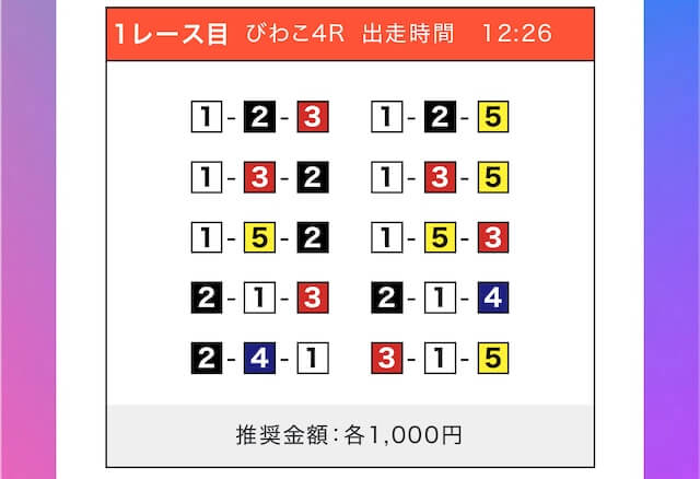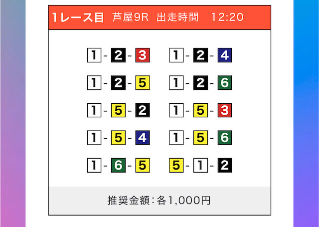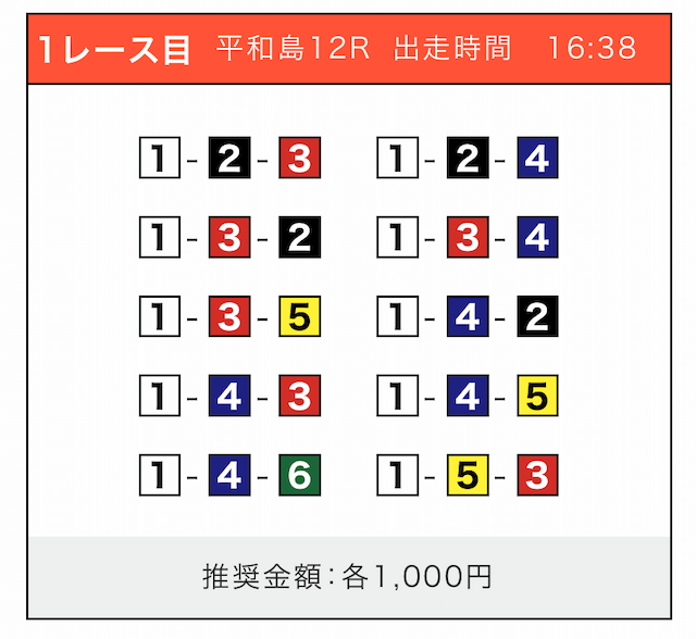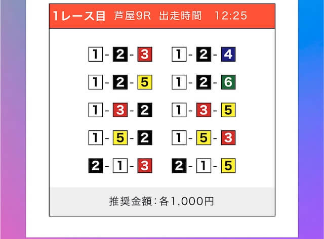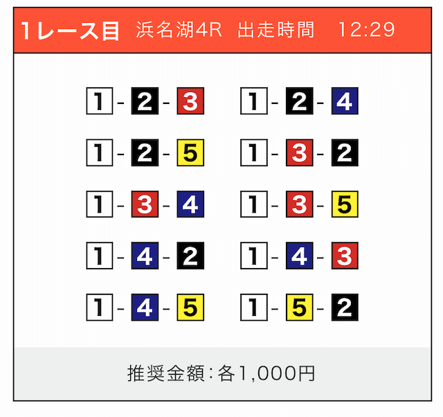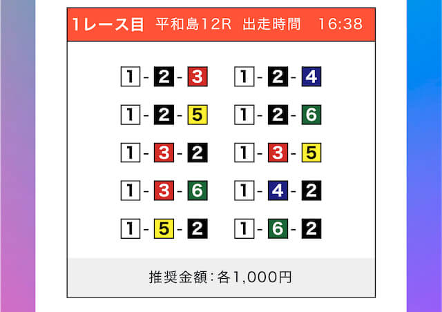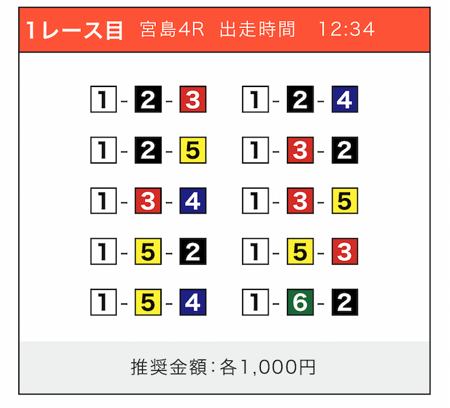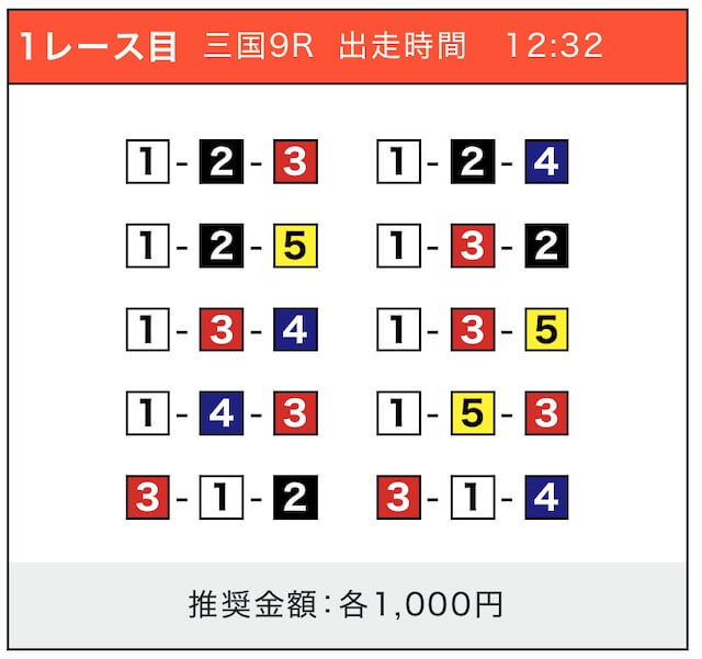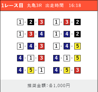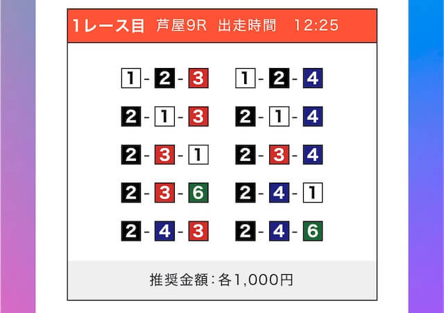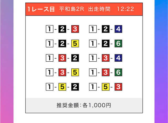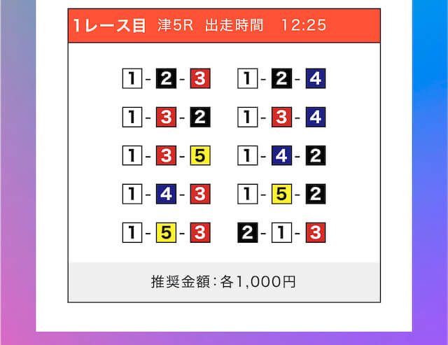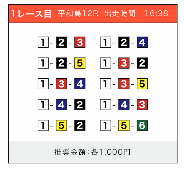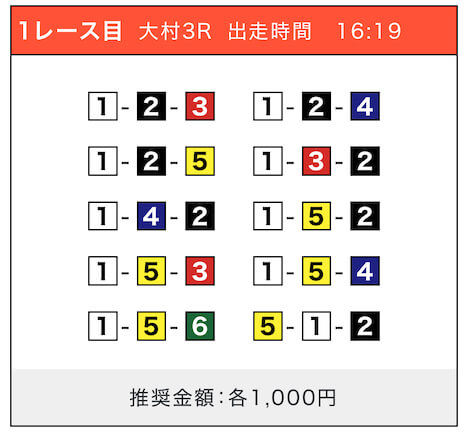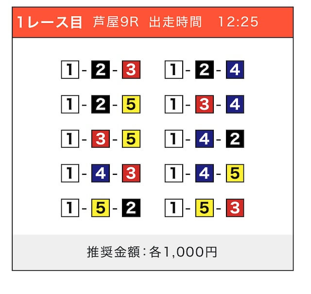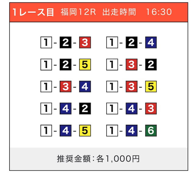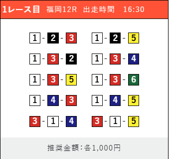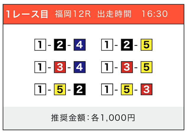 対象は福岡2Rで、買い目は①⑤号艇を軸に②③④号艇を絡める組み合わせ。
