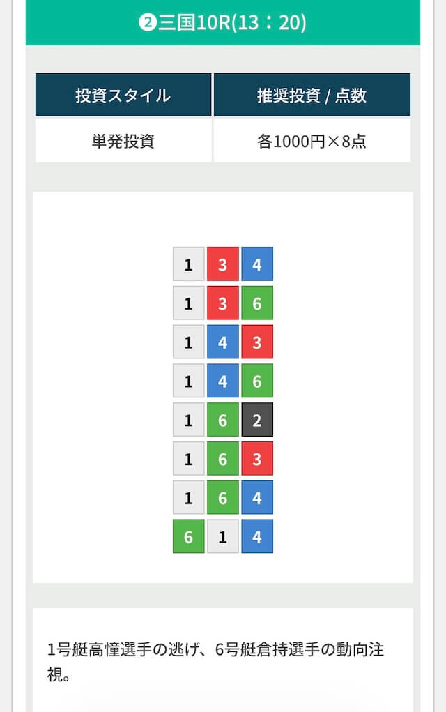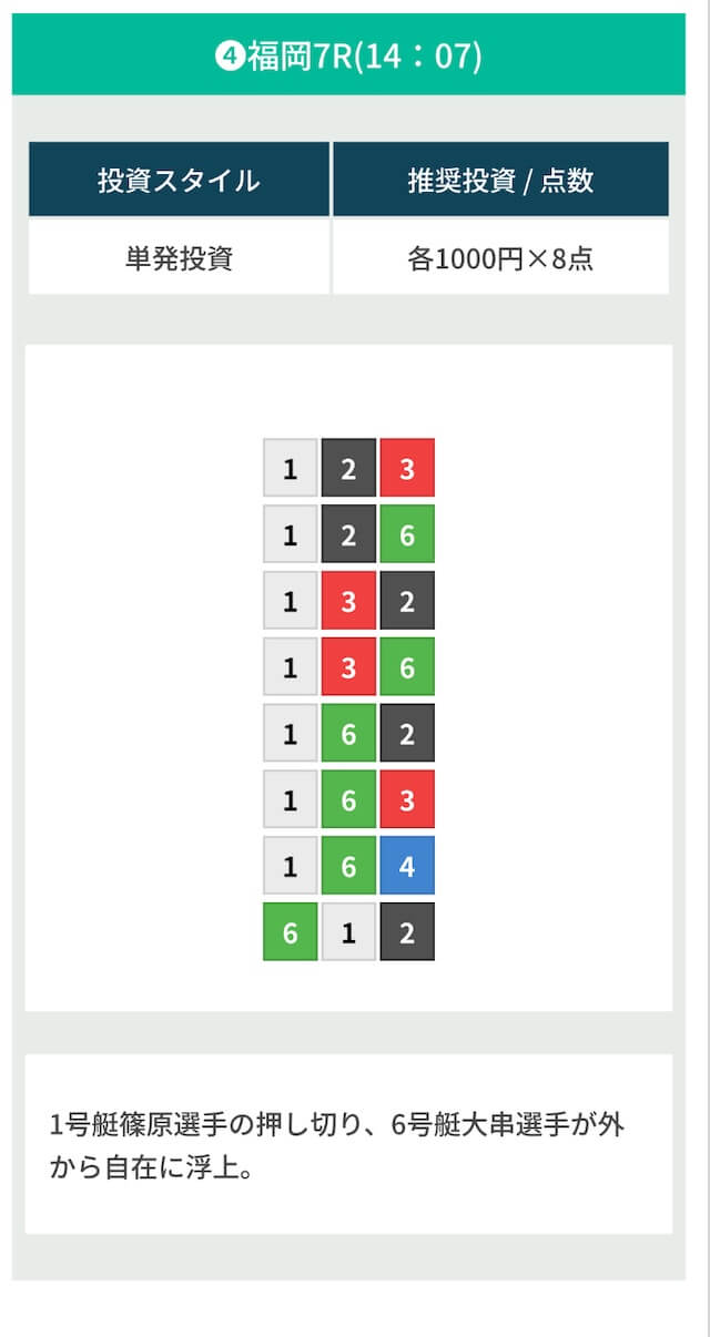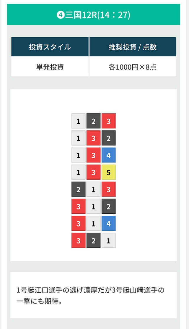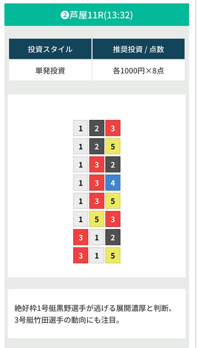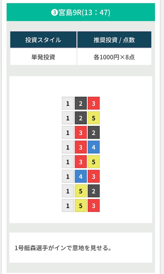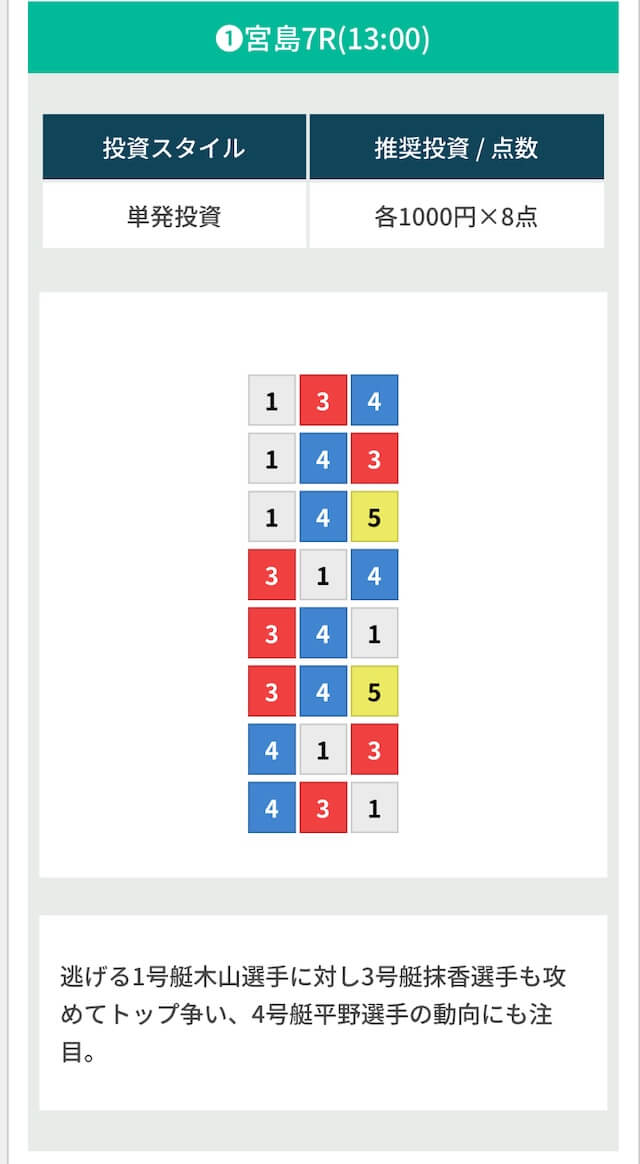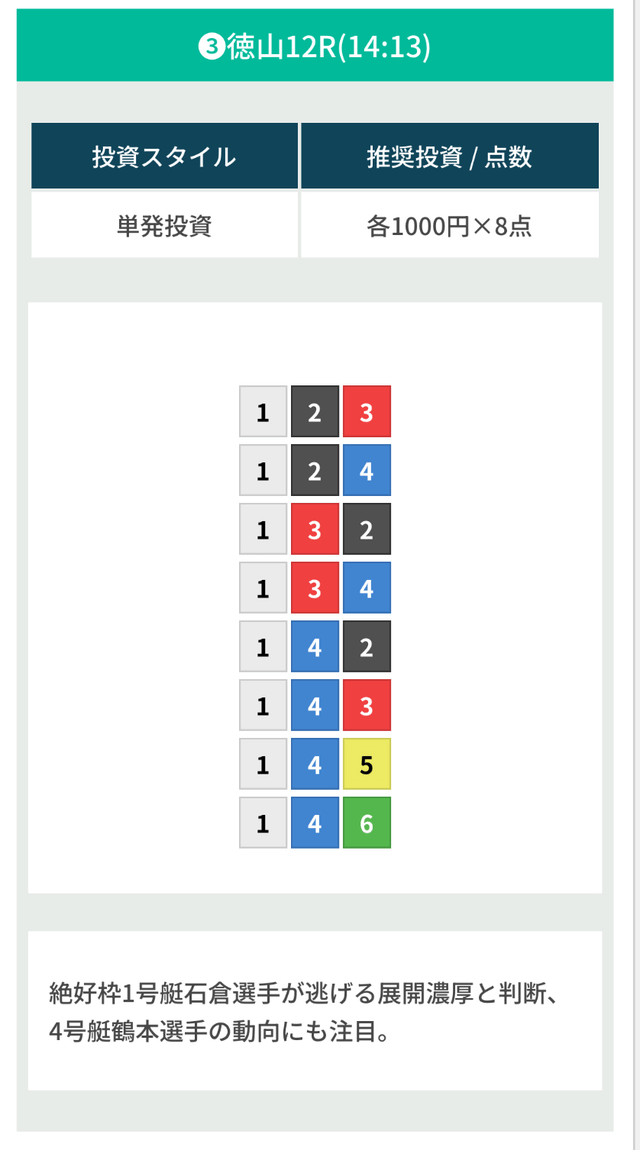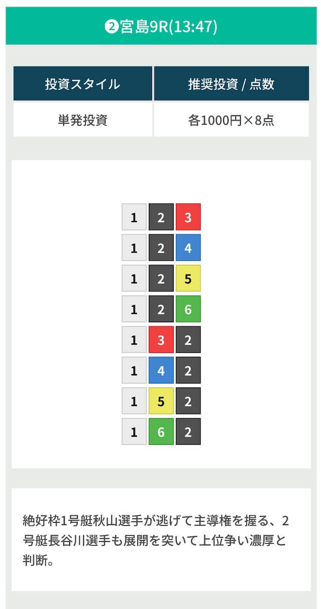 基本的に、1・2着は内枠と実力者、3着は展開・モーター・スタートなんかを総合的に見て選定している。幅広いパターンをカバーしてるから、ガチガチの鉄板から波乱の展開まで対応してるってワケだな。しかも、買い目には「なぜそうなるか」って根拠が書かれているから、勉強になると思うぞ。