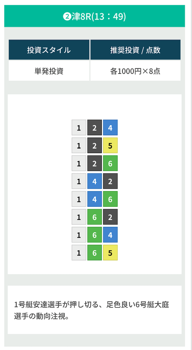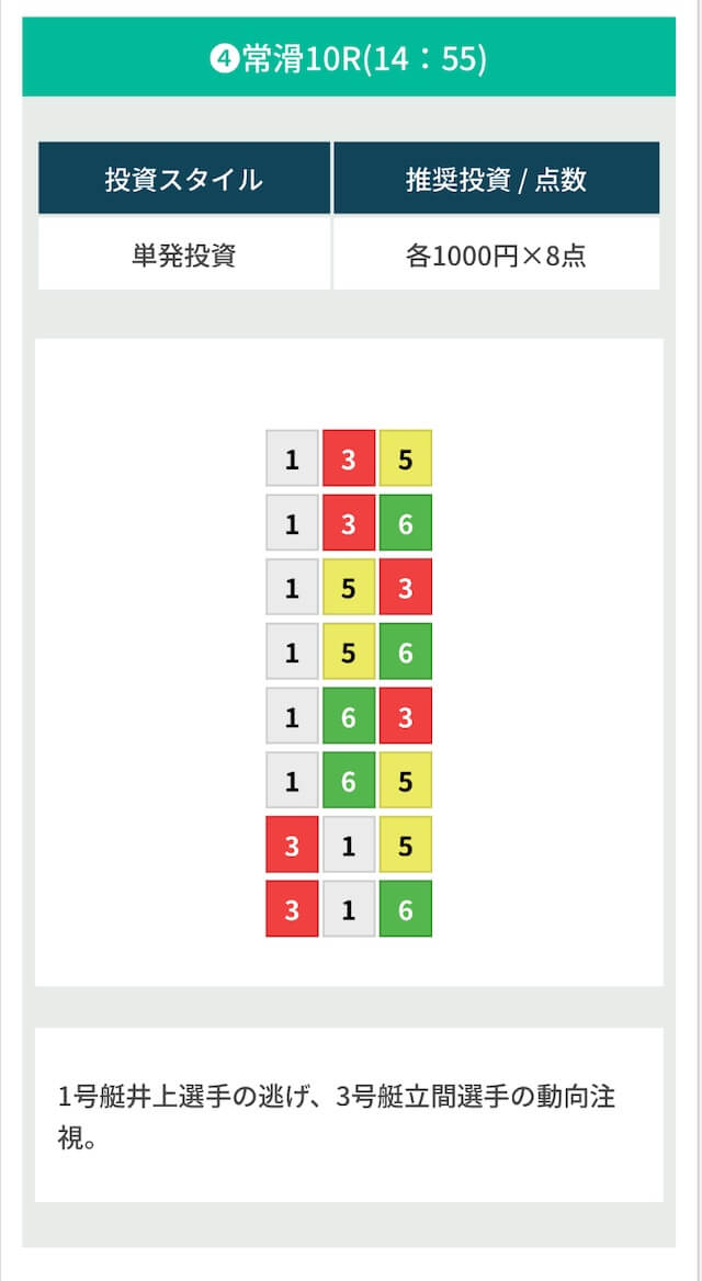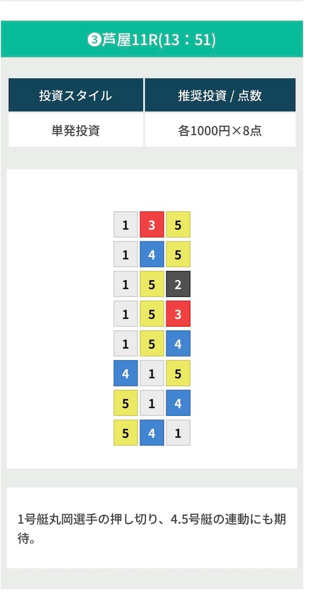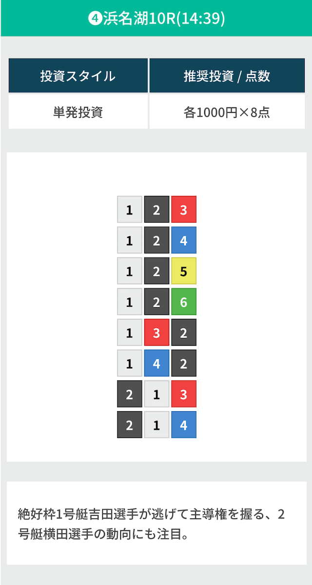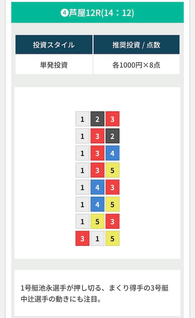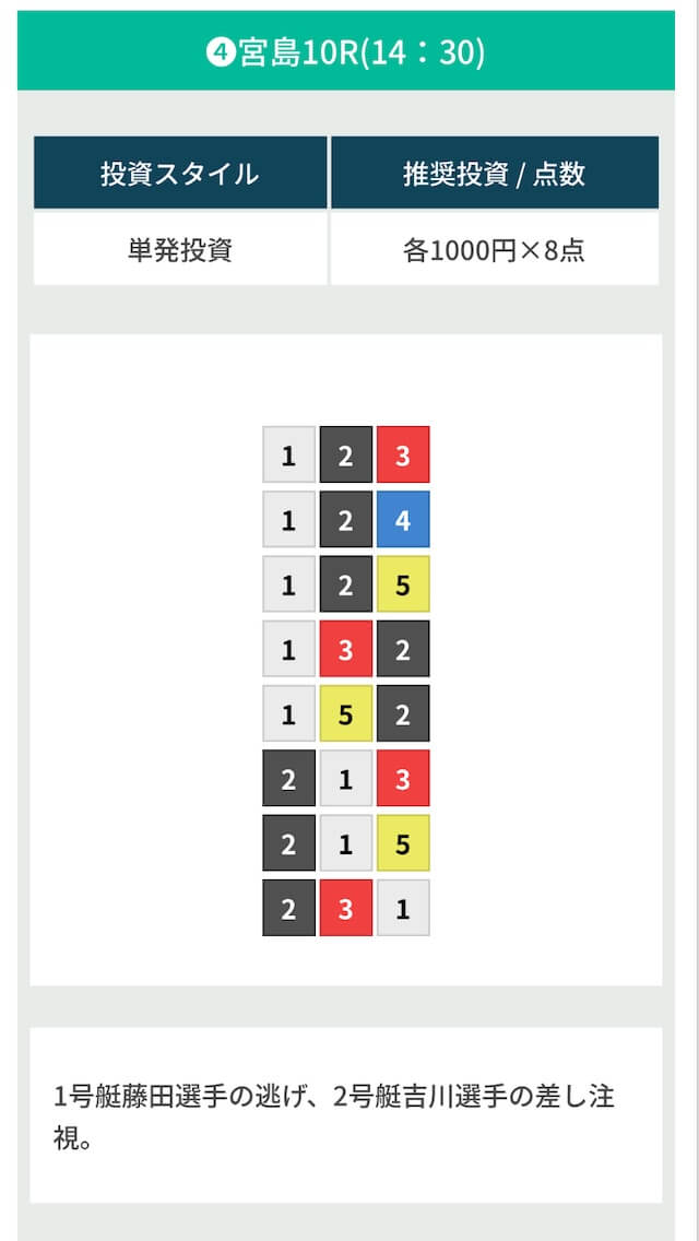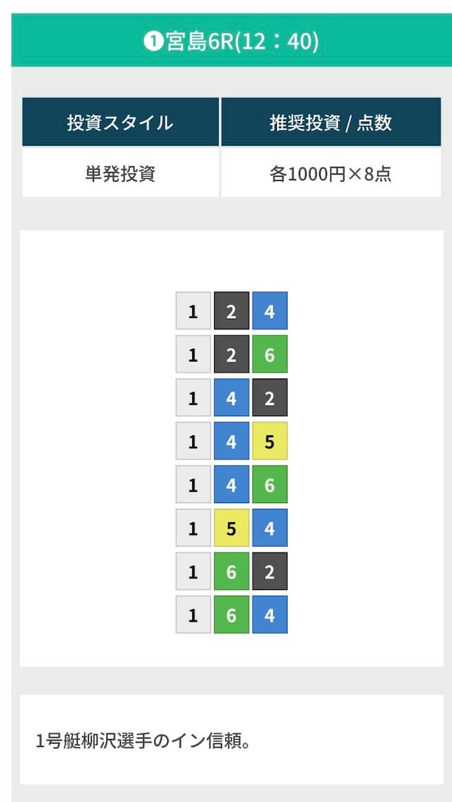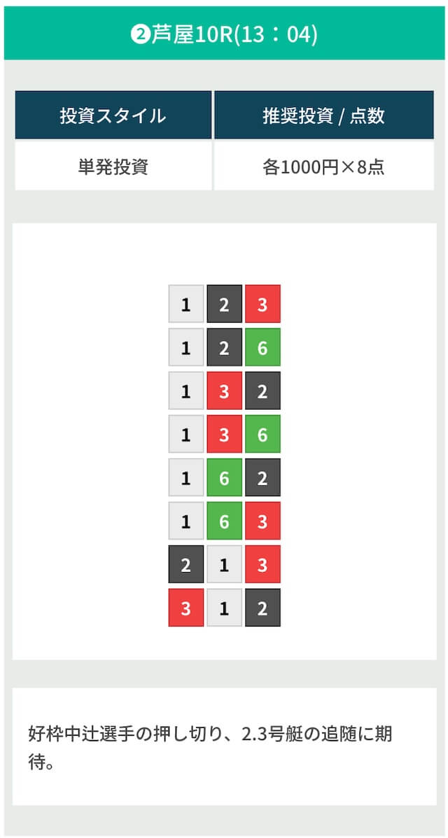 基本的に、1・2着は内枠と実力者、3着は展開・モーター・スタートなんかを総合的に見て選定している。幅広いパターンをカバーしてるから、ガチガチの鉄板から波乱の展開まで対応してるってワケだな。しかも、買い目には「なぜそうなるか」って根拠が書かれているから、勉強になると思うぞ。