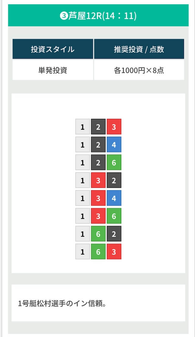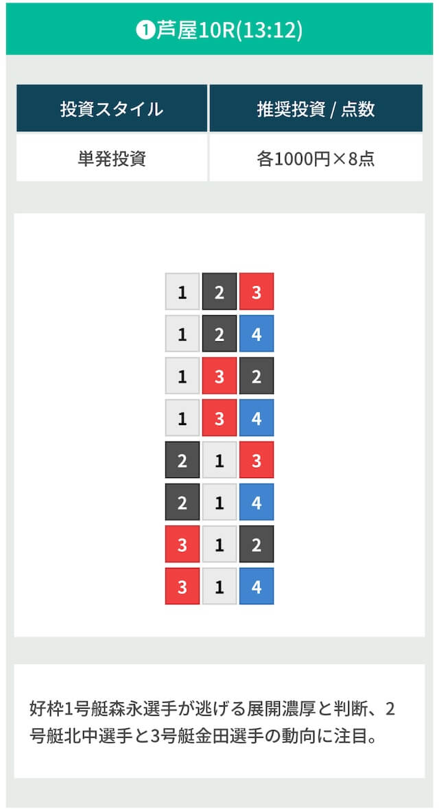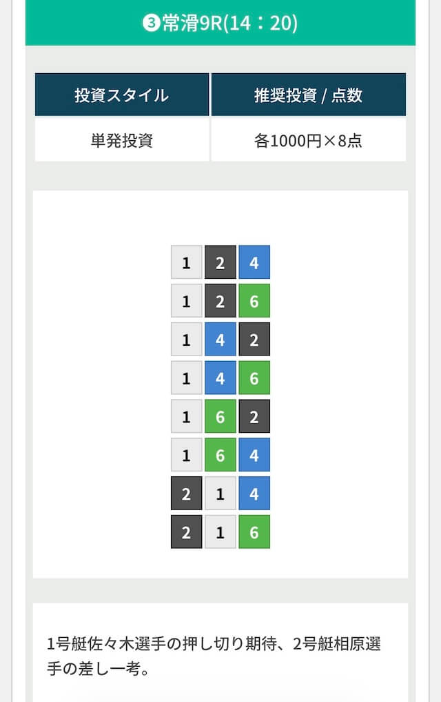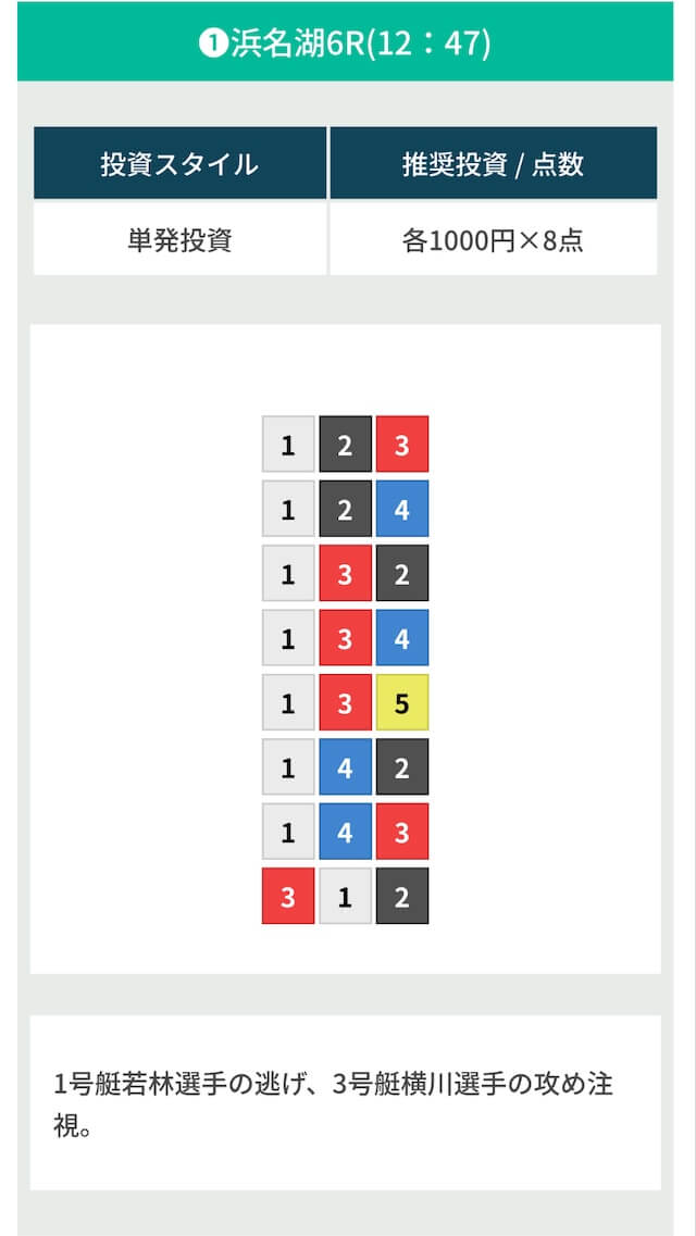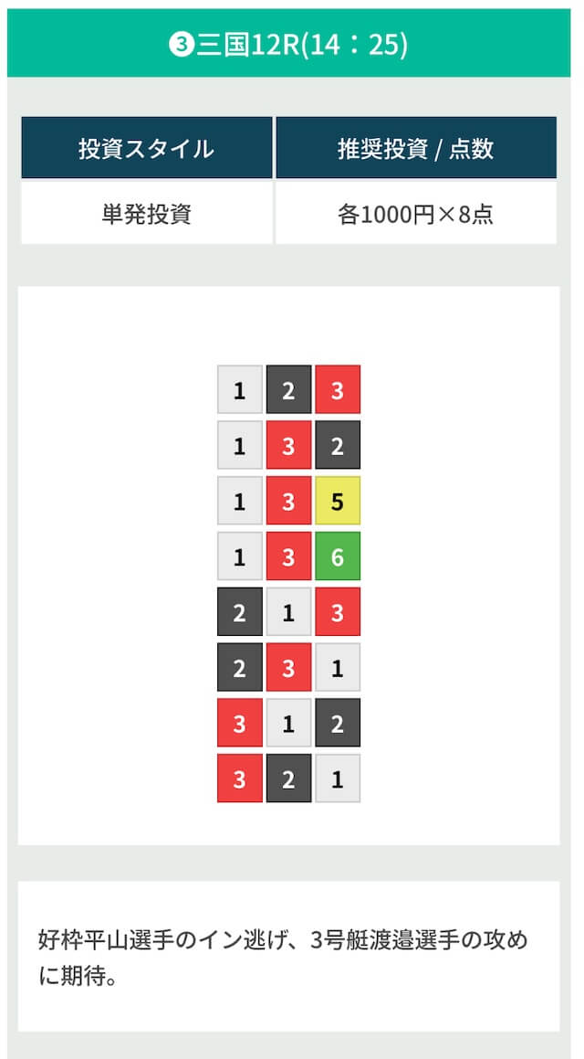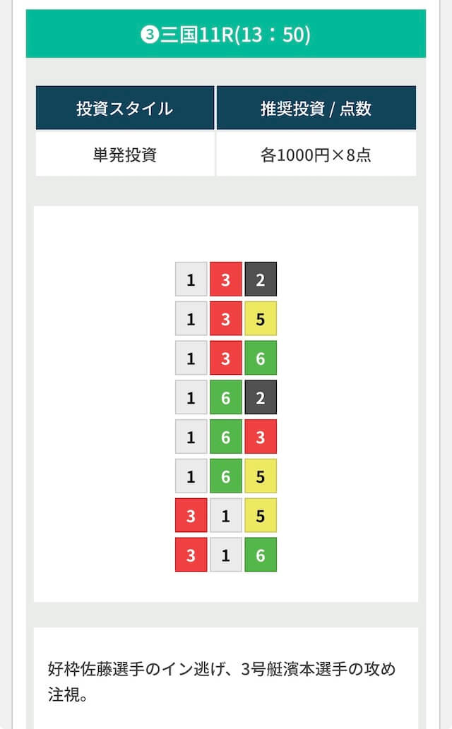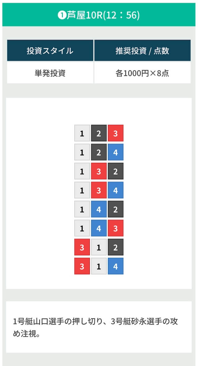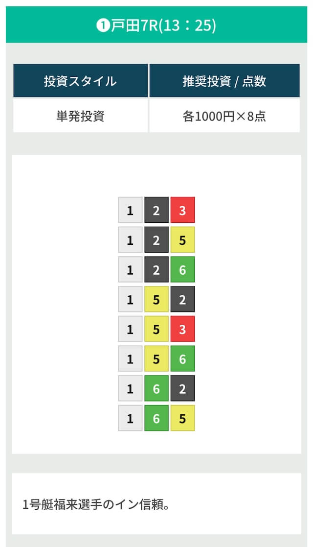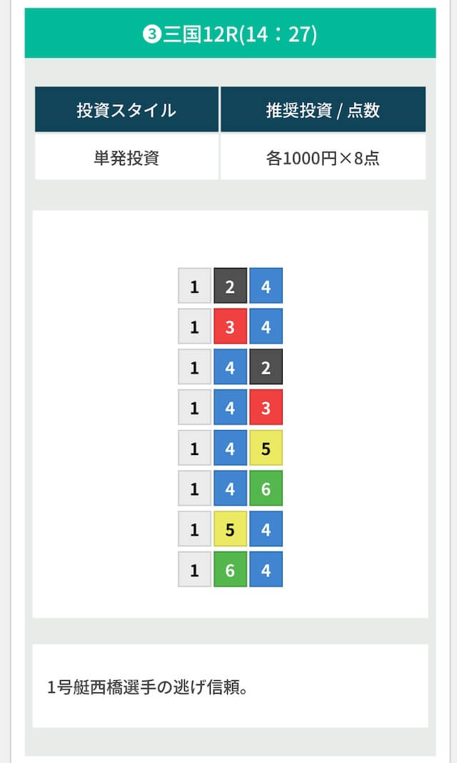 基本的に、1・2着は内枠と実力者、3着は展開・モーター・スタートなんかを総合的に見て選定している。幅広いパターンをカバーしてるから、ガチガチの鉄板から波乱の展開まで対応してるってワケだな。しかも、買い目には「なぜそうなるか」って根拠が書かれているから、勉強になると思うぞ。