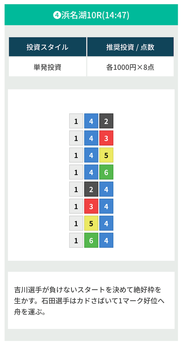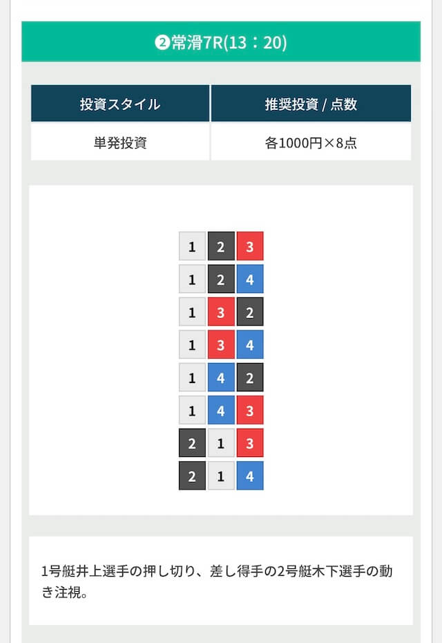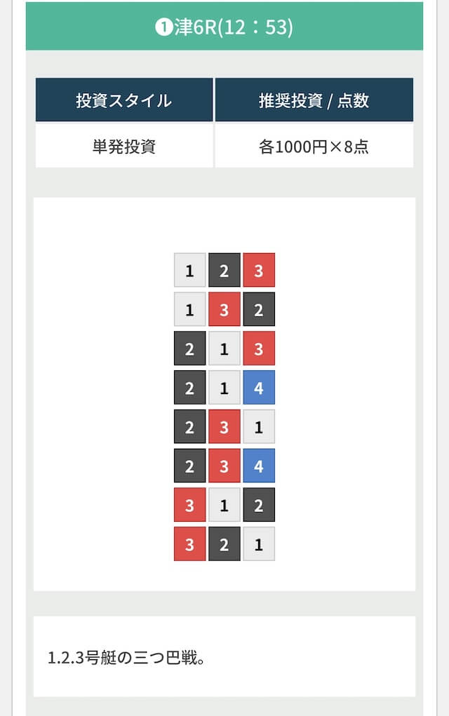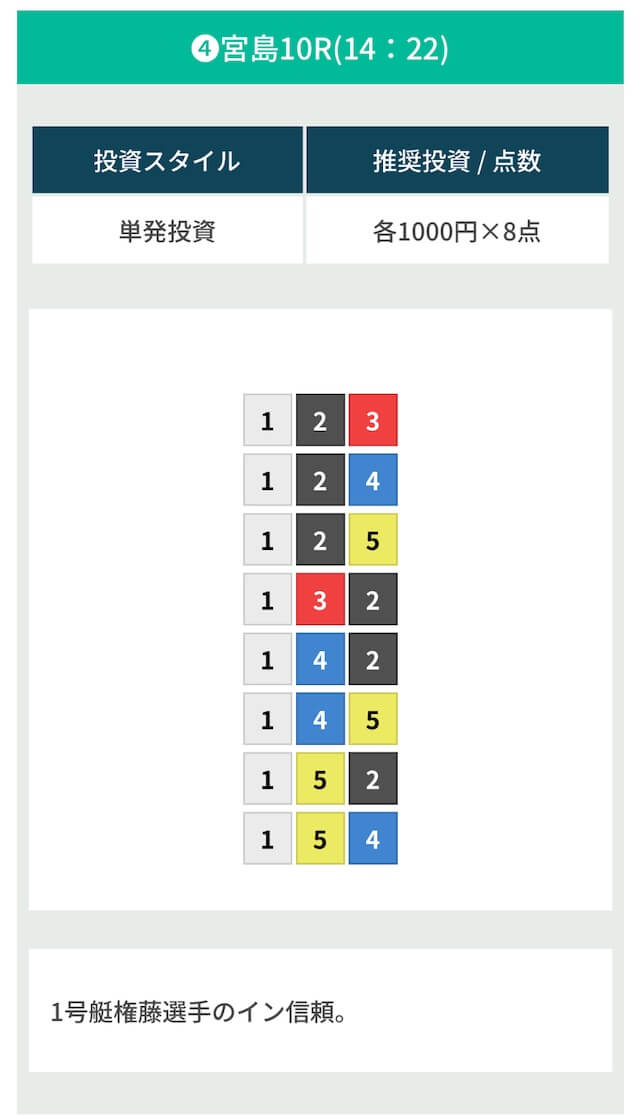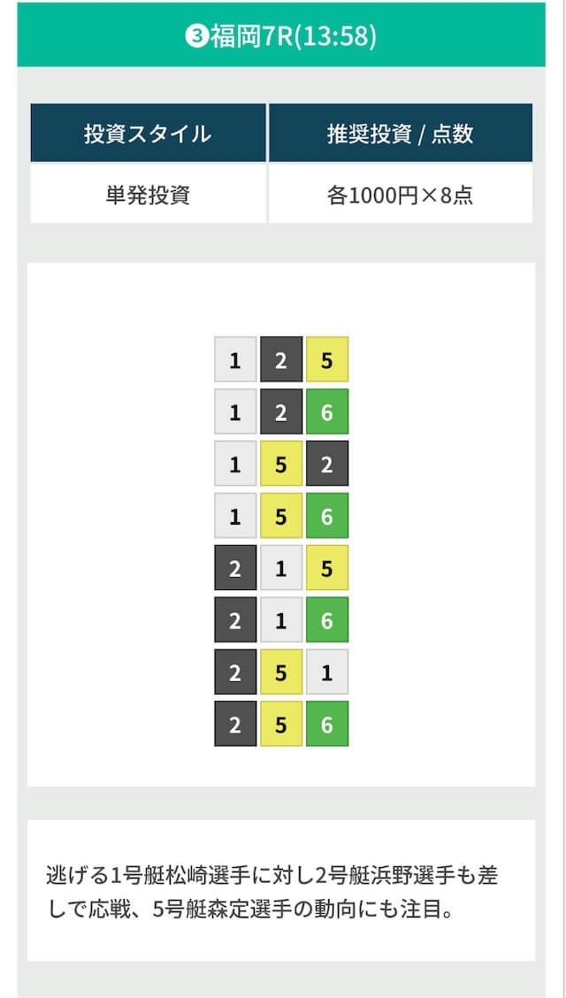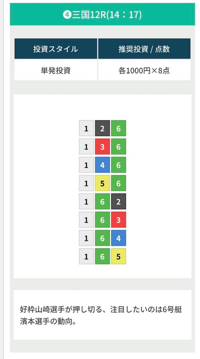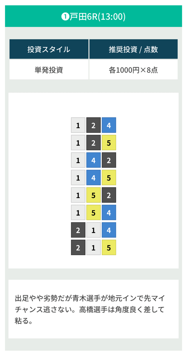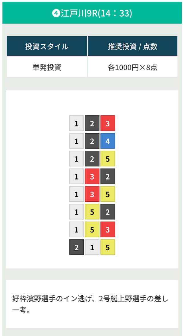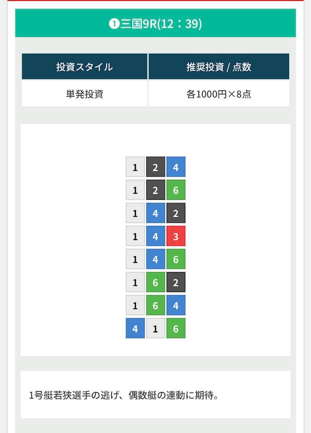 基本的に、1・2着は内枠と実力者、3着は展開・モーター・スタートなんかを総合的に見て選定している。幅広いパターンをカバーしてるから、ガチガチの鉄板から波乱の展開まで対応してるってワケだな。しかも、買い目には「なぜそうなるか」って根拠が書かれているから、勉強になると思うぞ。