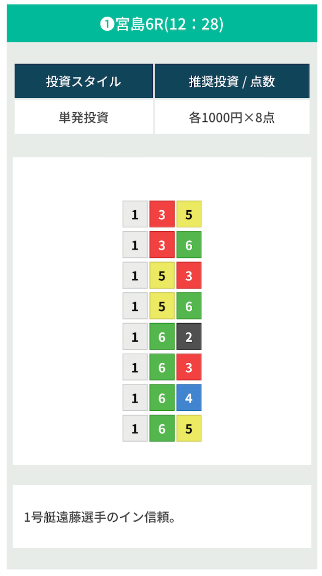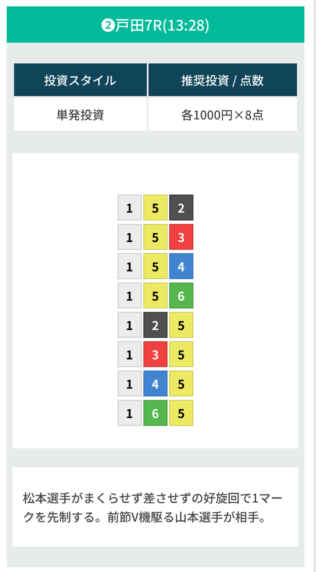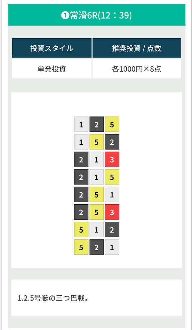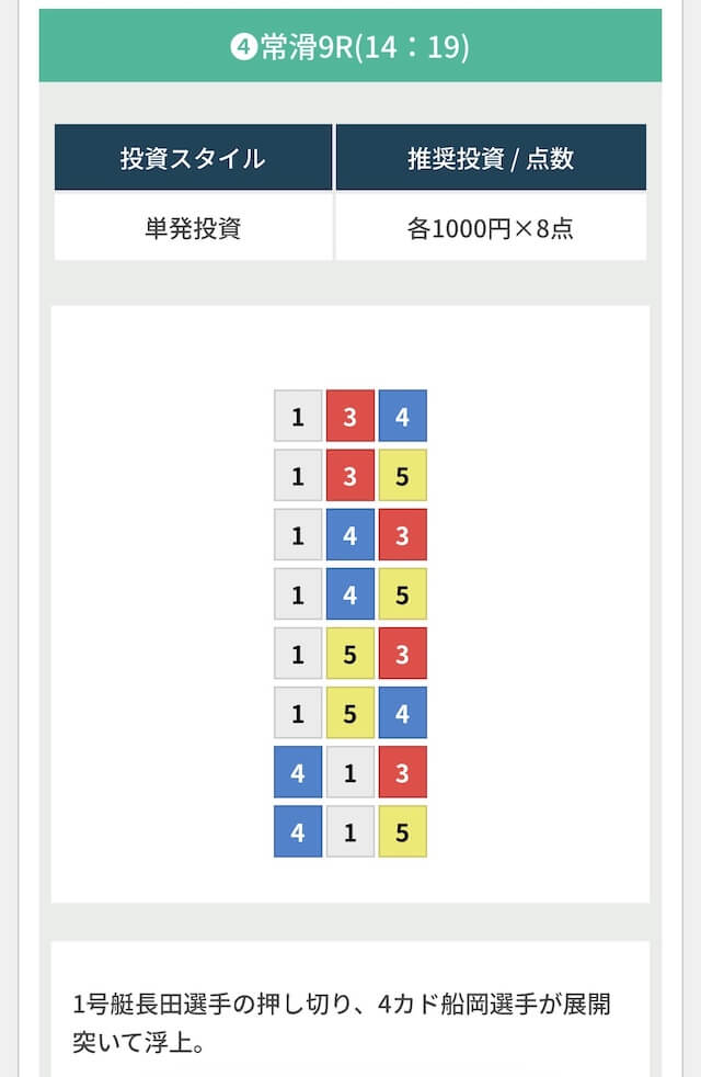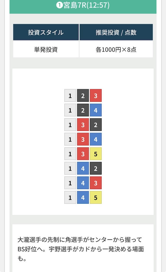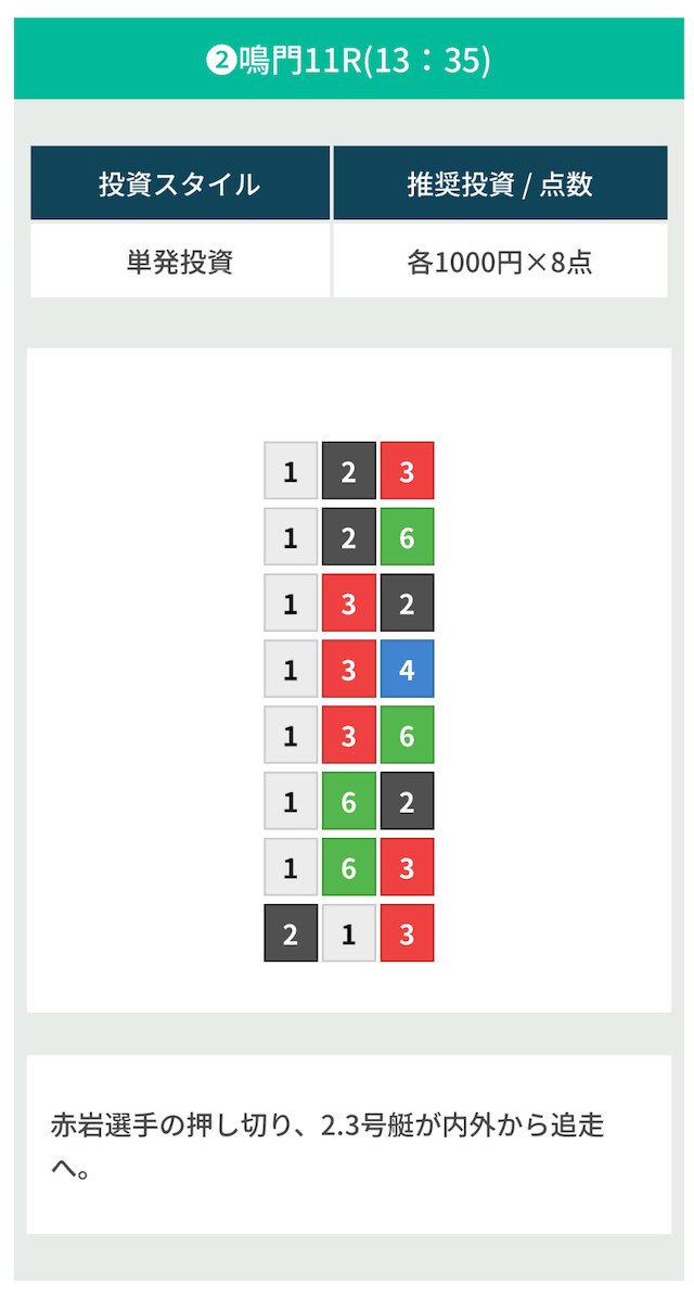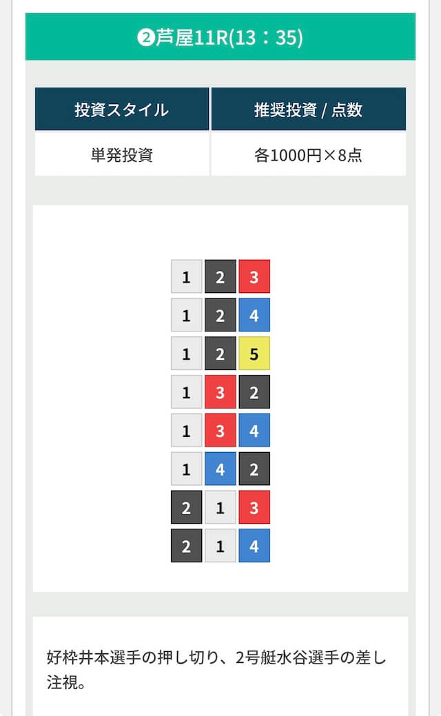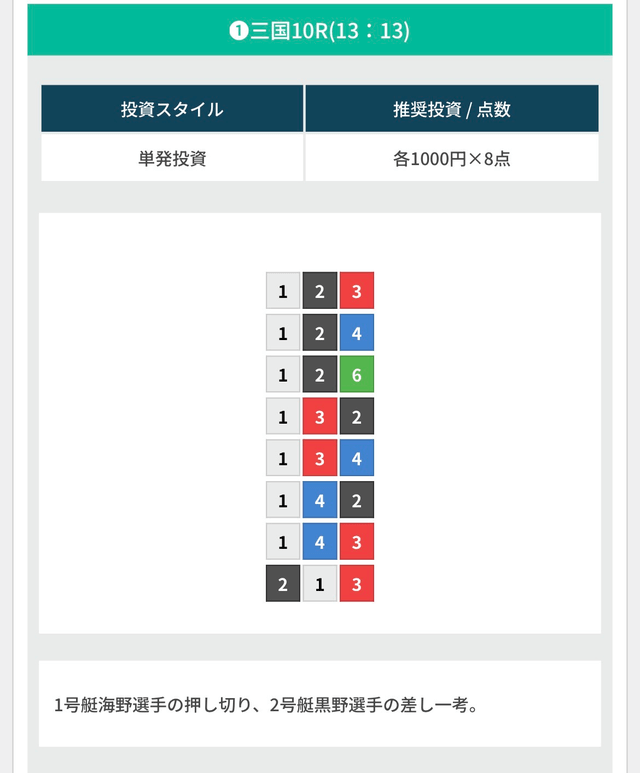 基本的に、1・2着は内枠と実力者、3着は展開・モーター・スタートなんかを総合的に見て選定している。幅広いパターンをカバーしてるから、ガチガチの鉄板から波乱の展開まで対応してるってワケだな。しかも、買い目には「なぜそうなるか」って根拠が書かれているから、勉強になると思うぞ。