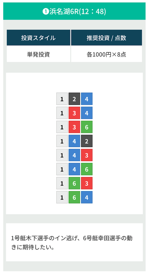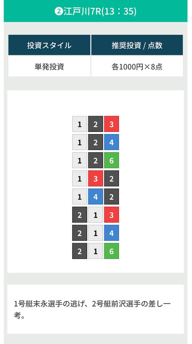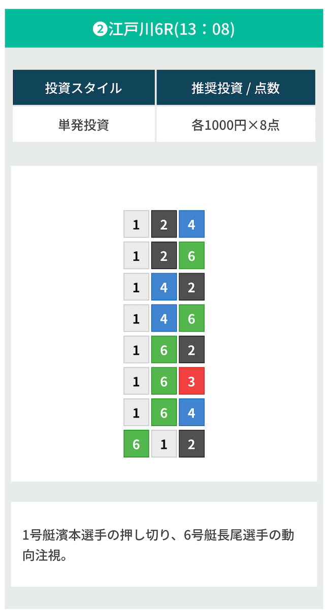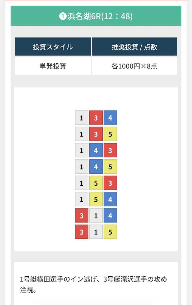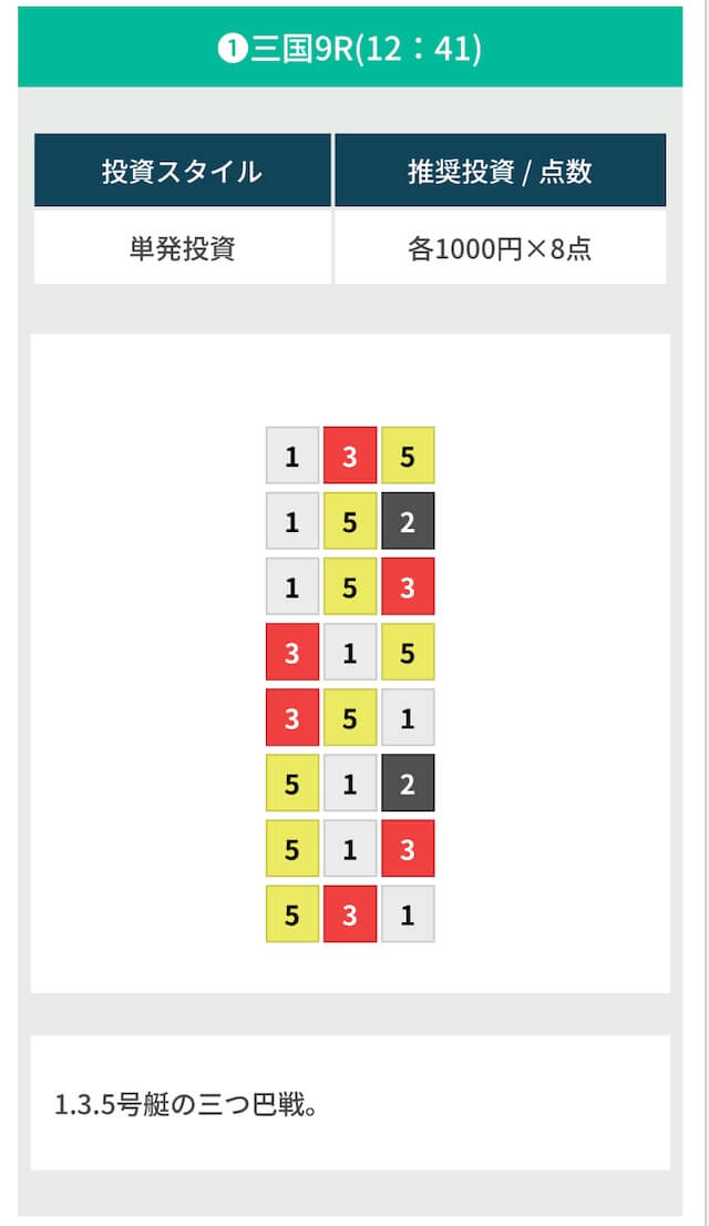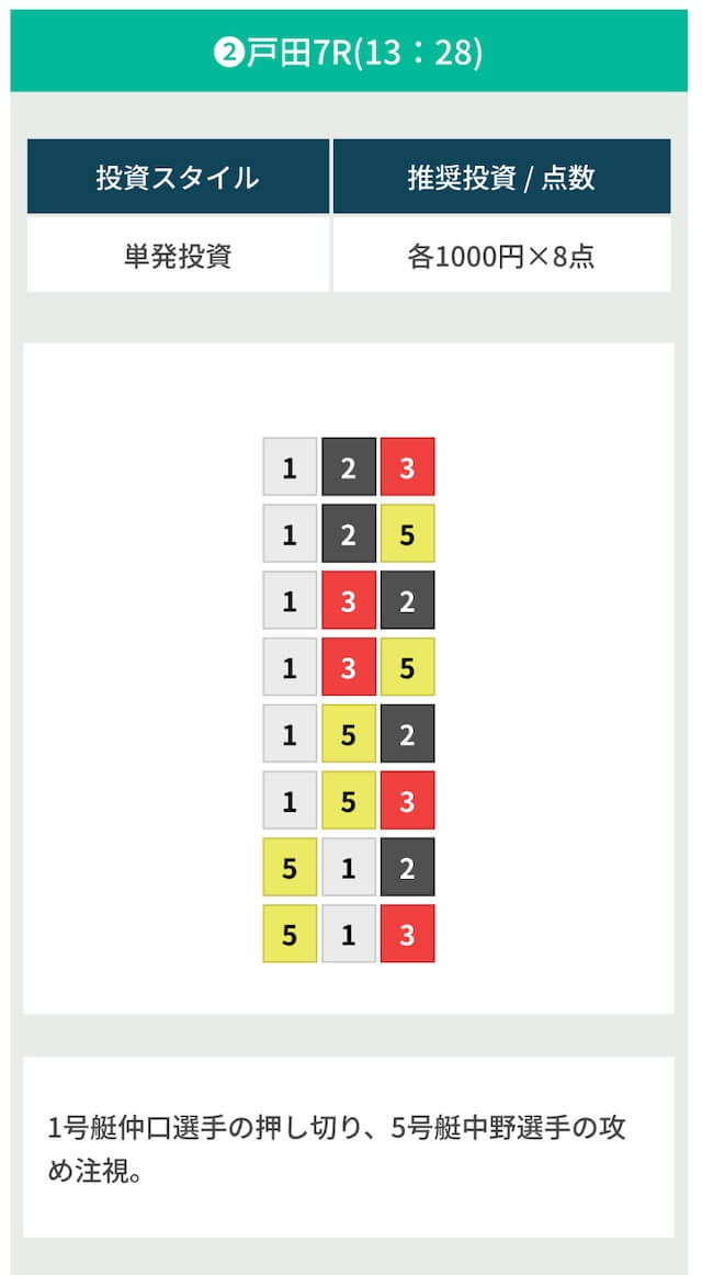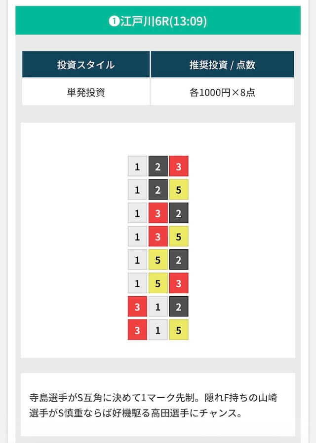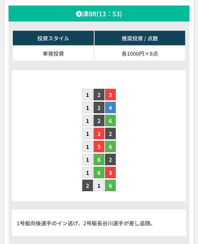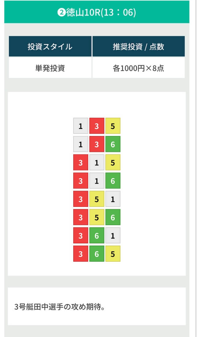 基本的に、1・2着は内枠と実力者、3着は展開・モーター・スタートなんかを総合的に見て選定している。幅広いパターンをカバーしてるから、ガチガチの鉄板から波乱の展開まで対応してるってワケだな。しかも、買い目には「なぜそうなるか」って根拠が書かれているから、勉強になると思うぞ。