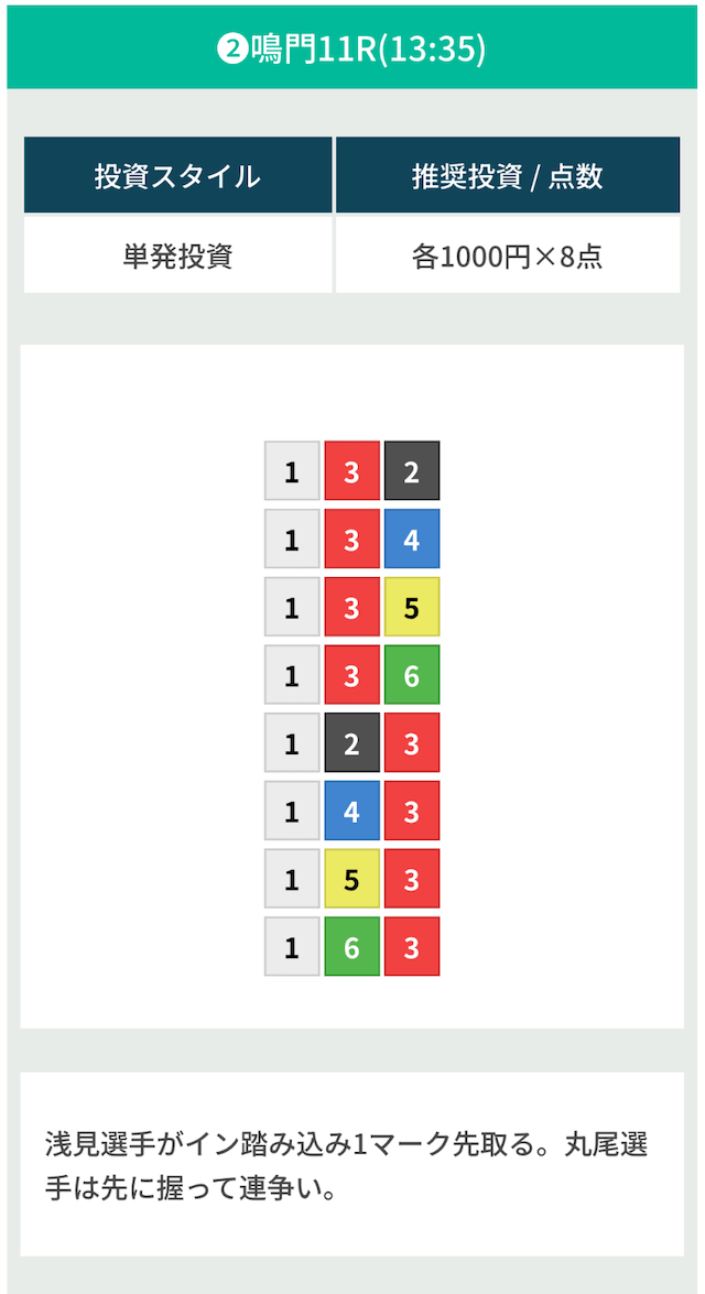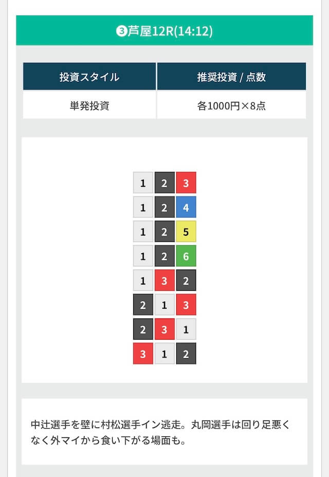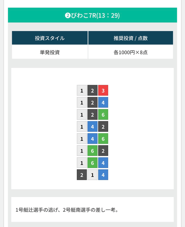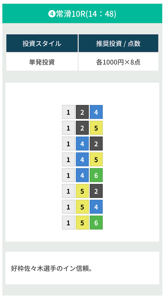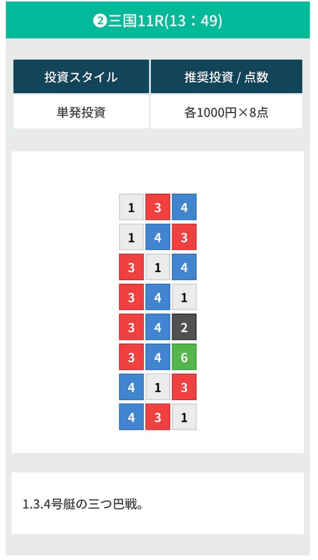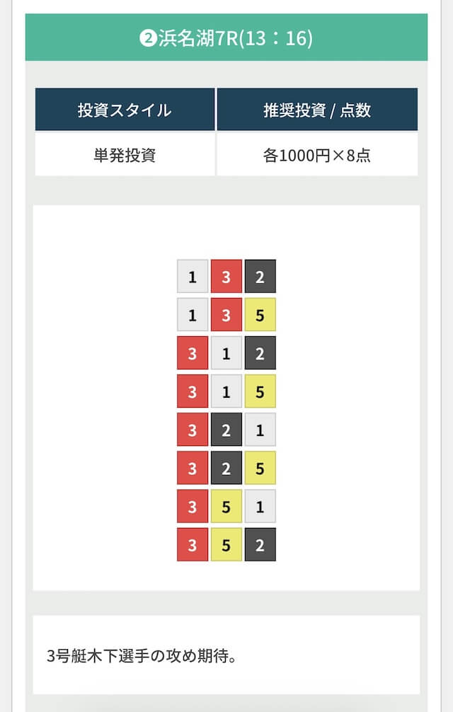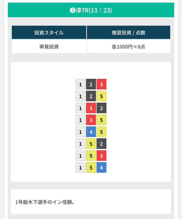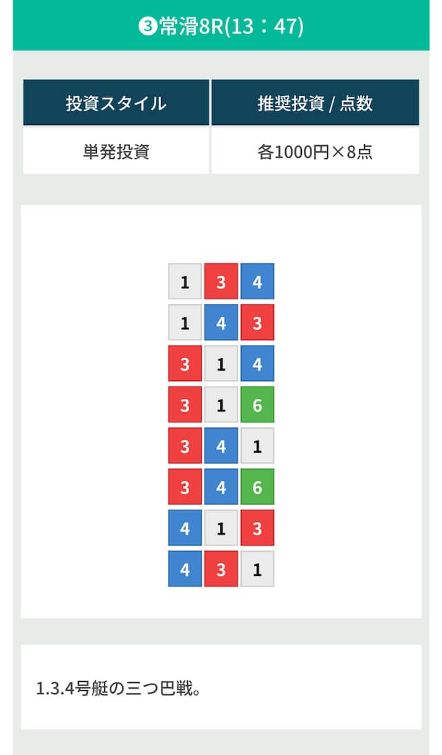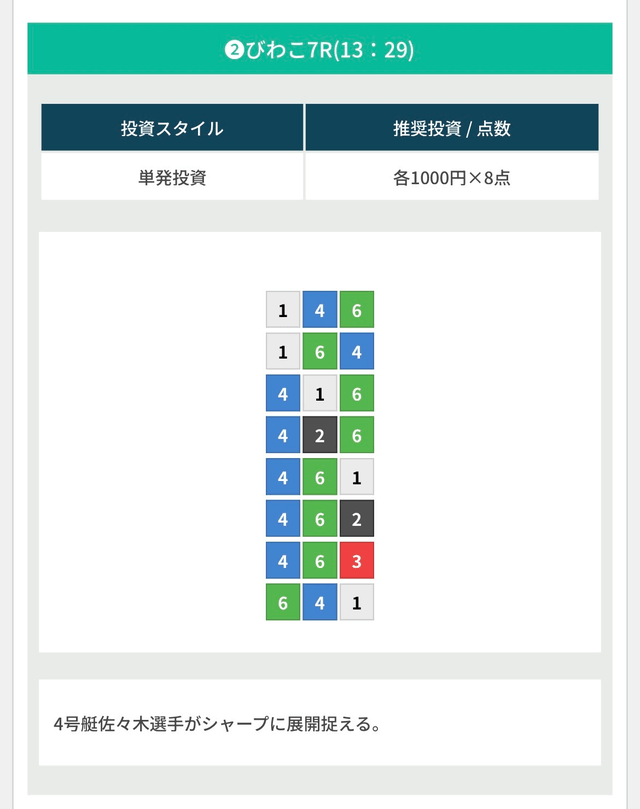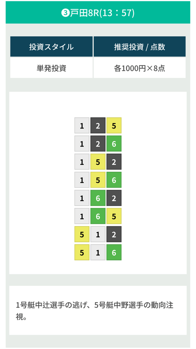 基本的に、1・2着は内枠と実力者、3着は展開・モーター・スタートなんかを総合的に見て選定している。幅広いパターンをカバーしてるから、ガチガチの鉄板から波乱の展開まで対応してるってワケだな。しかも、買い目には「なぜそうなるか」って根拠が書かれているから、勉強になると思うぞ。