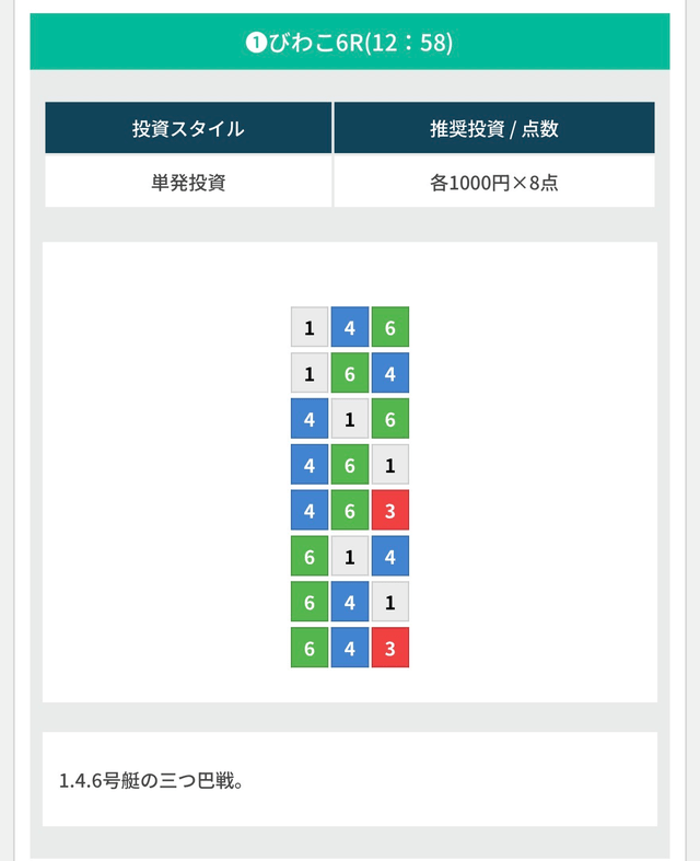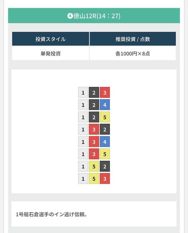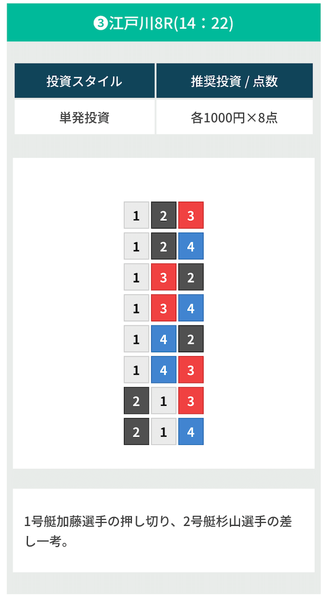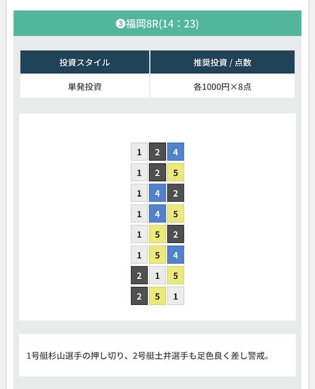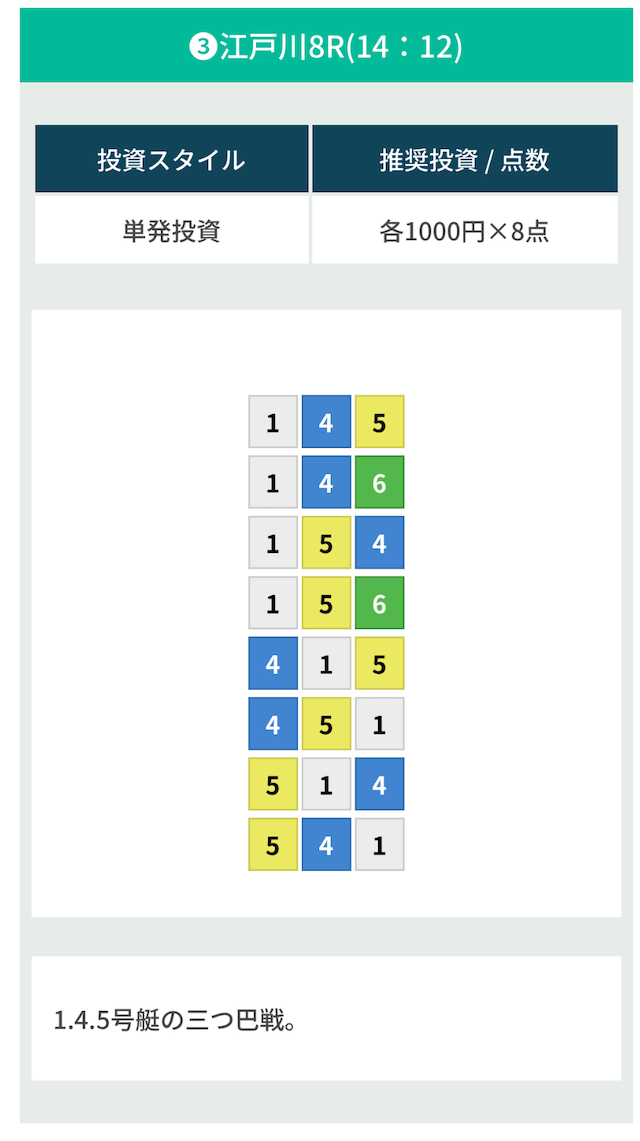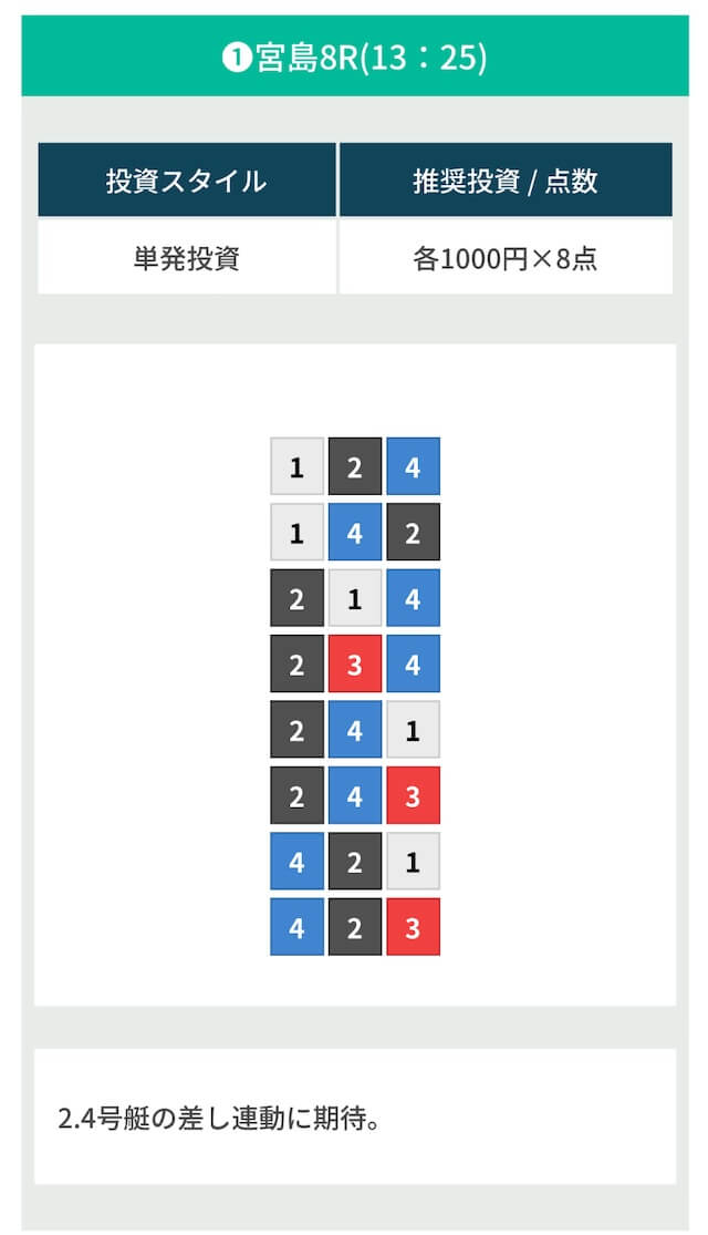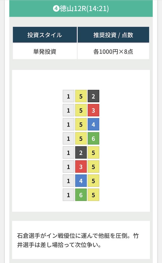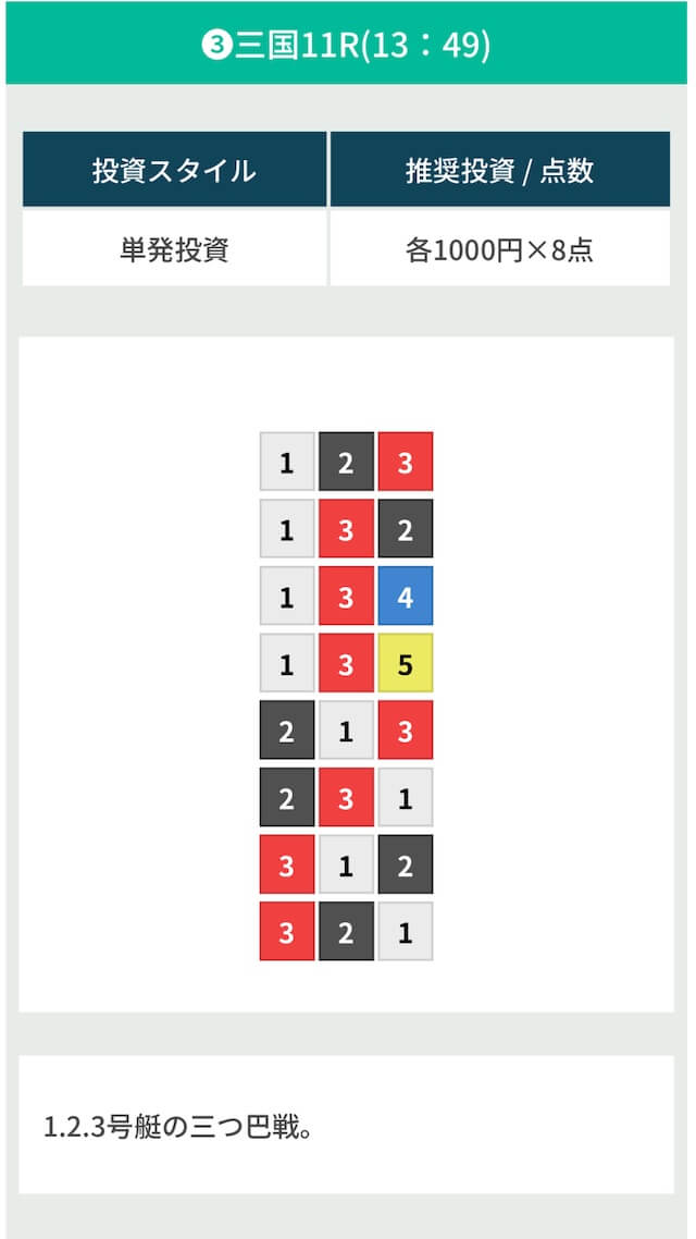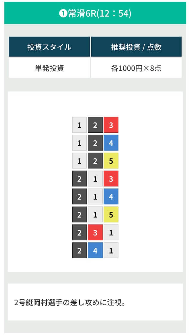 基本的に、1・2着は内枠と実力者、3着は展開・モーター・スタートなんかを総合的に見て選定している。幅広いパターンをカバーしてるから、ガチガチの鉄板から波乱の展開まで対応してるってワケだな。しかも、買い目には「なぜそうなるか」って根拠が書かれているから、勉強になると思うぞ。