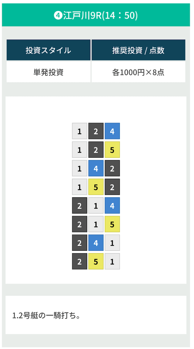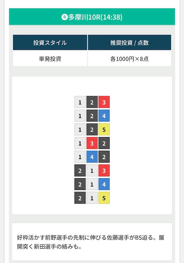 有料予想のプラン数が少ない上、情報料金が比較的高いこと。予想精度は高いので参加する価値は高いですが、ある程度の軍資金が必要になります。