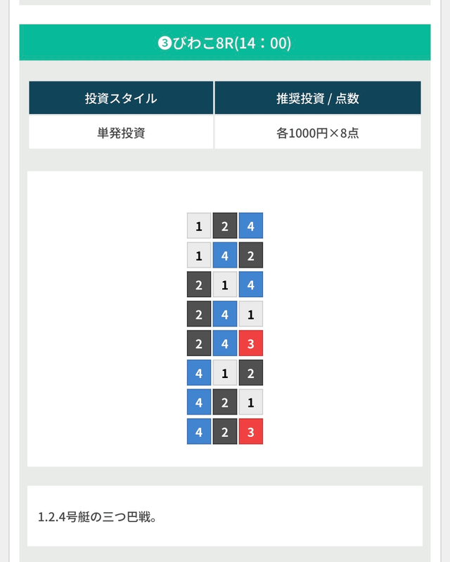 - 無料予想で稼げるのであれば・・・有料予想はもっと凄いのに決まっている。登録特典で参加できる「Normal」に参加したら、4戦2勝2敗で3万プラスって感じでした。まぁ普通かな〜。ちょっと今後も参加してみます!投稿日:2024/02/07
