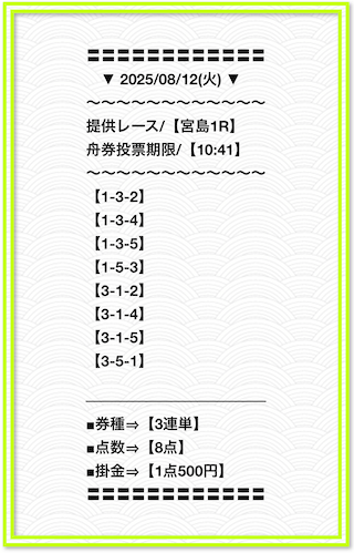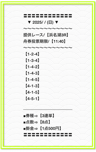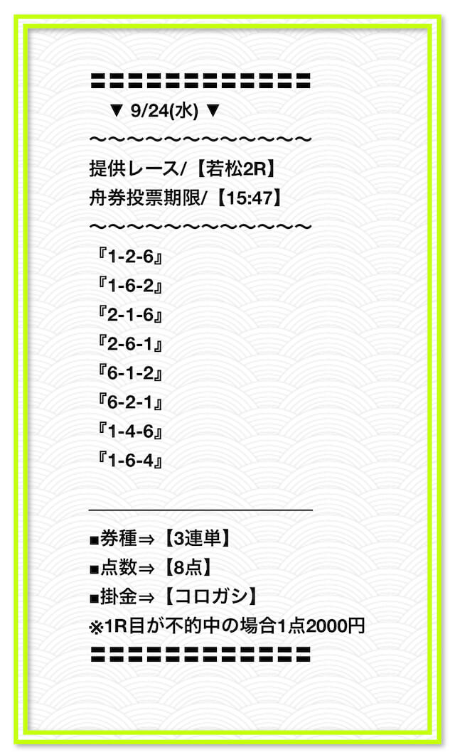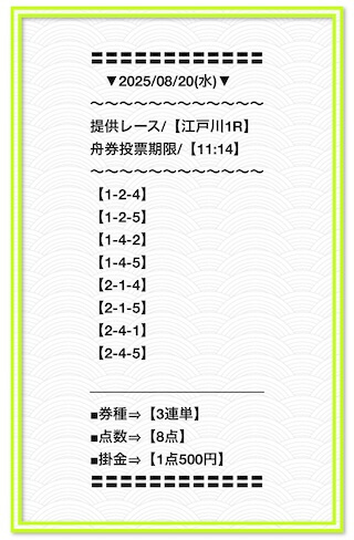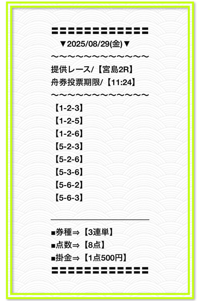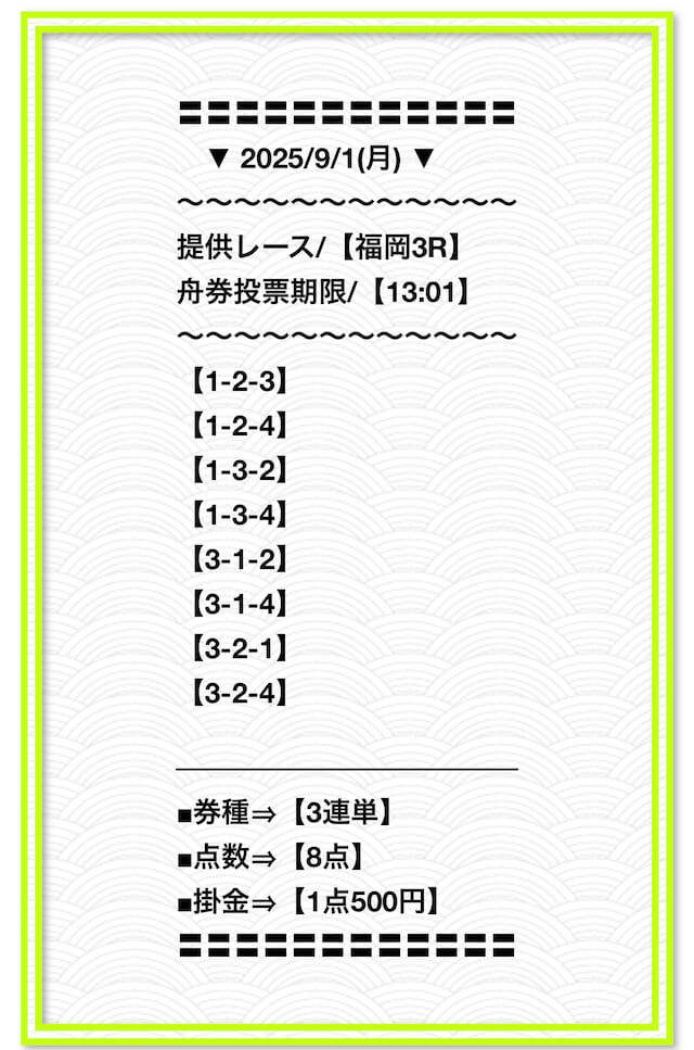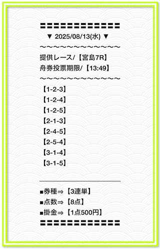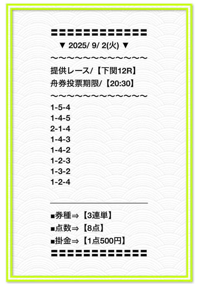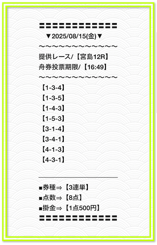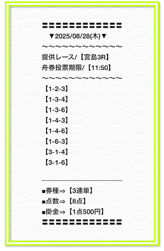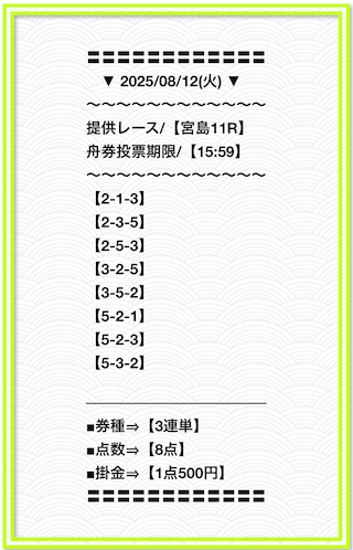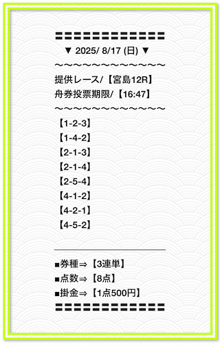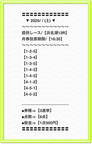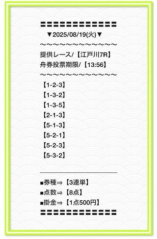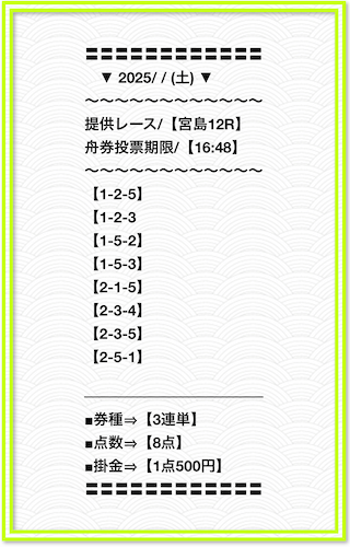 2025/2/1 非公開情報【白星のカリスマ】 情報料金+舟券代 50,000円+20,000円 |