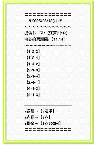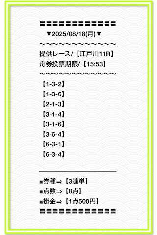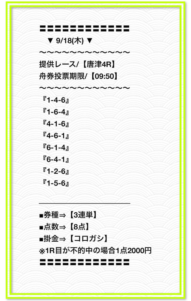 同じ舟券画像を使い回してるように見えるし、配当の桁もやたら大きすぎて逆に不信感がある。投稿日:2025/05/09