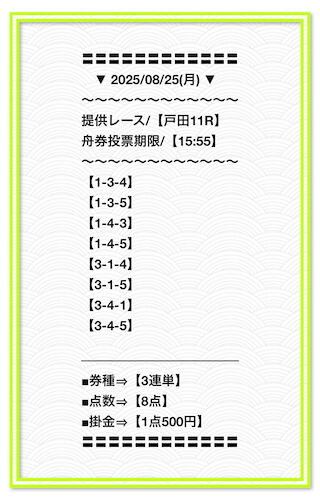 2025/3/23 東海エキスパート 情報料金+舟券代 40,000円+10,000円 |