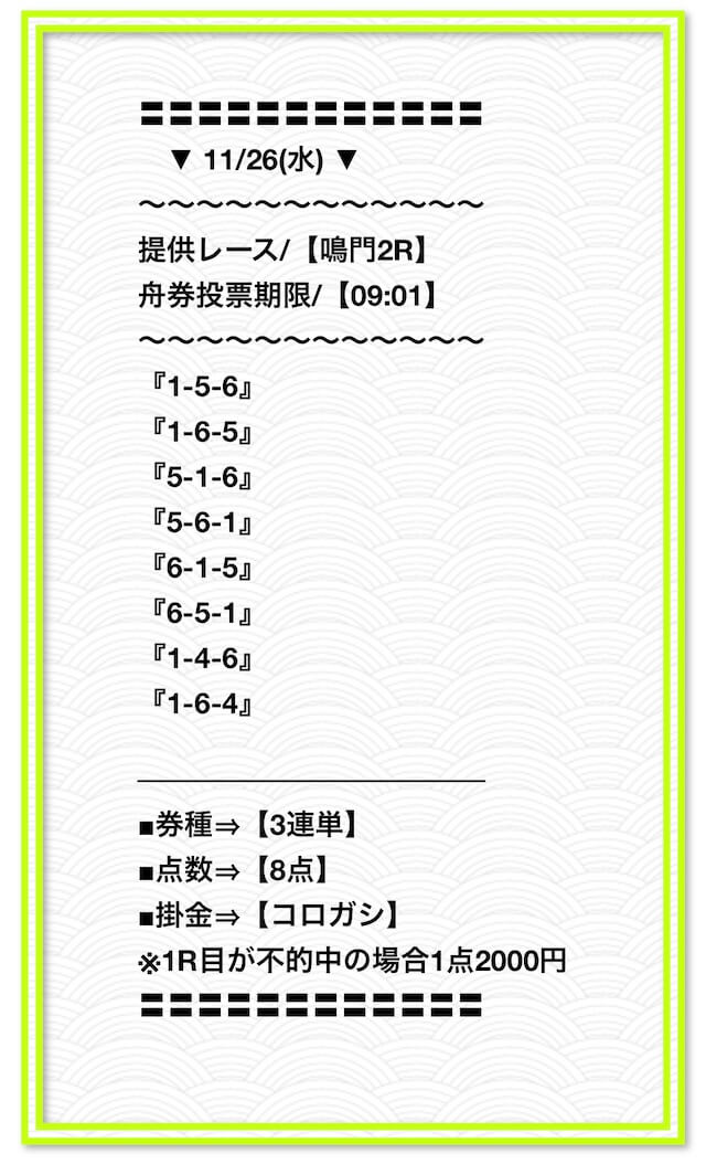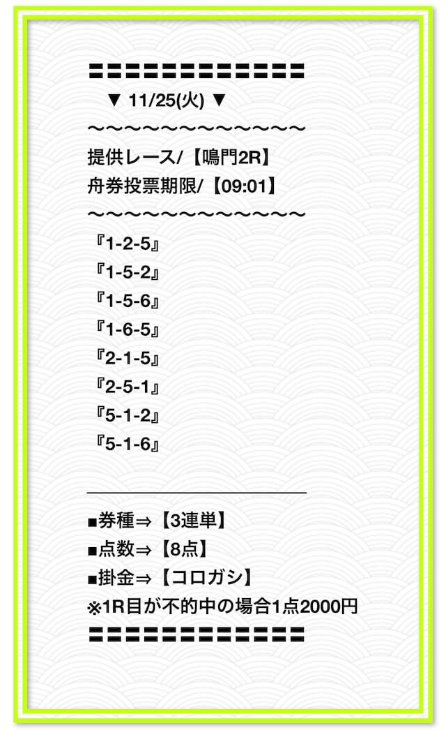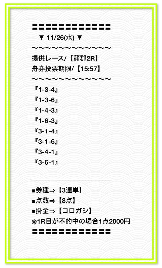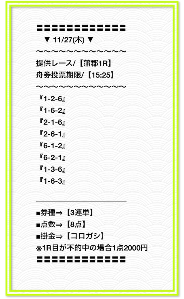 | 2025/2/1 非公開情報【白星のカリスマ】 情報料金+舟券代 50,000円+20,000円 |