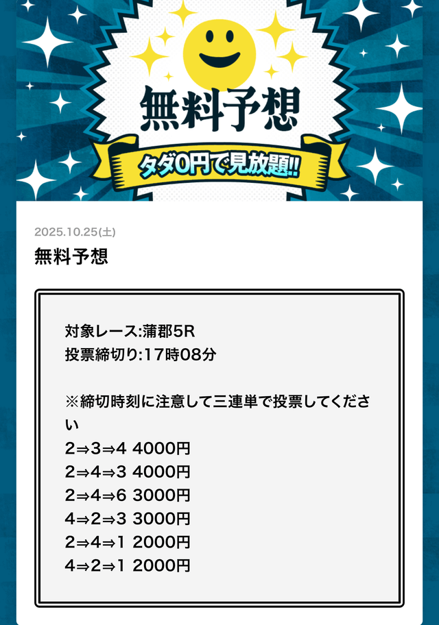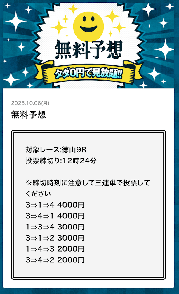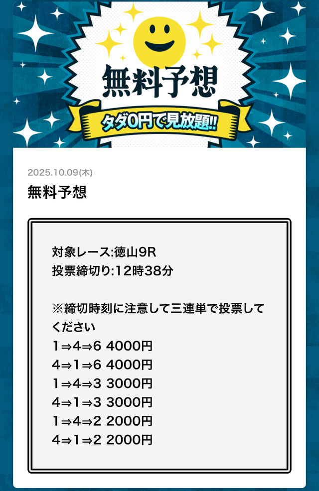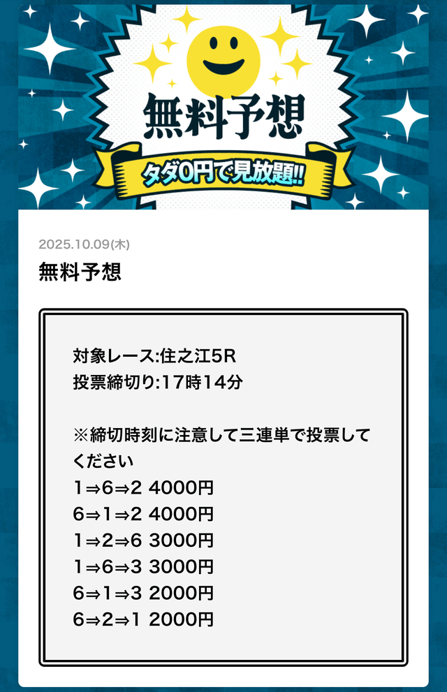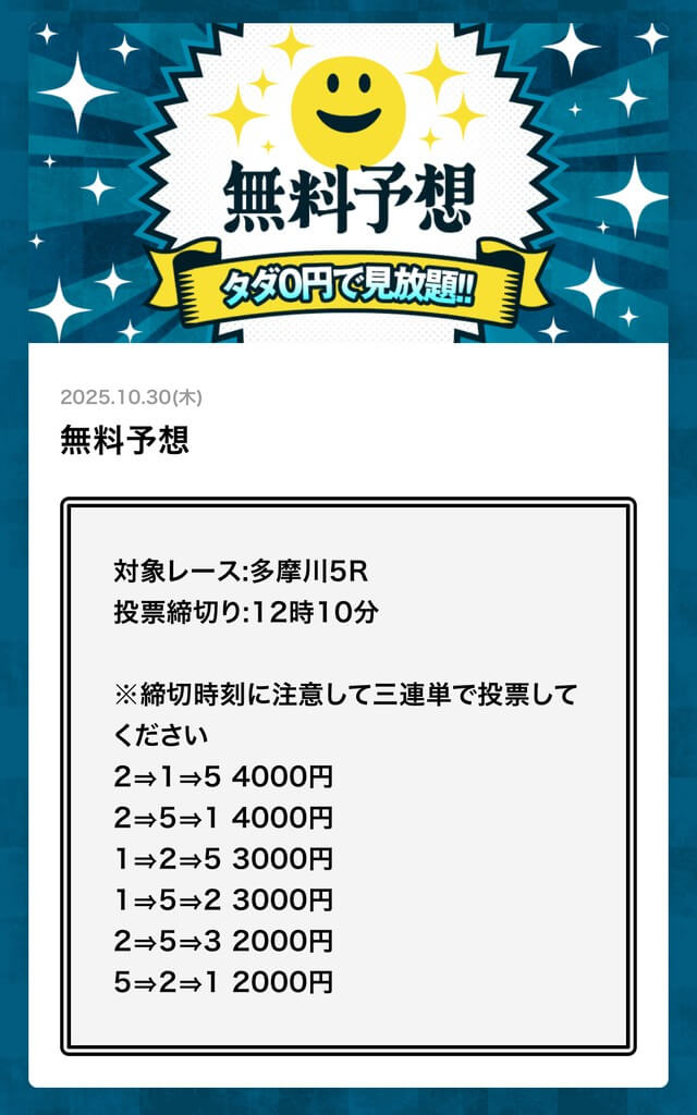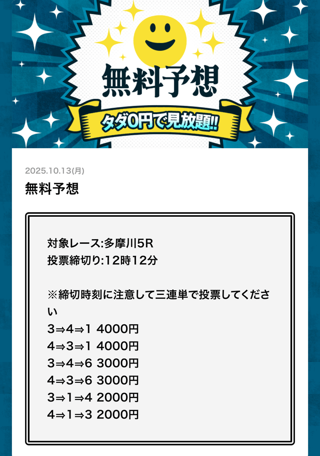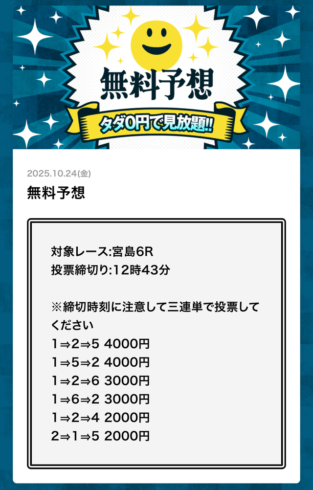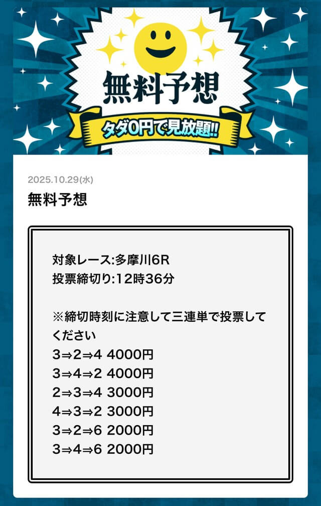 - 2025/10/30的中 無料予想で20,800円獲得2025/10/24的中 無料予想で28,400円獲得2025/10/20的中 無料予想で34,800円獲得2025/10/19的中 無料予想で20,700円獲得2025/10/13的中 無料予想で43,800円獲得2025/10/11的中 無料予想で46,400円獲得2025/10/10的中 無料予想で23,600円獲得2025/10/08的中 無料予想で36,600円獲得2025/10/06的中 無料予想で89,100円獲得2025/10/06的中 無料予想で113,200円獲得