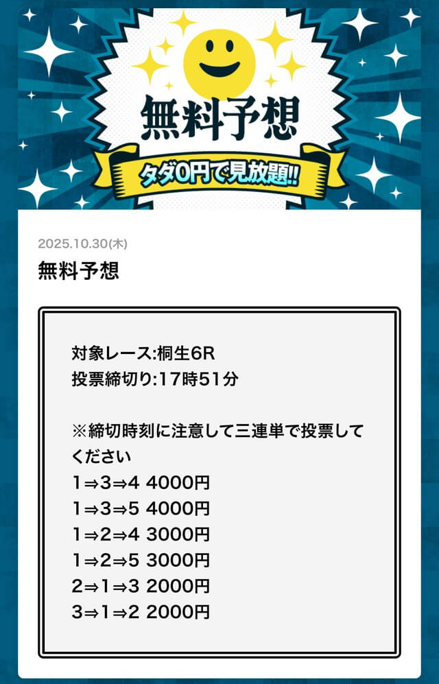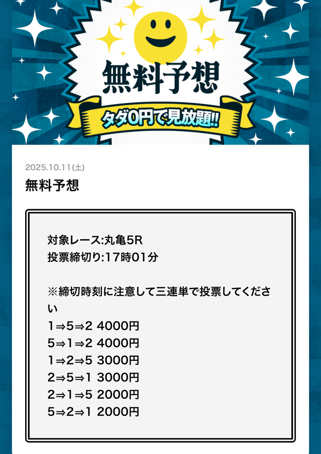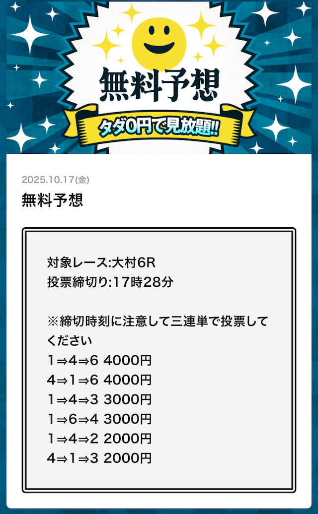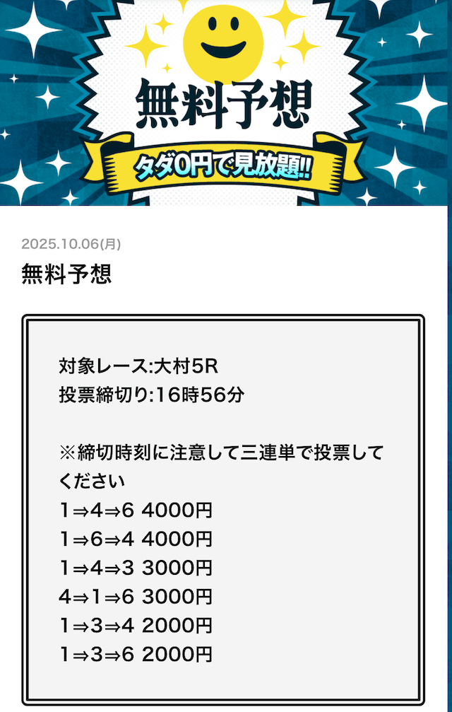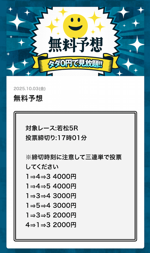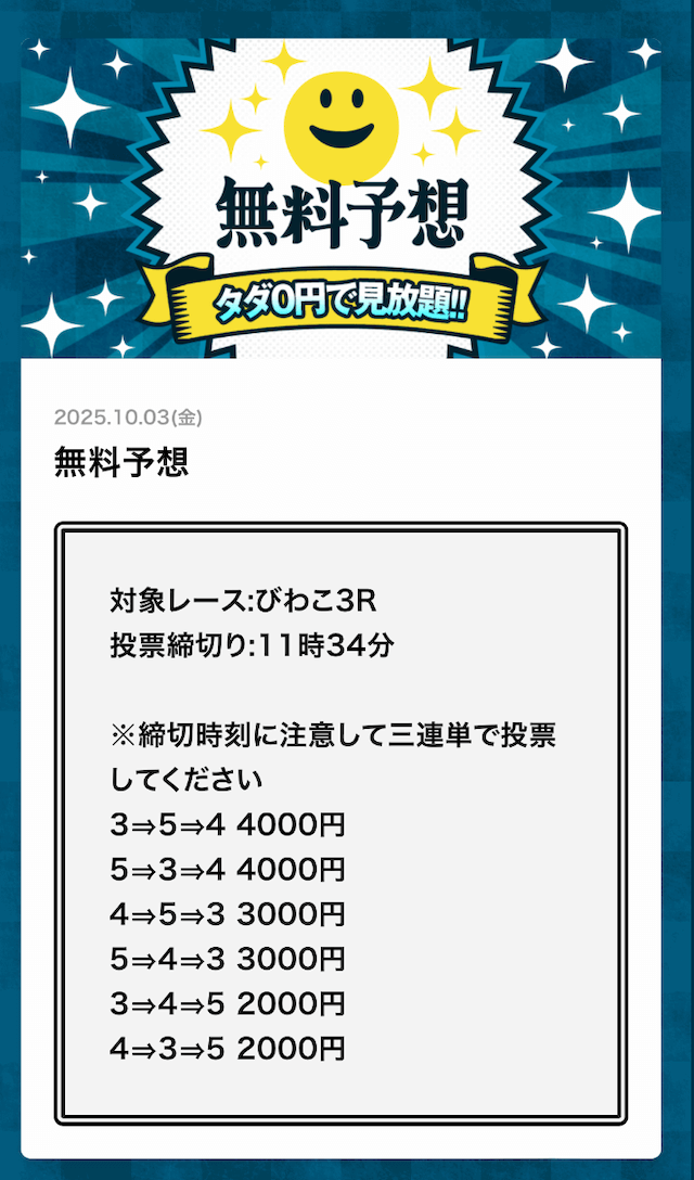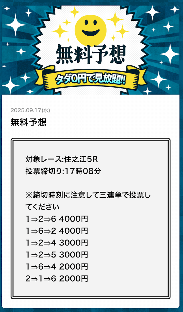 - 2025/10/30的中 無料予想で20,800円獲得2025/10/24的中 無料予想で28,400円獲得2025/10/20的中 無料予想で34,800円獲得2025/10/19的中 無料予想で20,700円獲得2025/10/13的中 無料予想で43,800円獲得2025/10/11的中 無料予想で46,400円獲得2025/10/10的中 無料予想で23,600円獲得2025/10/08的中 無料予想で36,600円獲得2025/10/06的中 無料予想で89,100円獲得2025/10/06的中 無料予想で113,200円獲得