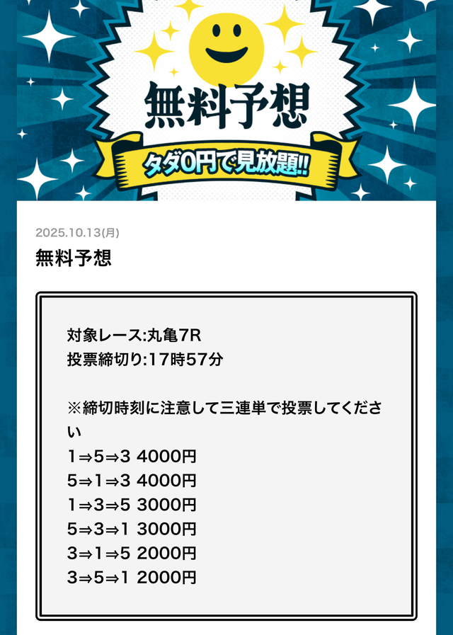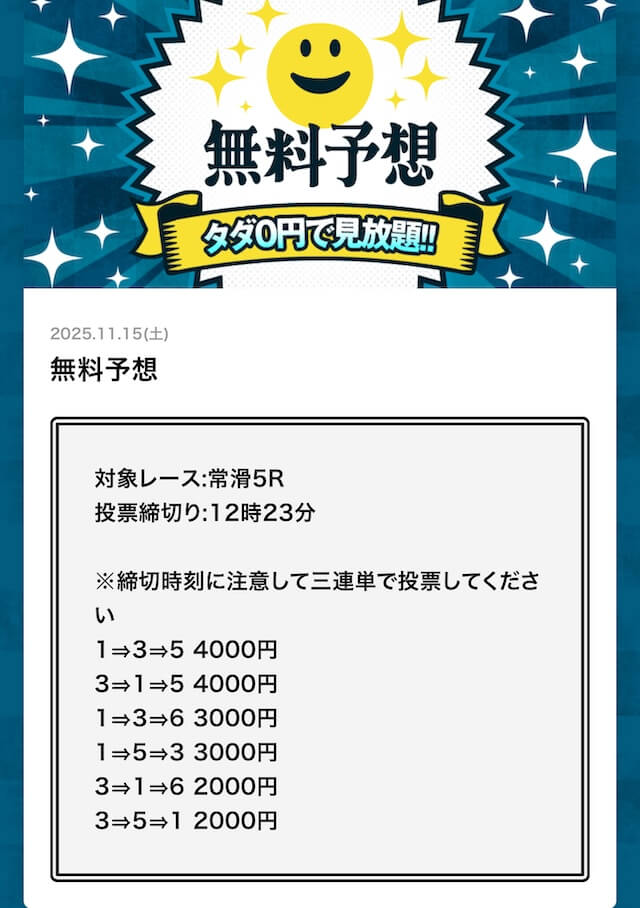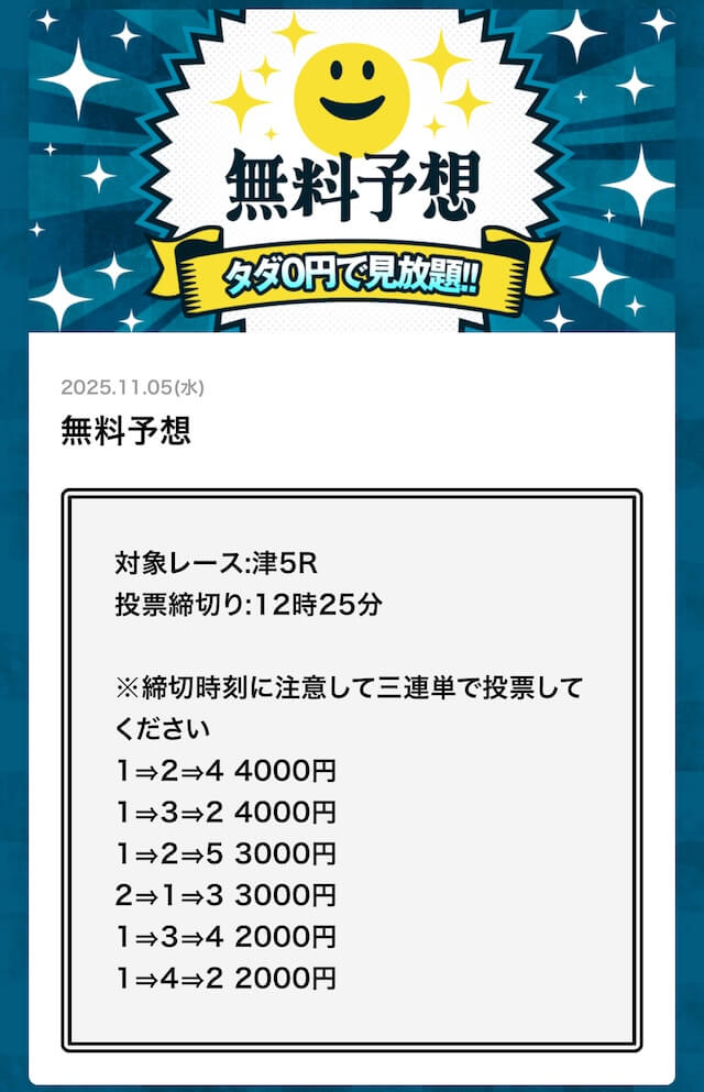 匿名定期的にキャンペーン情報の案内が来るから、それを中心に参加していくと良いかも!キャンペーンってだけあって予想精度の高くて且つ情報料金を抑えられている!投稿日:2025/03/18