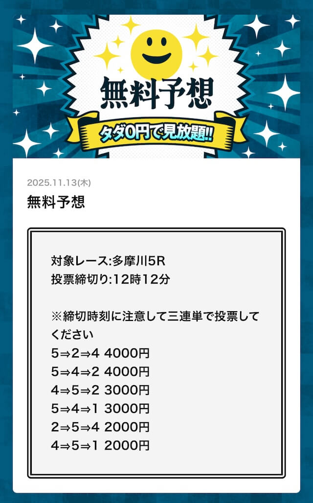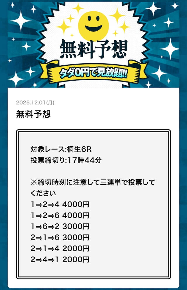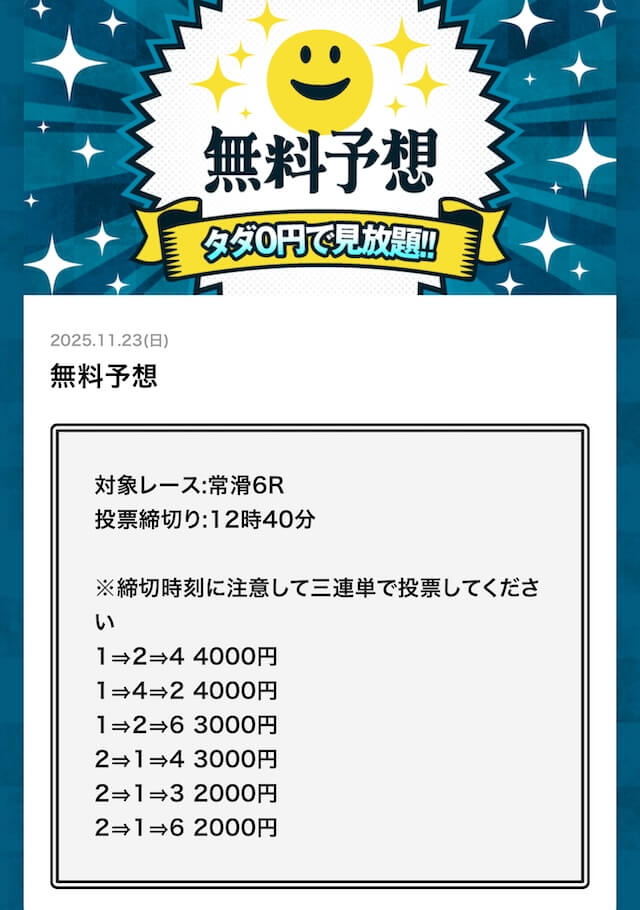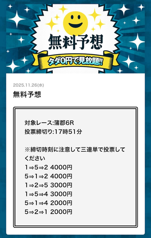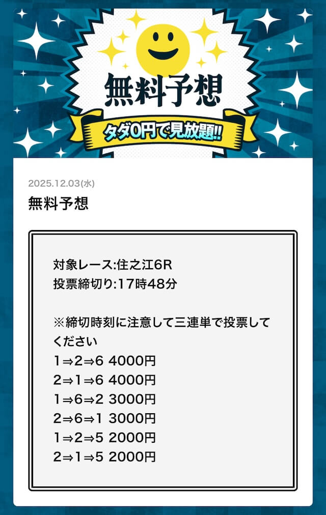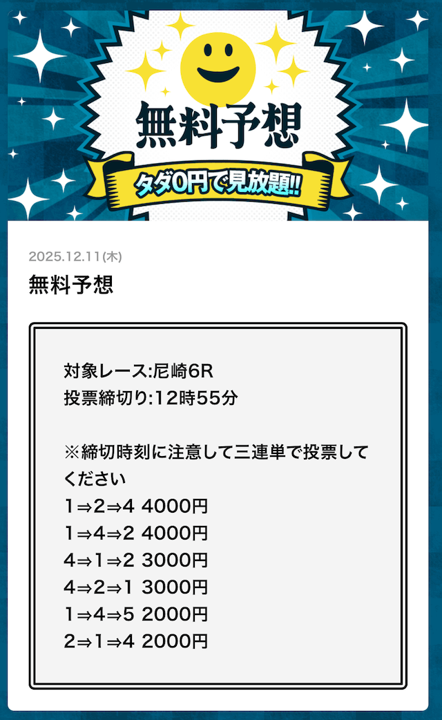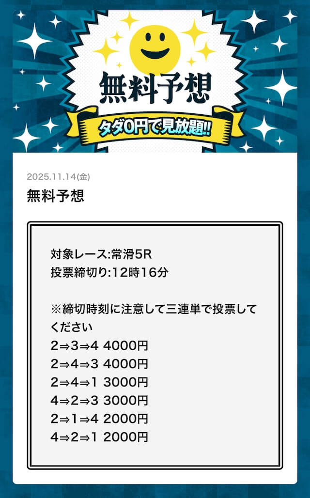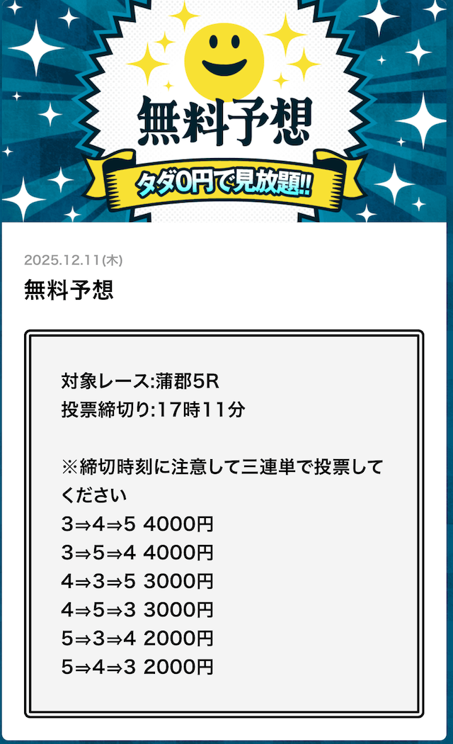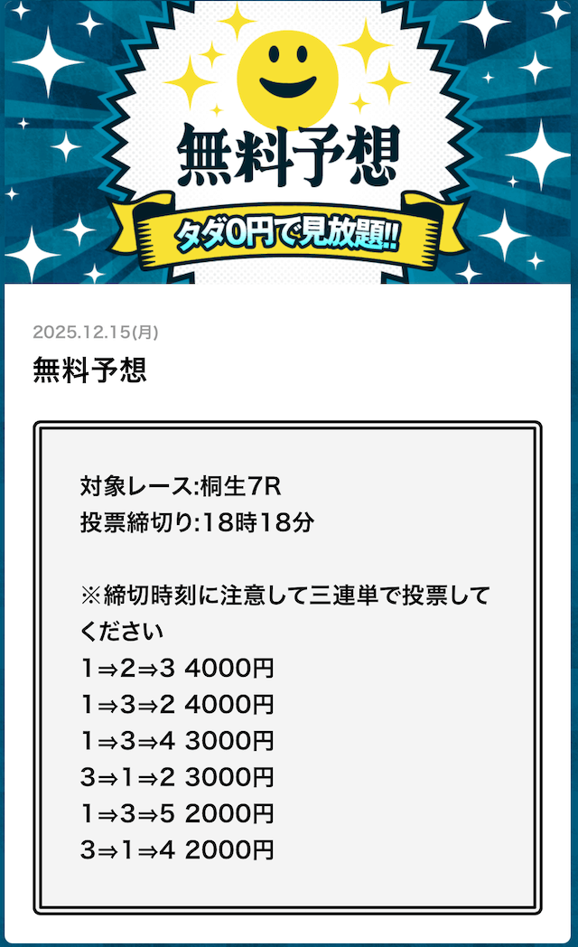- 2025/12/14的中 無料予想で45,600円獲得2025/12/12的中 無料予想で47,400円獲得2025/12/11的中 無料予想で19,200円獲得2025/12/10的中 無料予想で87,000円獲得2025/12/08的中 無料予想で44,800円獲得2025/12/06的中 無料予想で20,000円獲得2025/12/05的中 無料予想で31,500円獲得2025/12/04的中 無料予想で29,600円獲得2025/12/03的中 無料予想で26,000円獲得2025/12/01的中 無料予想で26,400円獲得