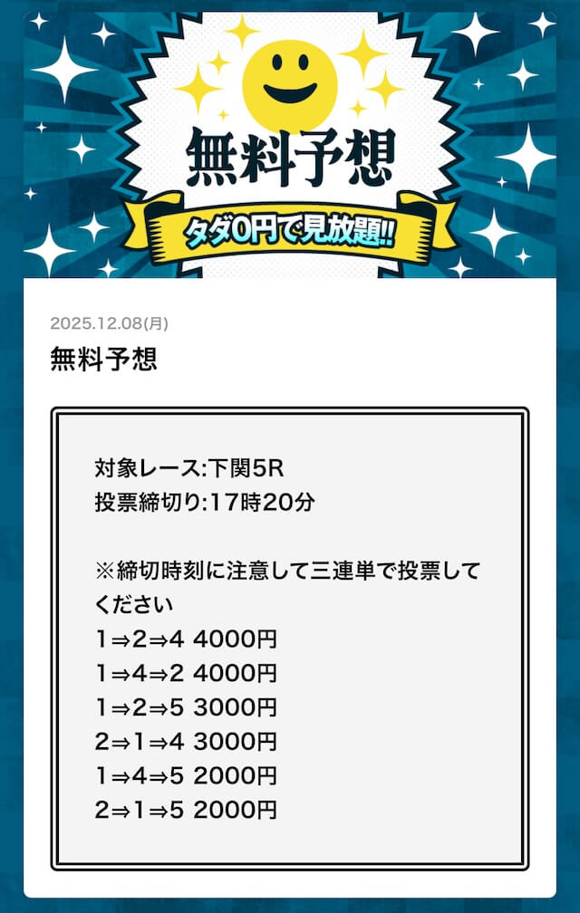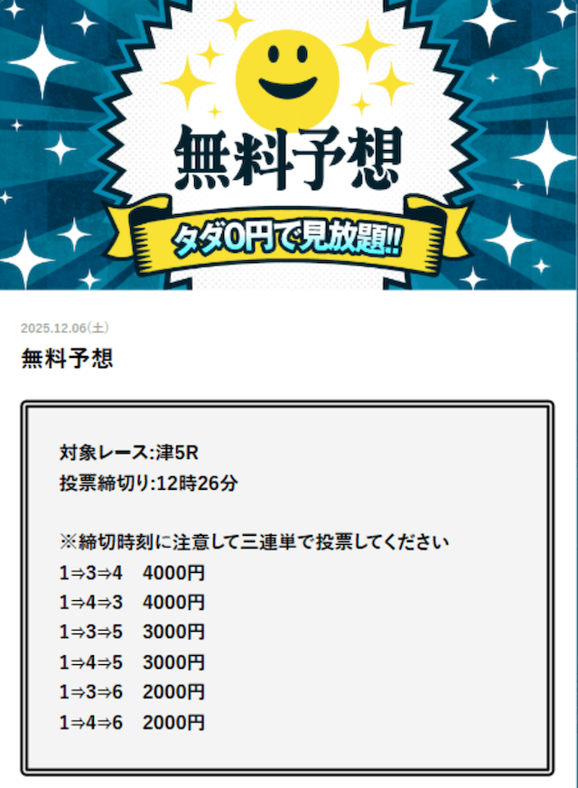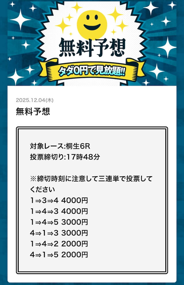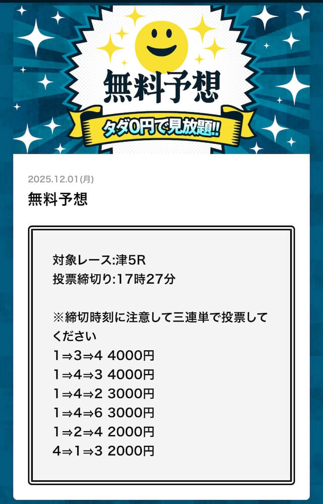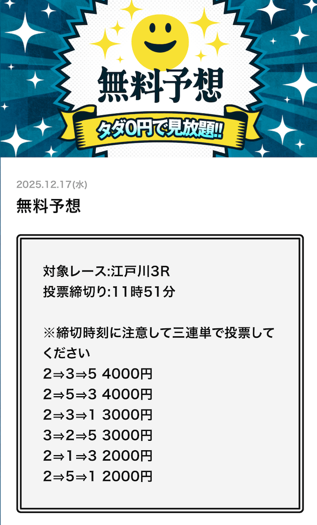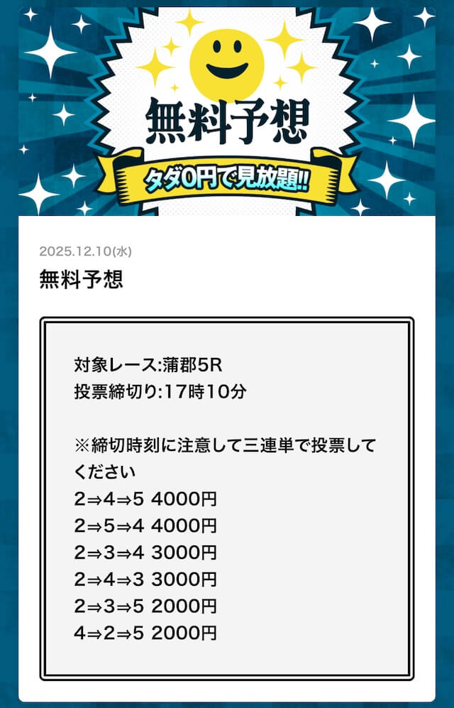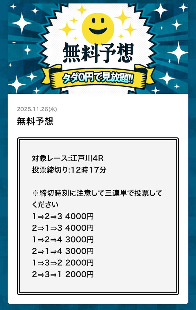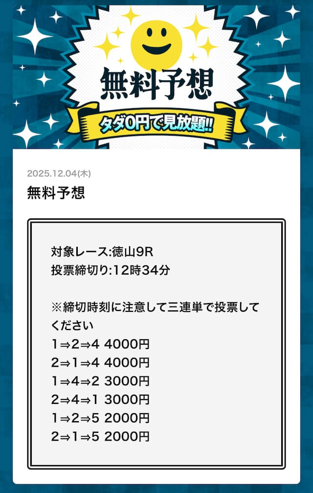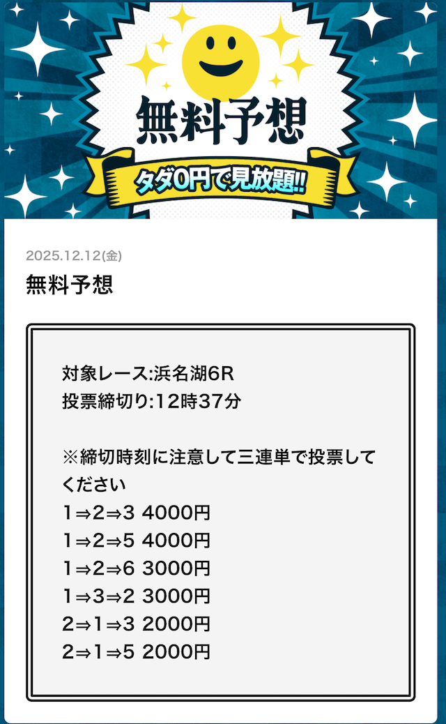 - 2025/12/14的中 無料予想で45,600円獲得2025/12/12的中 無料予想で47,400円獲得2025/12/11的中 無料予想で19,200円獲得2025/12/10的中 無料予想で87,000円獲得2025/12/08的中 無料予想で44,800円獲得2025/12/06的中 無料予想で20,000円獲得2025/12/05的中 無料予想で31,500円獲得2025/12/04的中 無料予想で29,600円獲得2025/12/03的中 無料予想で26,000円獲得2025/12/01的中 無料予想で26,400円獲得