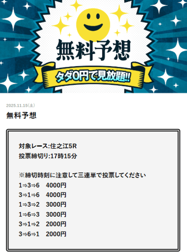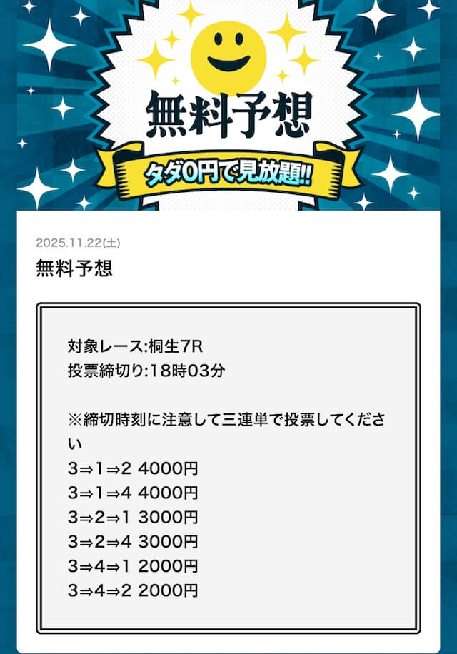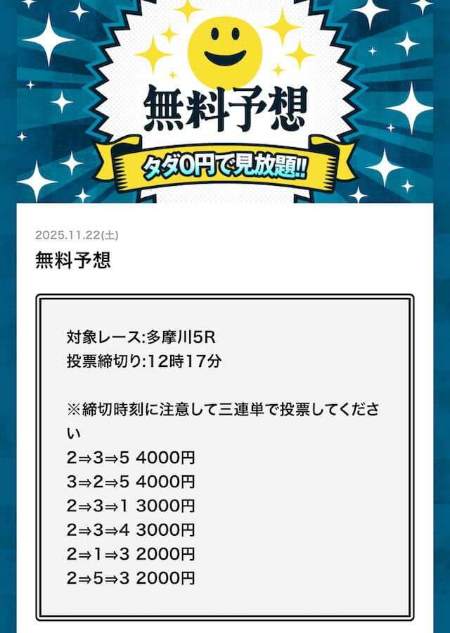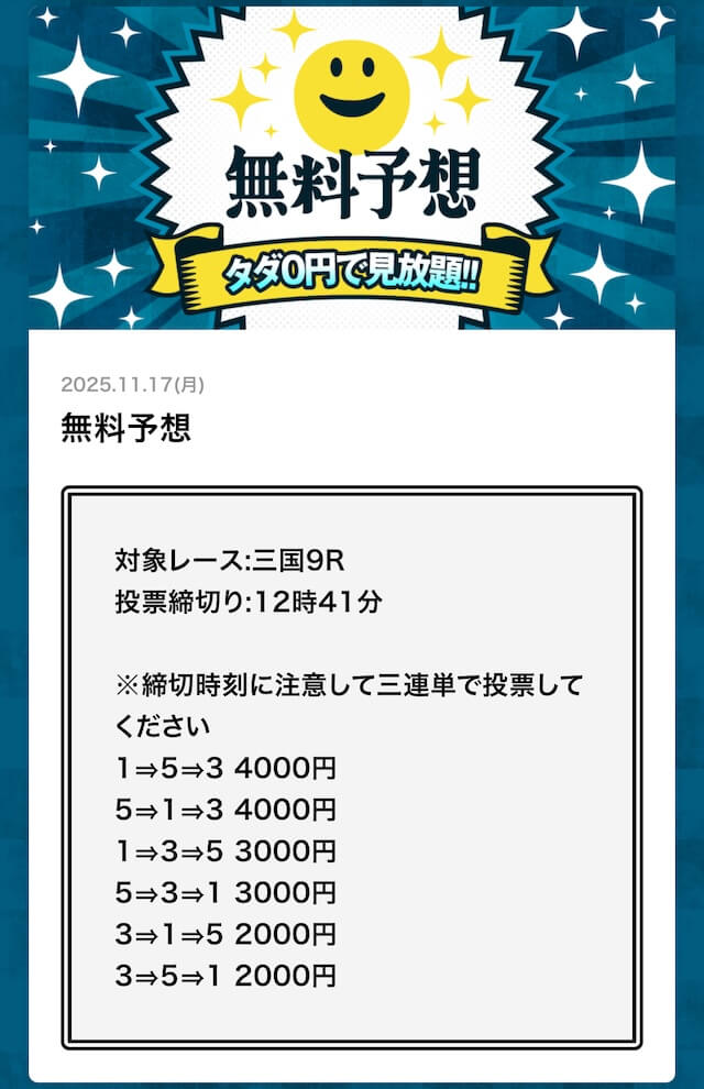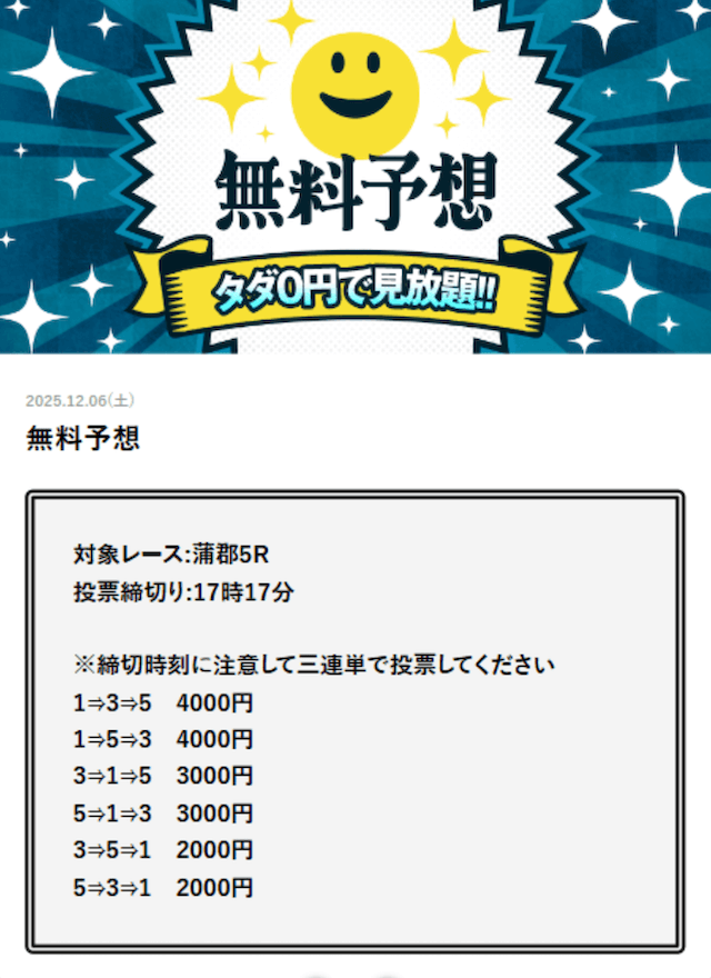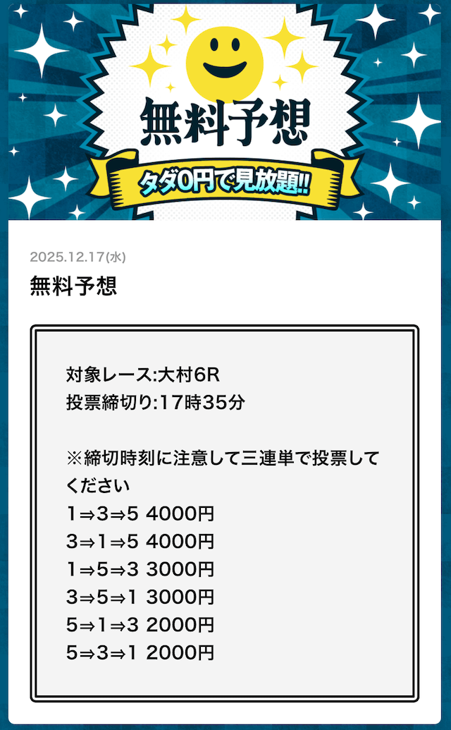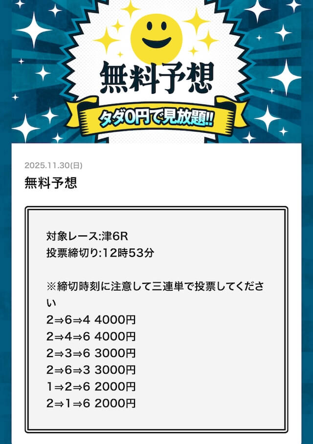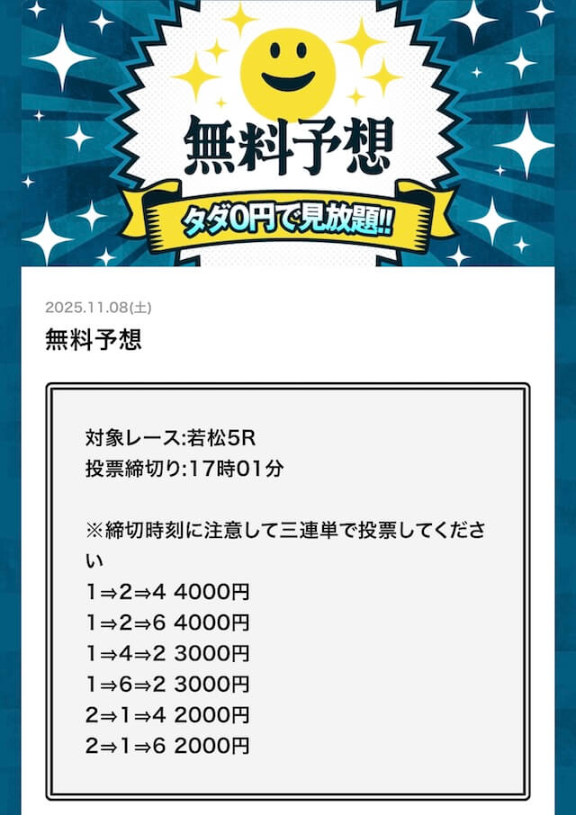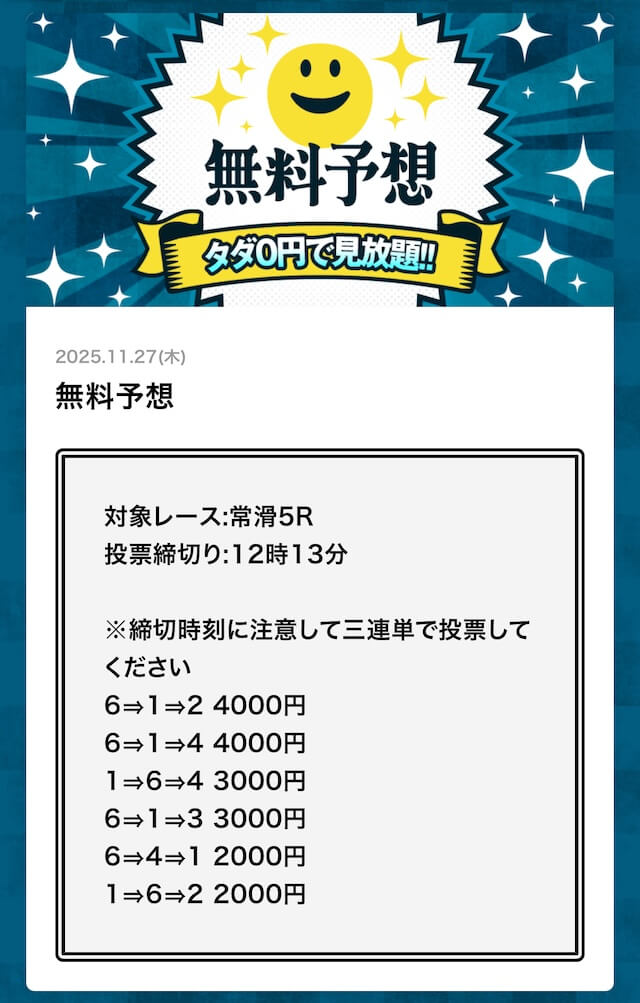 - 2025/12/14的中 無料予想で45,600円獲得2025/12/12的中 無料予想で47,400円獲得2025/12/11的中 無料予想で19,200円獲得2025/12/10的中 無料予想で87,000円獲得2025/12/08的中 無料予想で44,800円獲得2025/12/06的中 無料予想で20,000円獲得2025/12/05的中 無料予想で31,500円獲得2025/12/04的中 無料予想で29,600円獲得2025/12/03的中 無料予想で26,000円獲得2025/12/01的中 無料予想で26,400円獲得