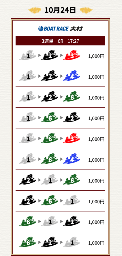 - 一騎当船の商品ページには各プランの直近2週間分の結果が全部見られるようになっています。当たった時だけじゃなく外れた時も分かるので、逆に信頼感が増しました(笑)プランを選ぶときにすごく参考になります。投稿日:2025/09/21