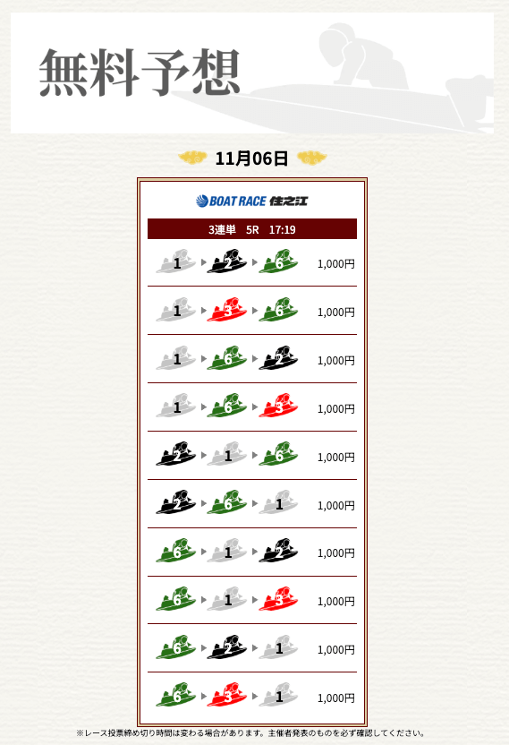 匿名最初は無料予想から入りました。正直「どうせ当たらないだろう」と思ってましたが、初回から的中して驚きました。その後も2回に1回くらいは当たって、気がつけば資金が増えてました。有料に移行する自信がついたのは、この無料予想のおかげです。投稿日:2025/09/24