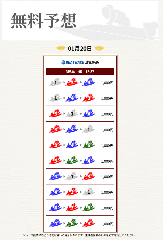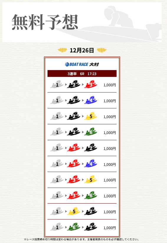 - 2026/02/01的中 無料予想で43,800円獲得2026/02/01的中 無料予想で22,300円獲得2026/01/25的中 無料予想で15,100円獲得2026/01/24的中 無料予想で60,700円獲得2026/01/23的中 無料予想で16,100円獲得2026/01/22的中 無料予想で12,600円獲得2026/01/11的中 無料予想で12,400円獲得2026/01/10的中 無料予想で10,350円獲得2026/01/06的中 無料予想で11,400円獲得2026/01/06的中 無料予想で28,500円獲得