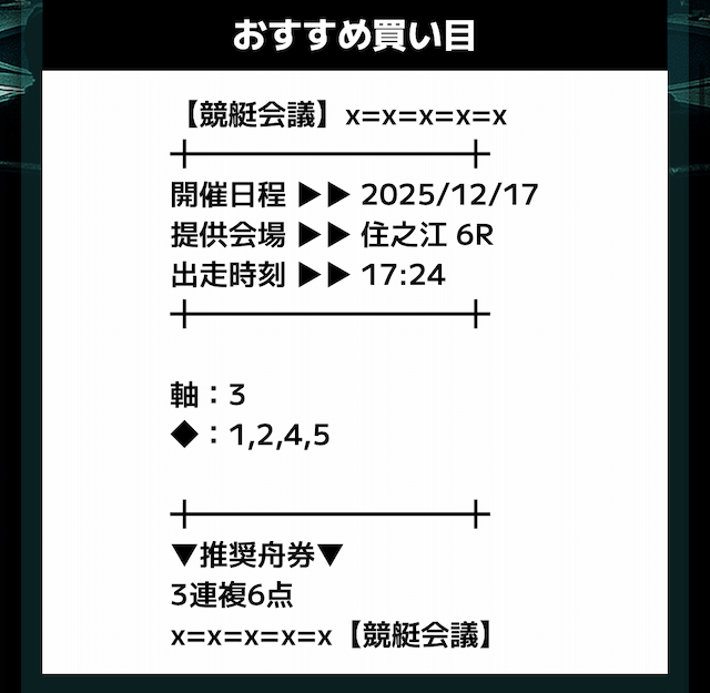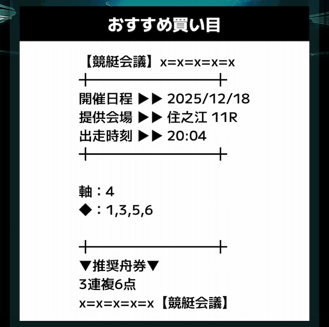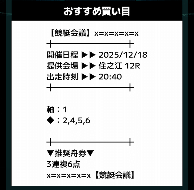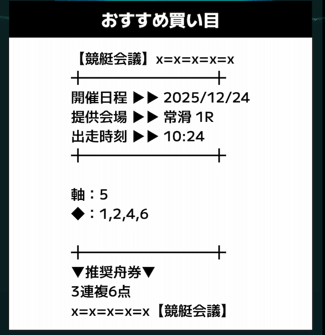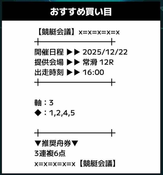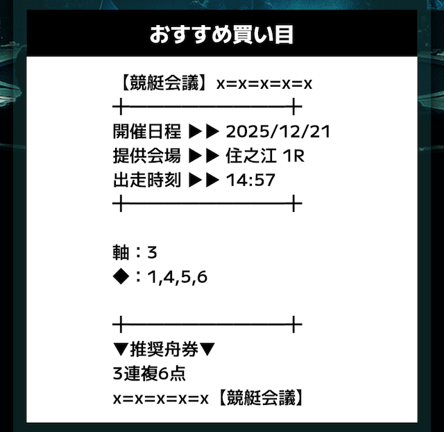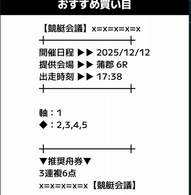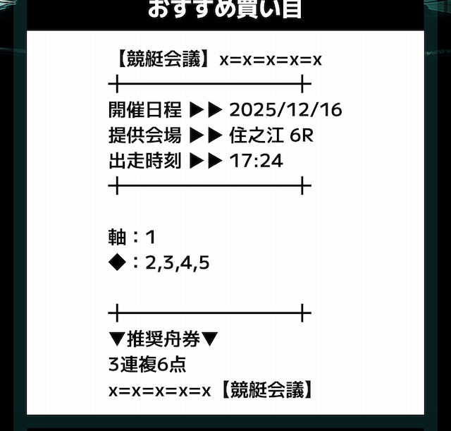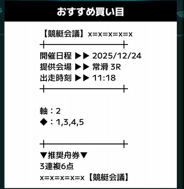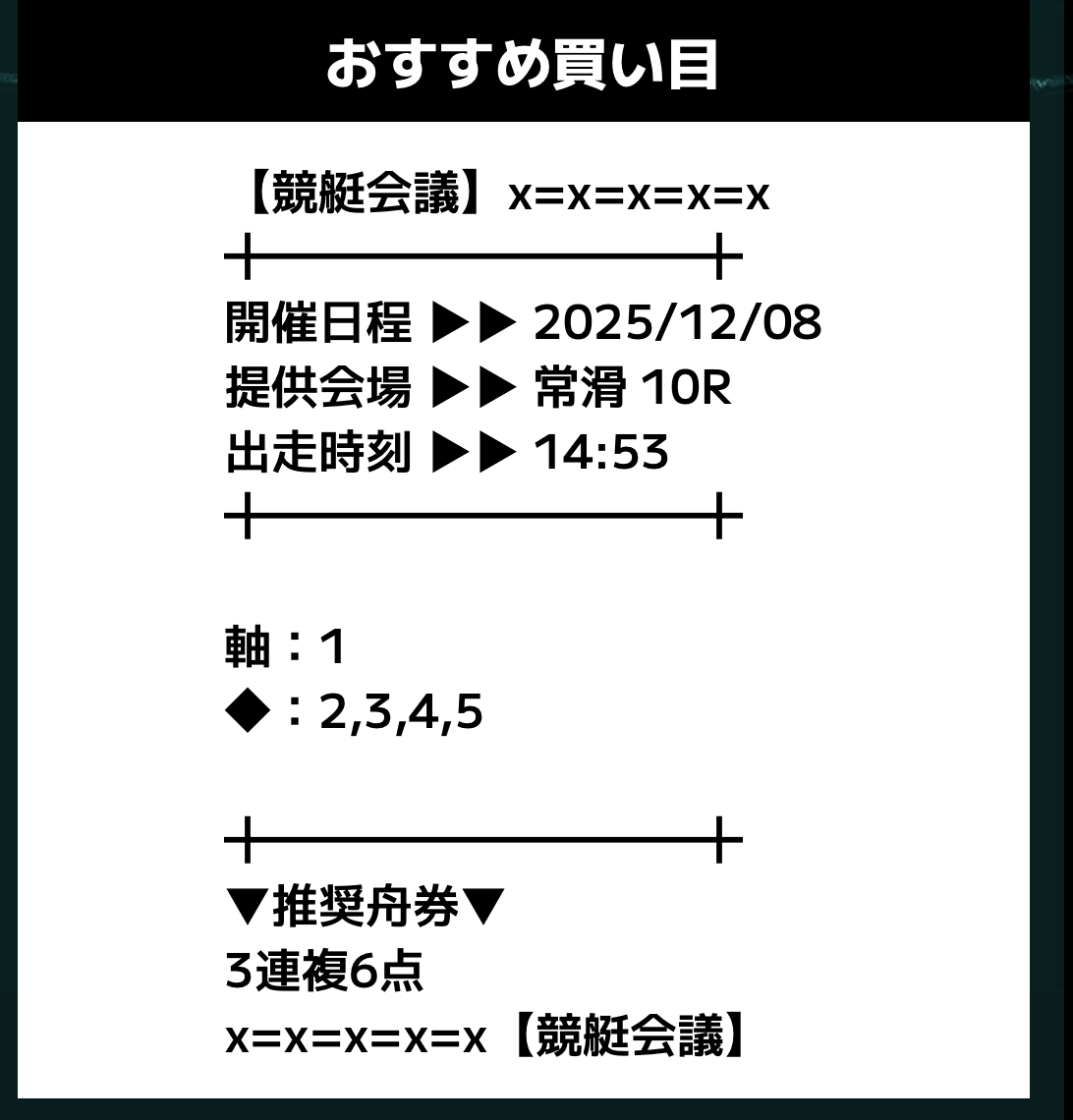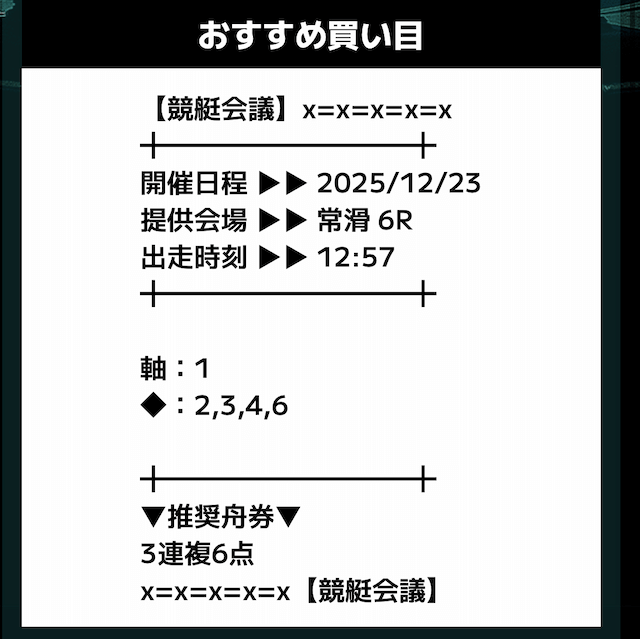 匿名競艇会議の無料予想の予想精度はとにかく高い!!3連複の予想が公開されるんだけど、3連単じゃ拾えないような展開を当てるのが美味しすぎる。3連単だと7万舟だけど、3連複でしっかり拾えるみたいな。外枠を軸、内枠を外して、しっかりと読んだ展開になる。まじで一度使ってみるべきだね!投稿日:2025/12/01