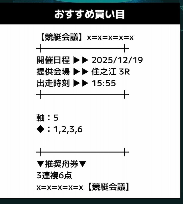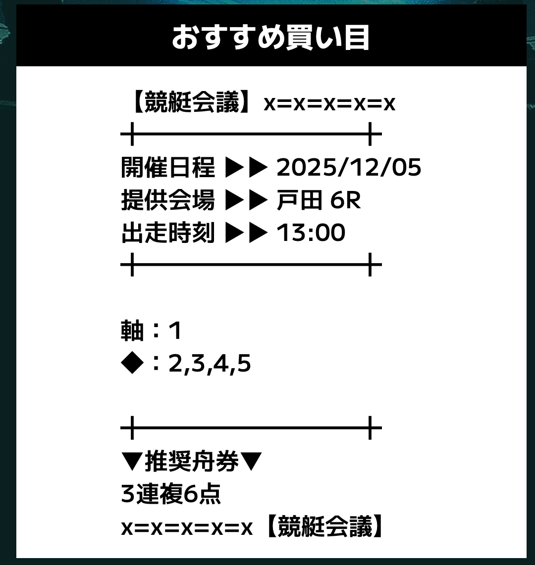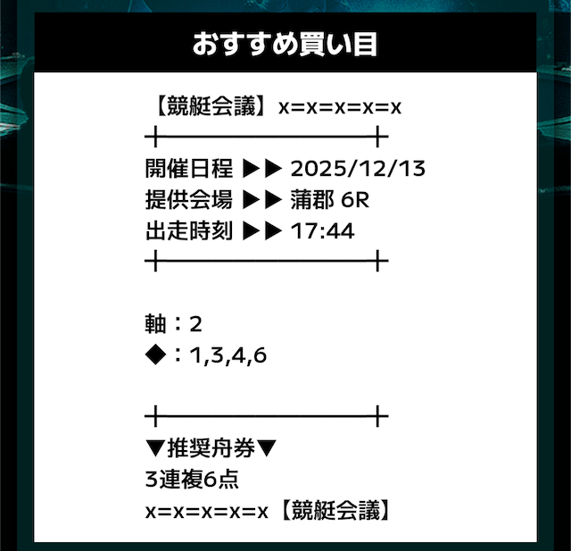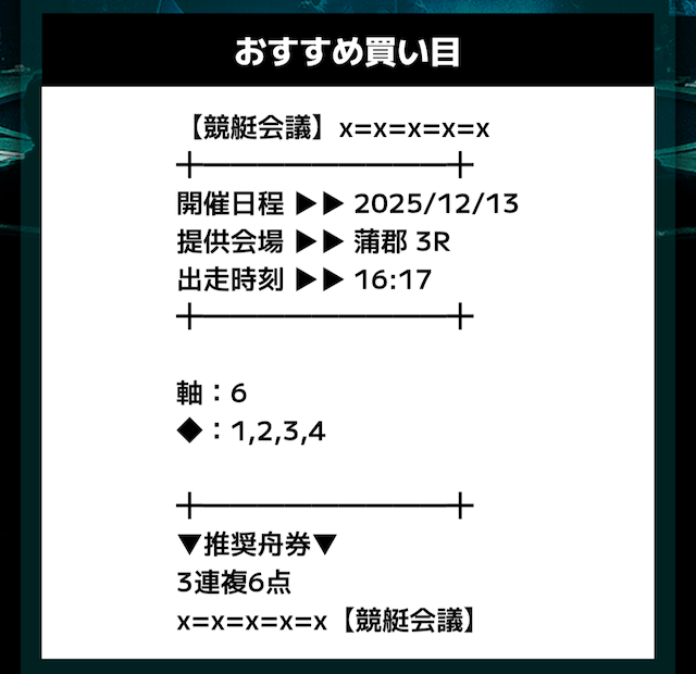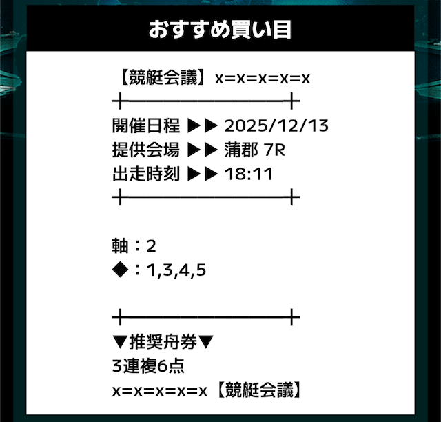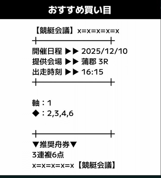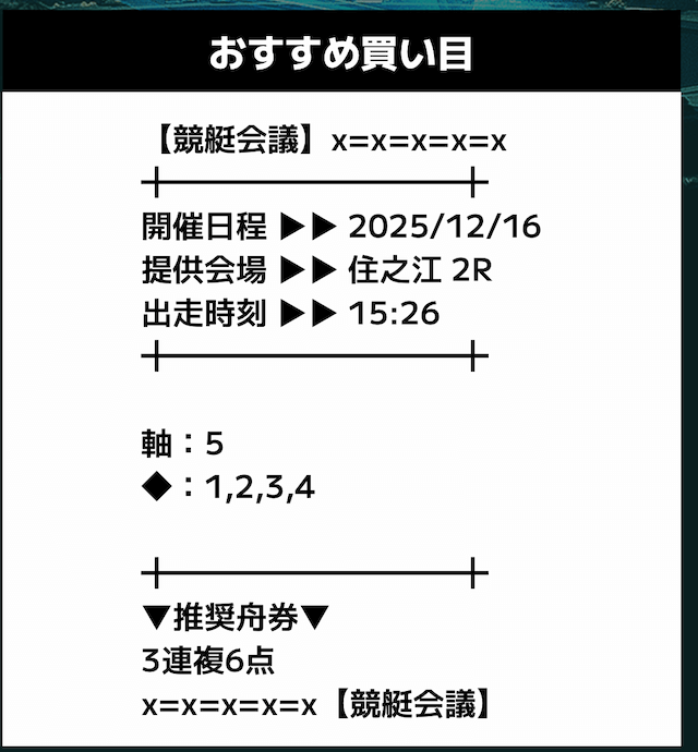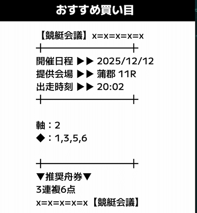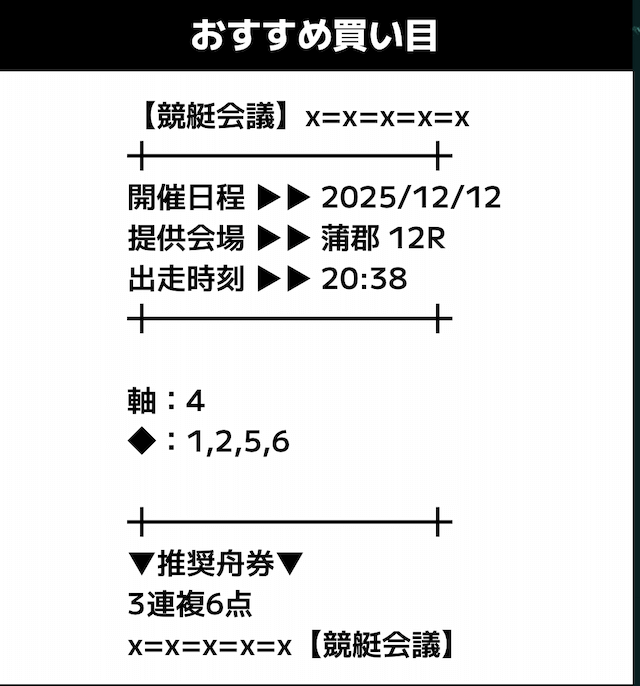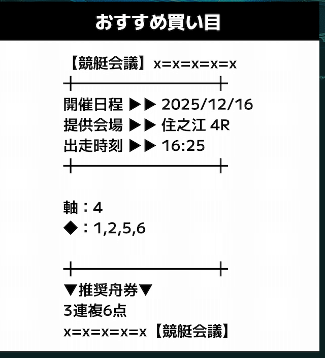 匿名競艇会議の無料予想の予想精度はとにかく高い!!3連複の予想が公開されるんだけど、3連単じゃ拾えないような展開を当てるのが美味しすぎる。3連単だと7万舟だけど、3連複でしっかり拾えるみたいな。外枠を軸、内枠を外して、しっかりと読んだ展開になる。まじで一度使ってみるべきだね!投稿日:2025/12/01