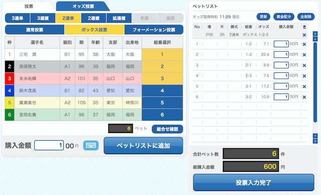 例えば、画像のように1〜3号艇を選定してボックス買いをすると「1-2-3」「1-3-2」「2-1-3」「2-3-1」「3-1-2」「3-2-1」の6点に。