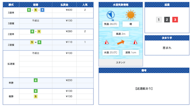 このレースでは、④号艇がフライング欠場だったため、④号艇を含む舟券が全て返還となっています。