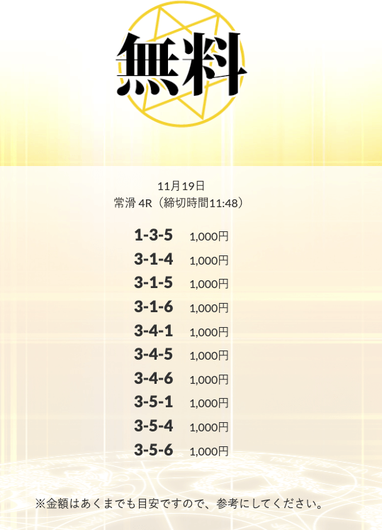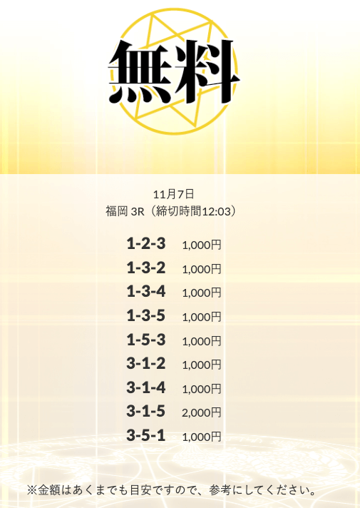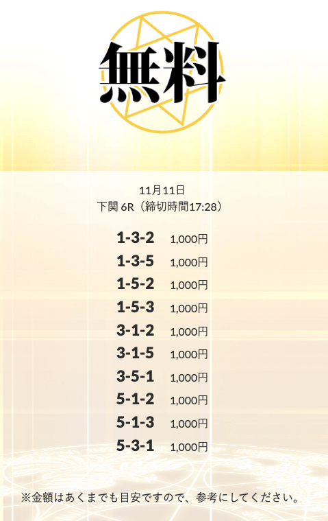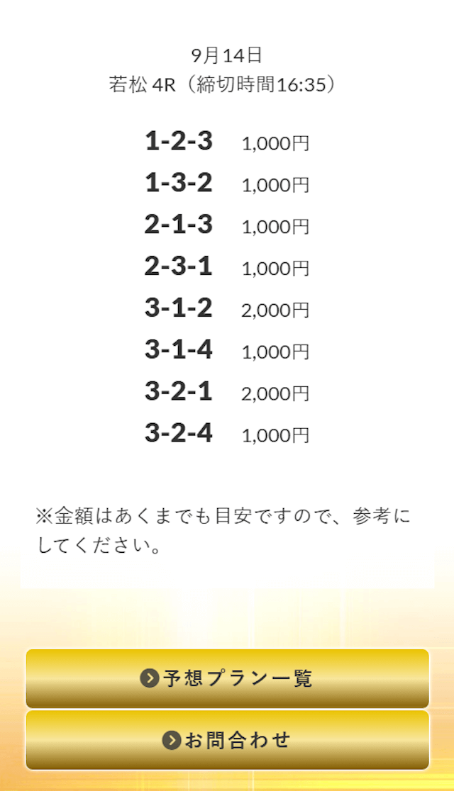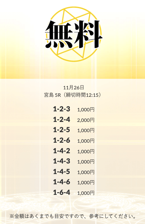 初回限定の「八咫烏」は、不的中だったら情報料金が丸ごと返ってくる保障付きらしい。つまり、リスクで見りゃ無料予想と変わんねぇな。逆に「VIPプラン」は情報料金に対しての旨みが見合ってねぇ⋯。資金効率を踏まえると「剣」「青龍」「朱雀」…このあたりを狙うのが賢いな。