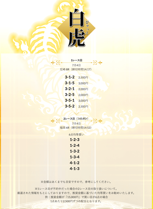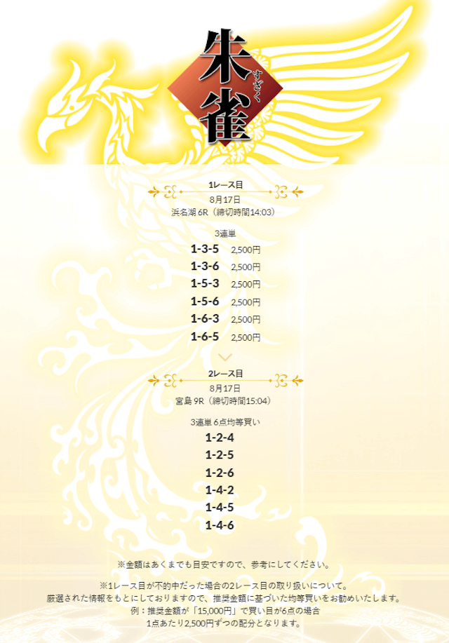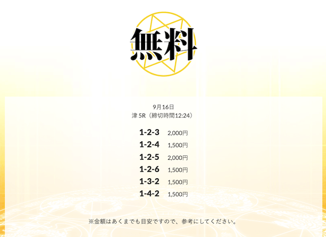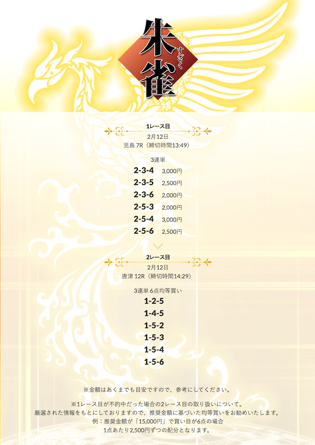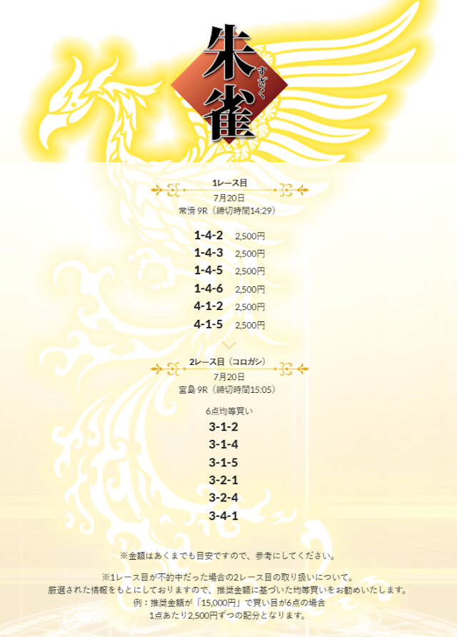 継続的に無料予想に参加し、初回限定プランの「八咫烏」に参加してください。20万円以上を稼げたタイミングで「朱雀」「白虎」あたりに参加。その後は軍資金に応じて2〜3連敗しても大丈夫な範囲で「高額プラン」にチャレンジしていきましょう。