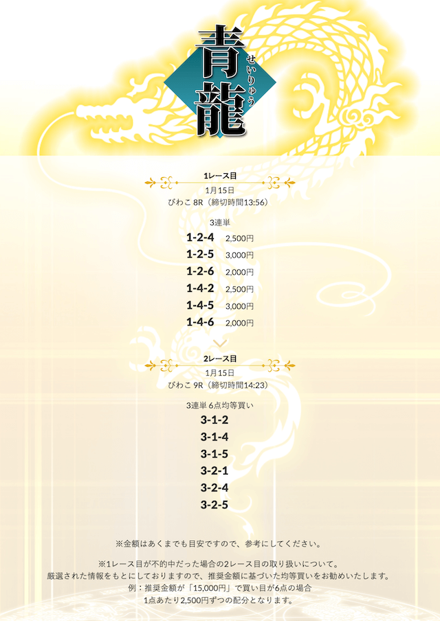 2025/1/15 青龍 情報料金+舟券代 45,000円+15,000円 |