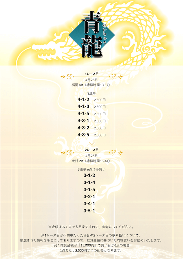 2025/4/25 青龍 情報料金+舟券代 45,000円+15,000円 |