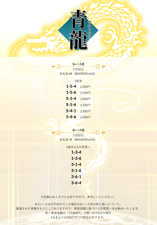 2025/7/2 青龍 情報料金+舟券代 45,000円+15,000円 |