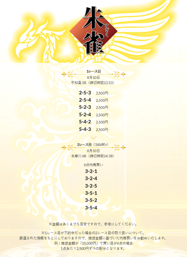 2025/8/10 朱雀 情報料金+舟券代 80,000円+30,000円 |