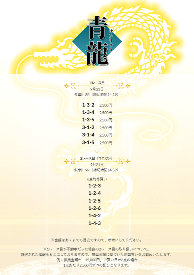 2025/9/21 青龍 情報料金+舟券代 45,000円+30,000円 |
