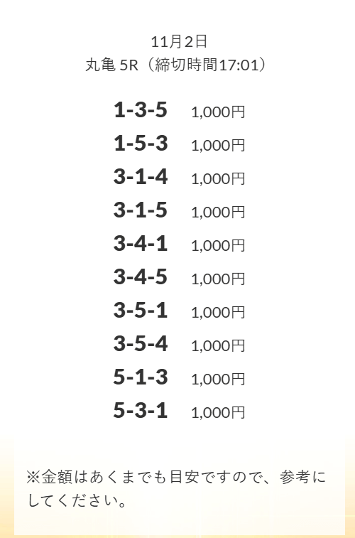 - 派手な演出がなく、数字で勝負しているのが皇艇のいいところ。見やすく整理されているので、自分の判断も加えやすい。予想が届く時間も一定しているから、日々のリズムを崩さず参加できています。投稿日:2025/11/14