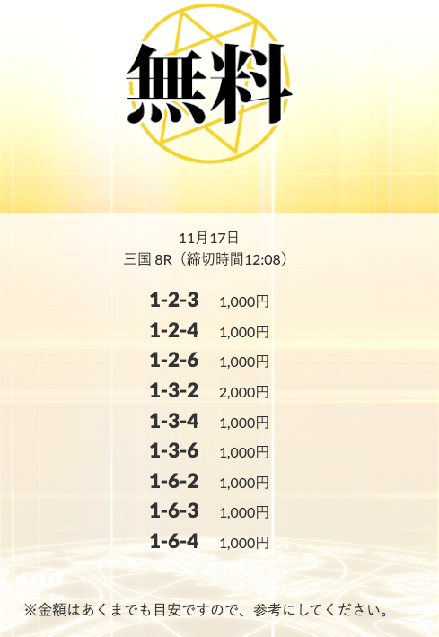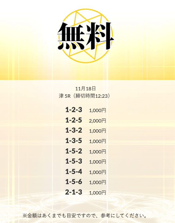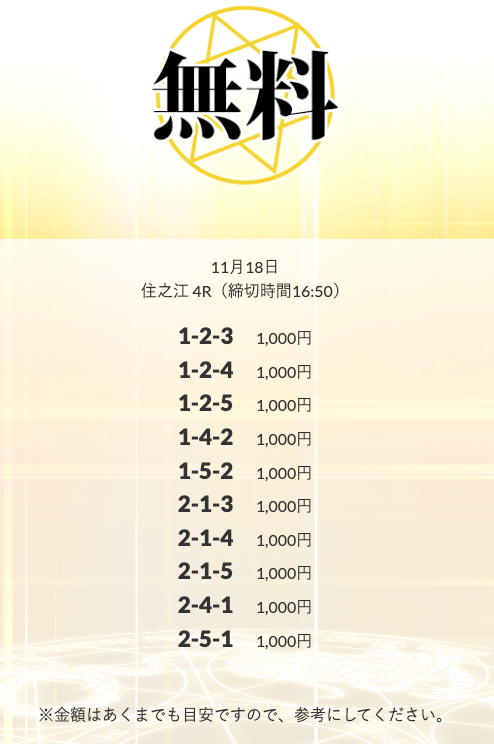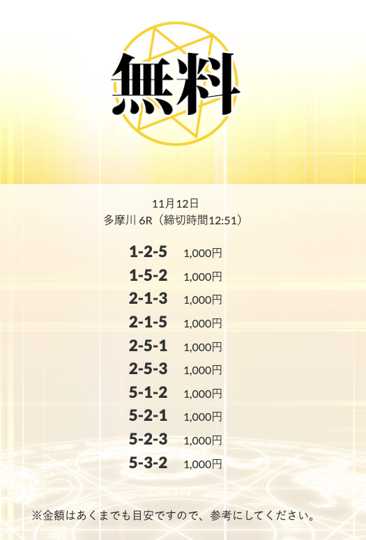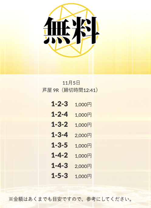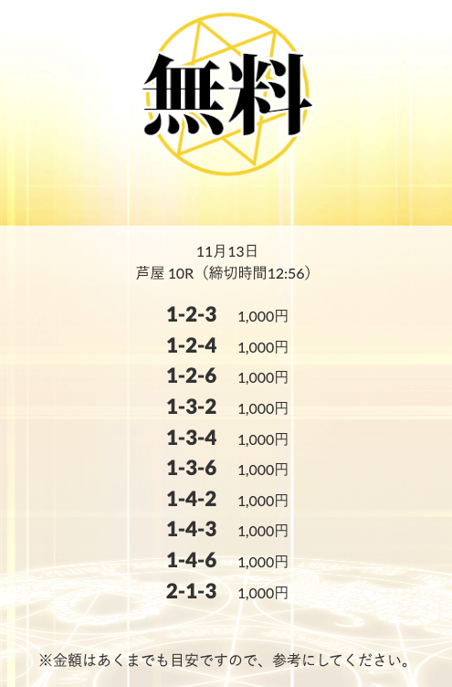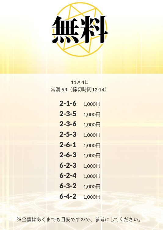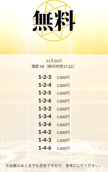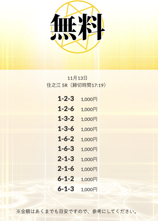 - 2025/11/26的中 無料予想で17,000円獲得2025/11/19的中 無料予想で14,800円獲得2025/11/18的中 無料予想で10,300円獲得2025/11/11的中 無料予想で17,700円獲得2025/11/09的中 無料予想で33,400円獲得2025/11/04的中 無料予想で22,900円獲得2025/11/02的中 無料予想で10,100円獲得2025/11/01的中 無料予想で12,900円獲得2025/10/28的中 無料予想で18,400円獲得2025/10/25的中 無料予想で20,600円獲得
