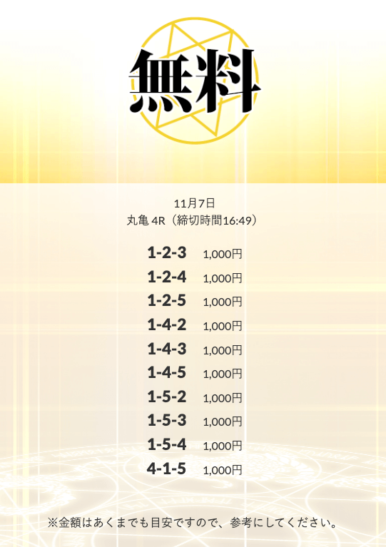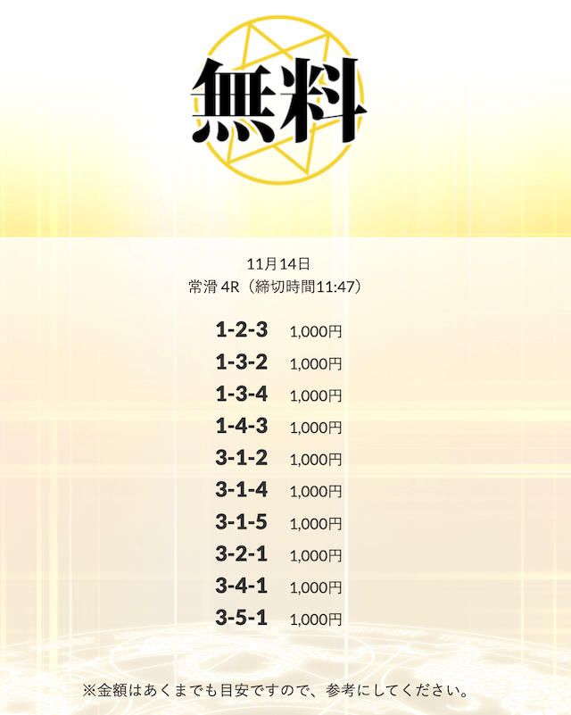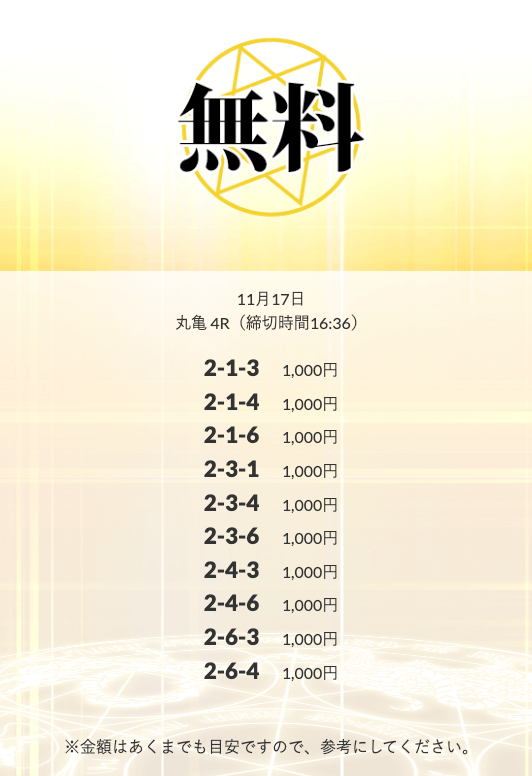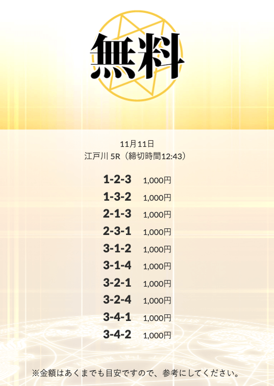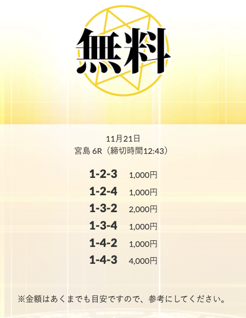 - 皇艇の無料情報は、有料情報と比べても遜色ないレベルだと思います。無料情報だけでも十分に価値があるので、まずは無料情報を試してみることをおすすめします。投稿日:2025/11/28