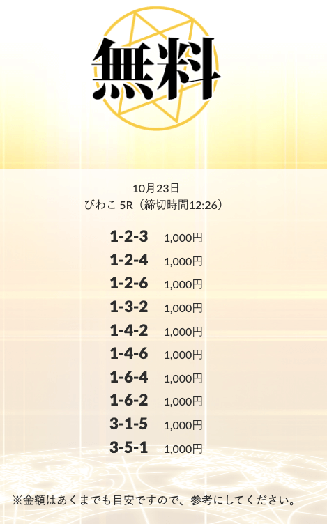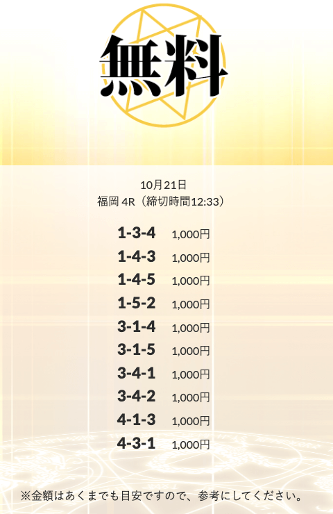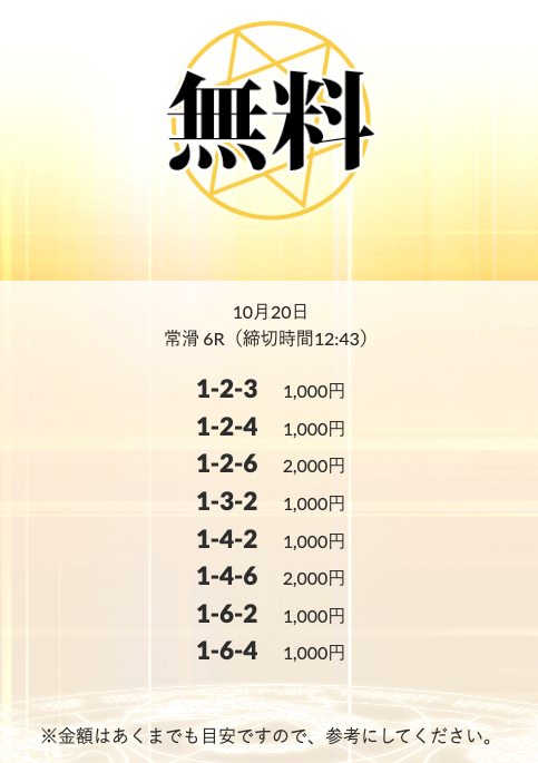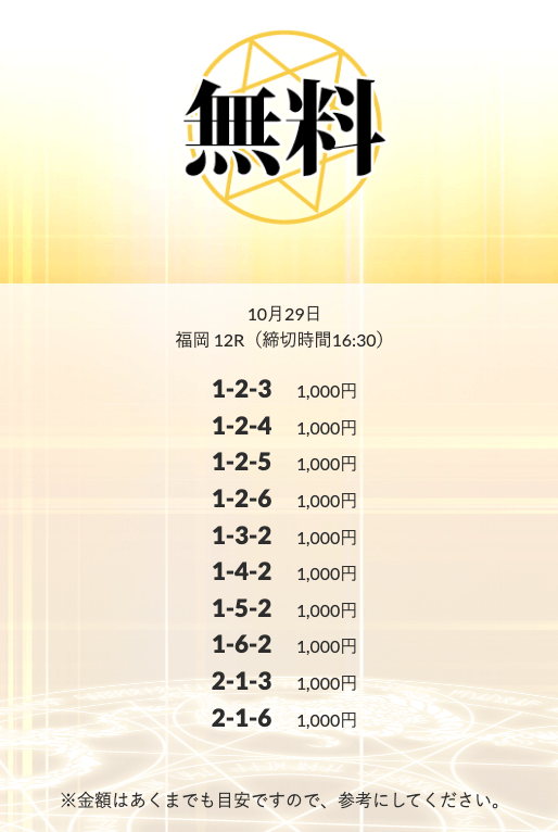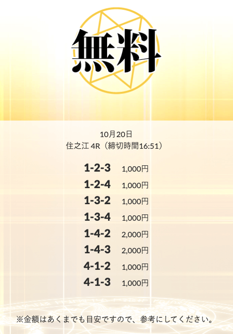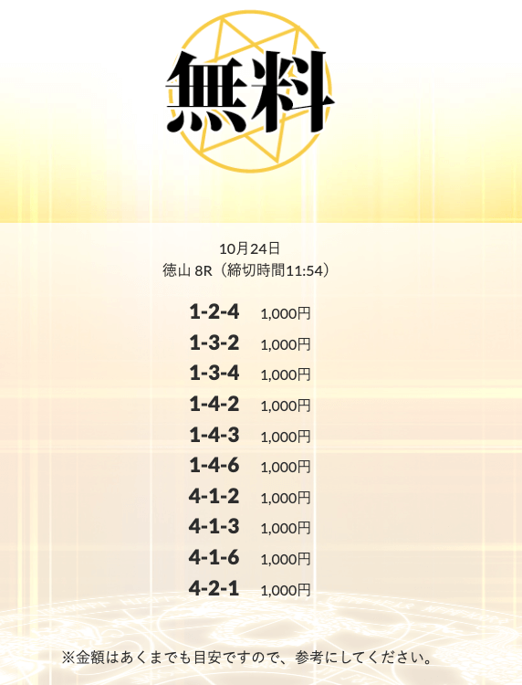 -  2025/10/24的中 無料予想で10,900円獲得2025/10/23的中 無料予想で11,900円獲得2025/10/22的中 無料予想で21,500円獲得2025/10/21的中 無料予想で28,800円獲得2025/10/20的中 無料予想で17,400円獲得2025/10/18的中 無料予想で19,300円獲得2025/10/17的中 無料予想で11,800円獲得2025/10/16的中 無料予想で13,800円獲得2025/10/14的中 無料予想で11,000円獲得2025/10/12的中 無料予想で23,300円獲得