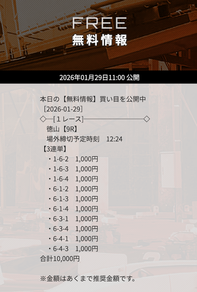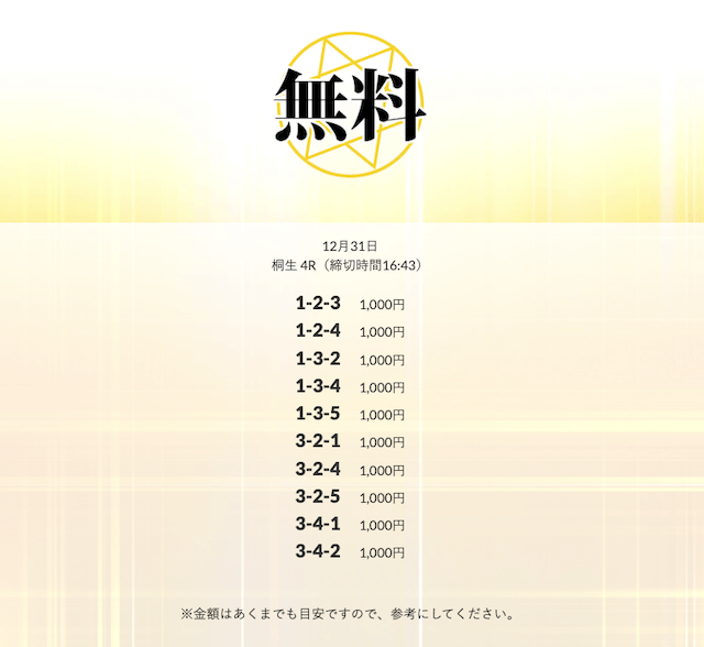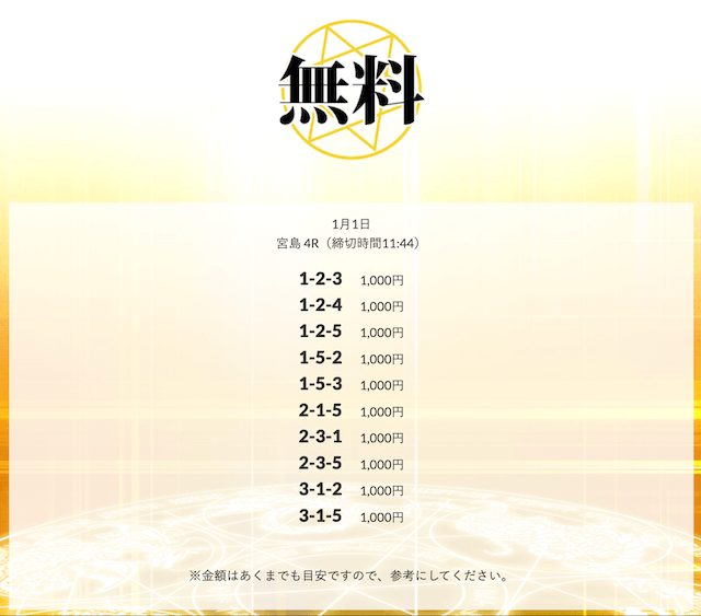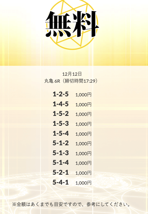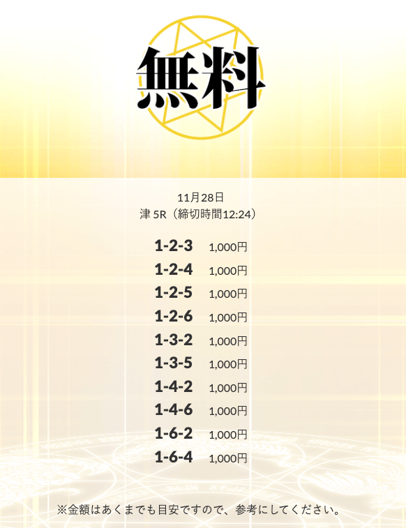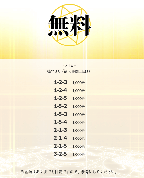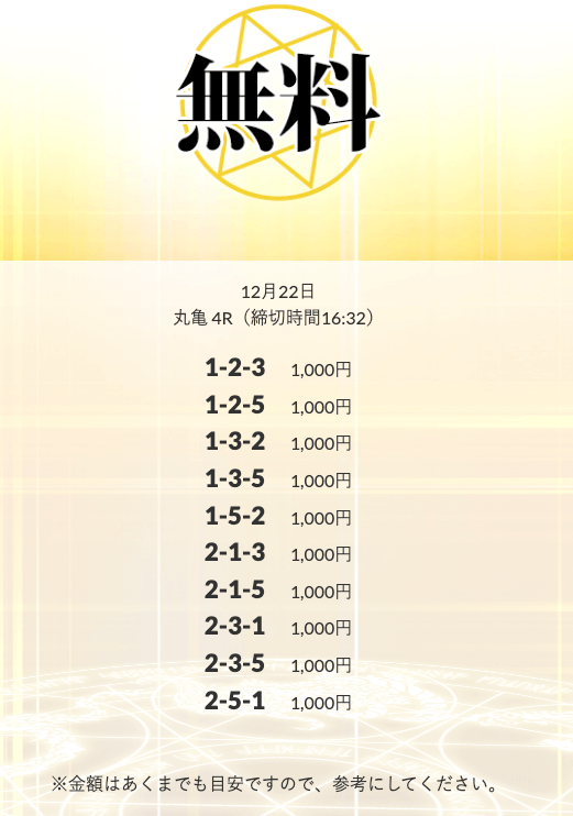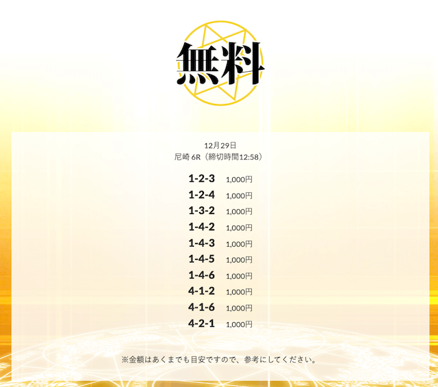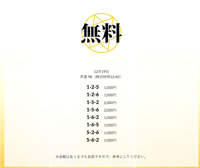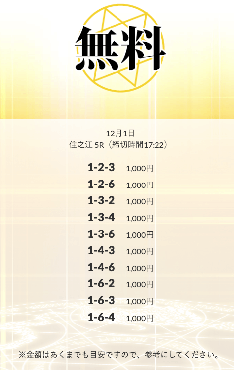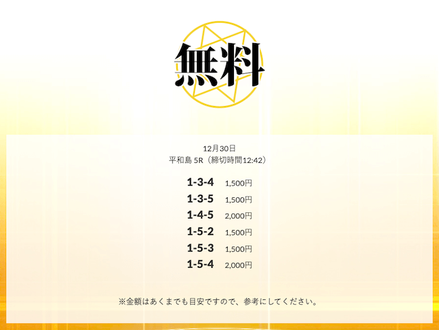 - 皇艇の無料情報は、有料情報と比べても遜色ないレベルだと思います。無料情報だけでも十分に価値があるので、まずは無料情報を試してみることをおすすめします。投稿日:2025/11/28