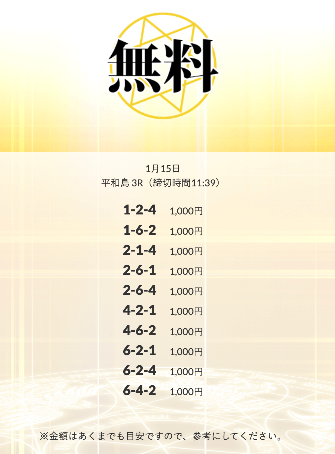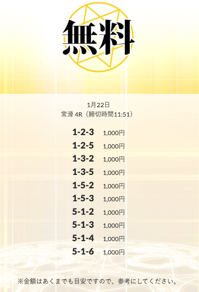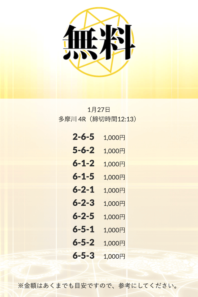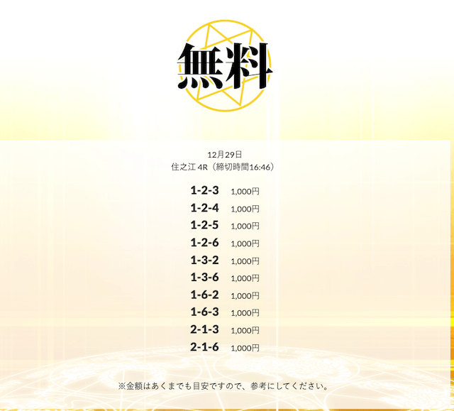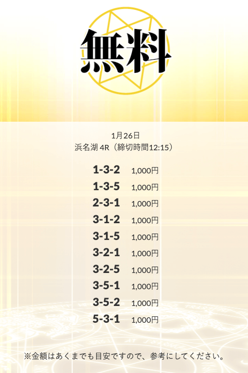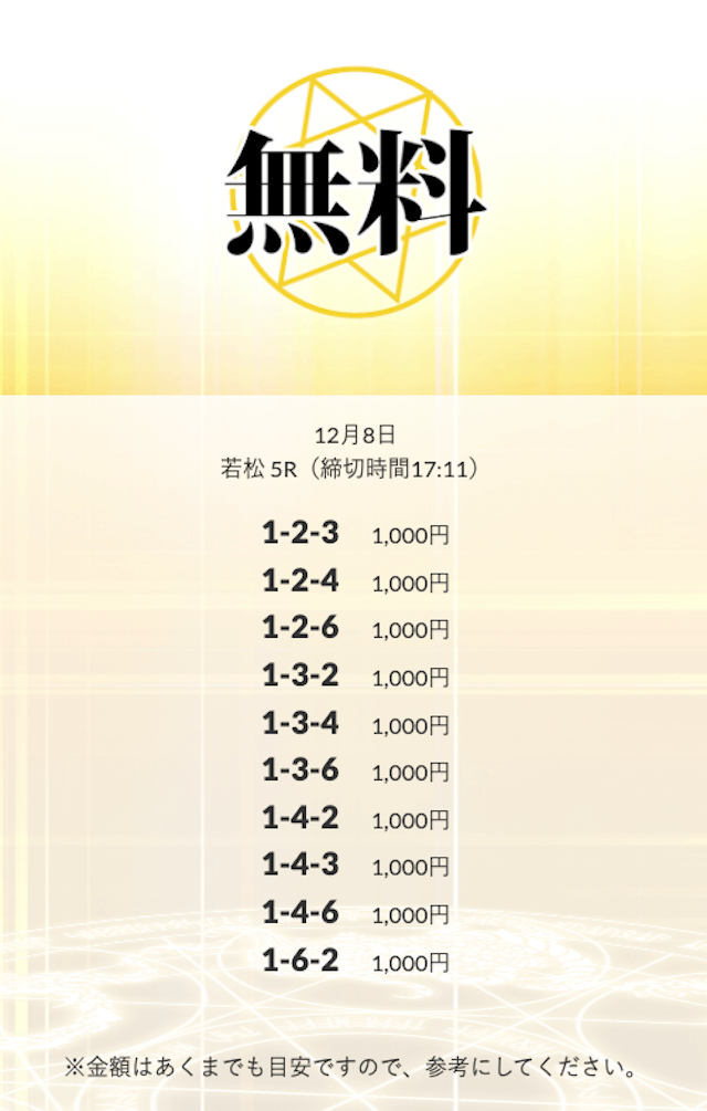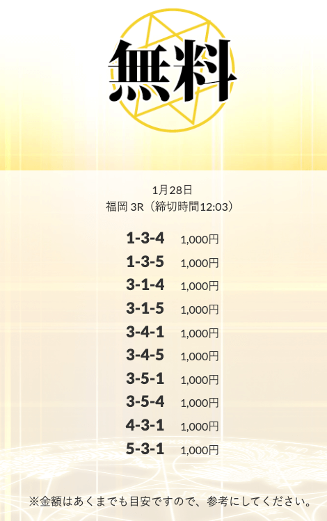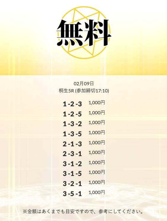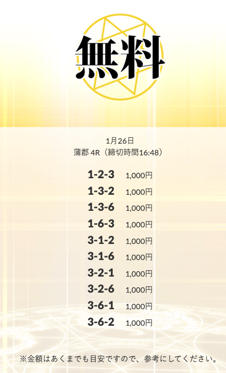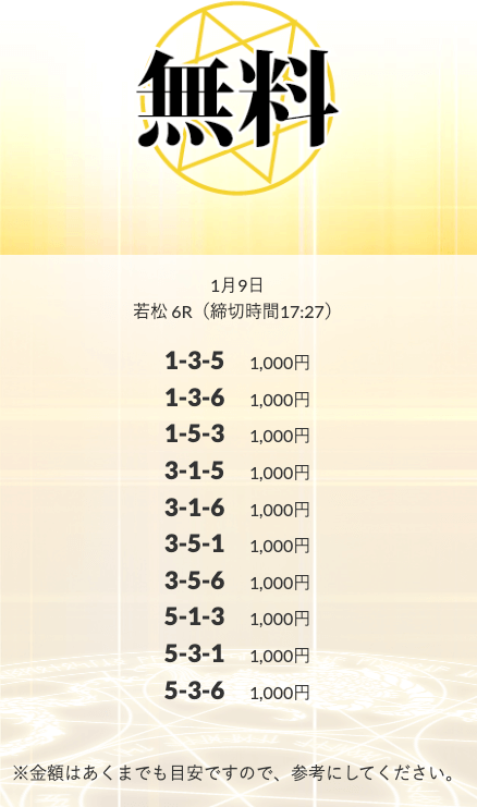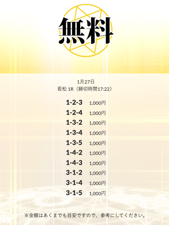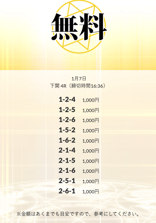 初回限定の「八咫烏」は、不的中だったら情報料金が丸ごと返ってくる保障付きらしい。つまり、リスクで見りゃ無料予想と変わんねぇな。逆に「VIPプラン」は情報料金に対しての旨みが見合ってねぇ⋯。資金効率を踏まえると「剣」「青龍」「朱雀」…このあたりを狙うのが賢いな。