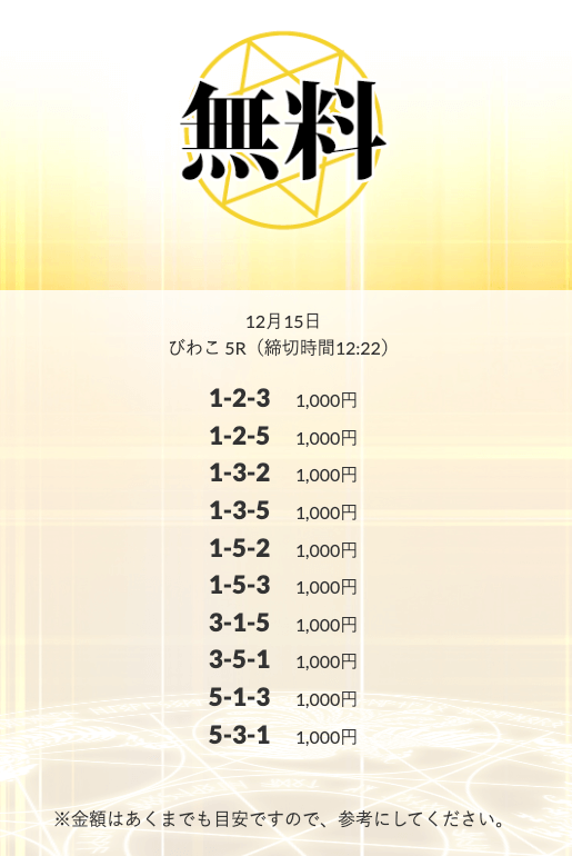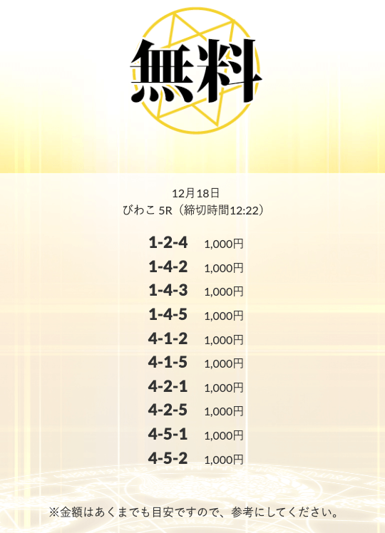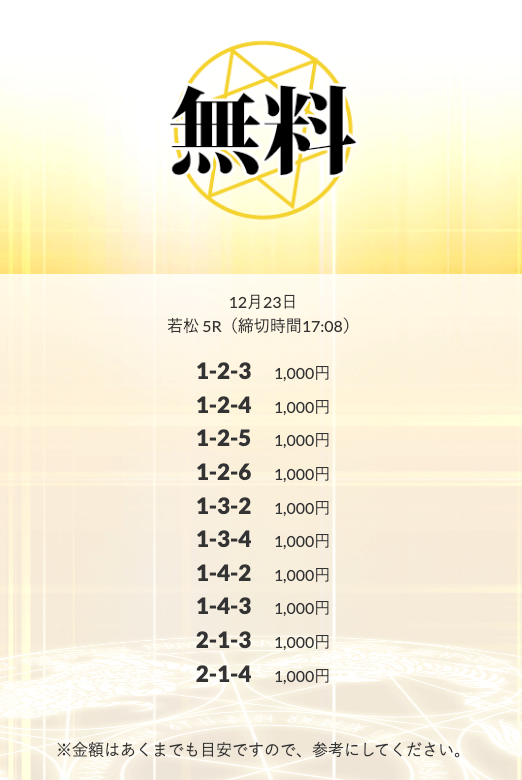 いいねだけの人財布の中がスカスカで焦ってたとき、無料予想でポンッと当たって2万円。給料日前の俺を助けてくれた。投稿日:2025/12/25
